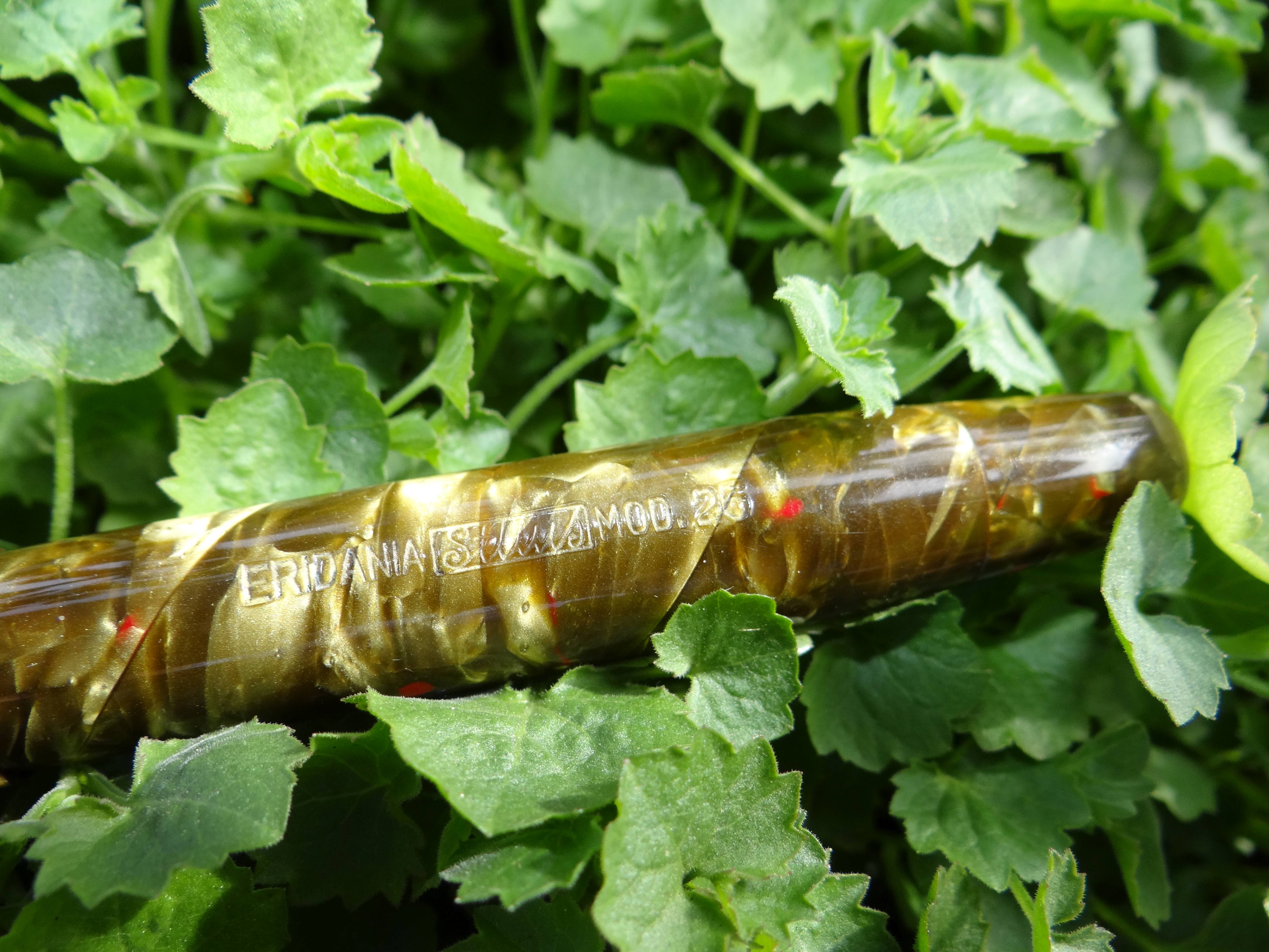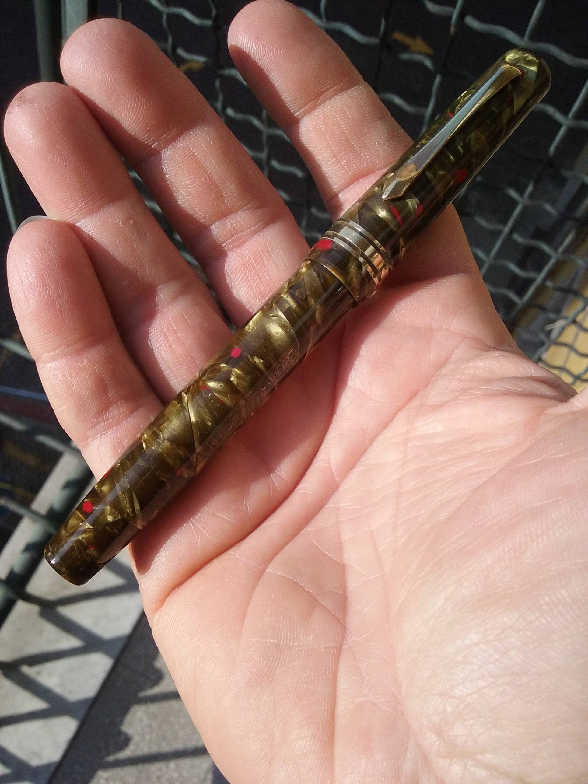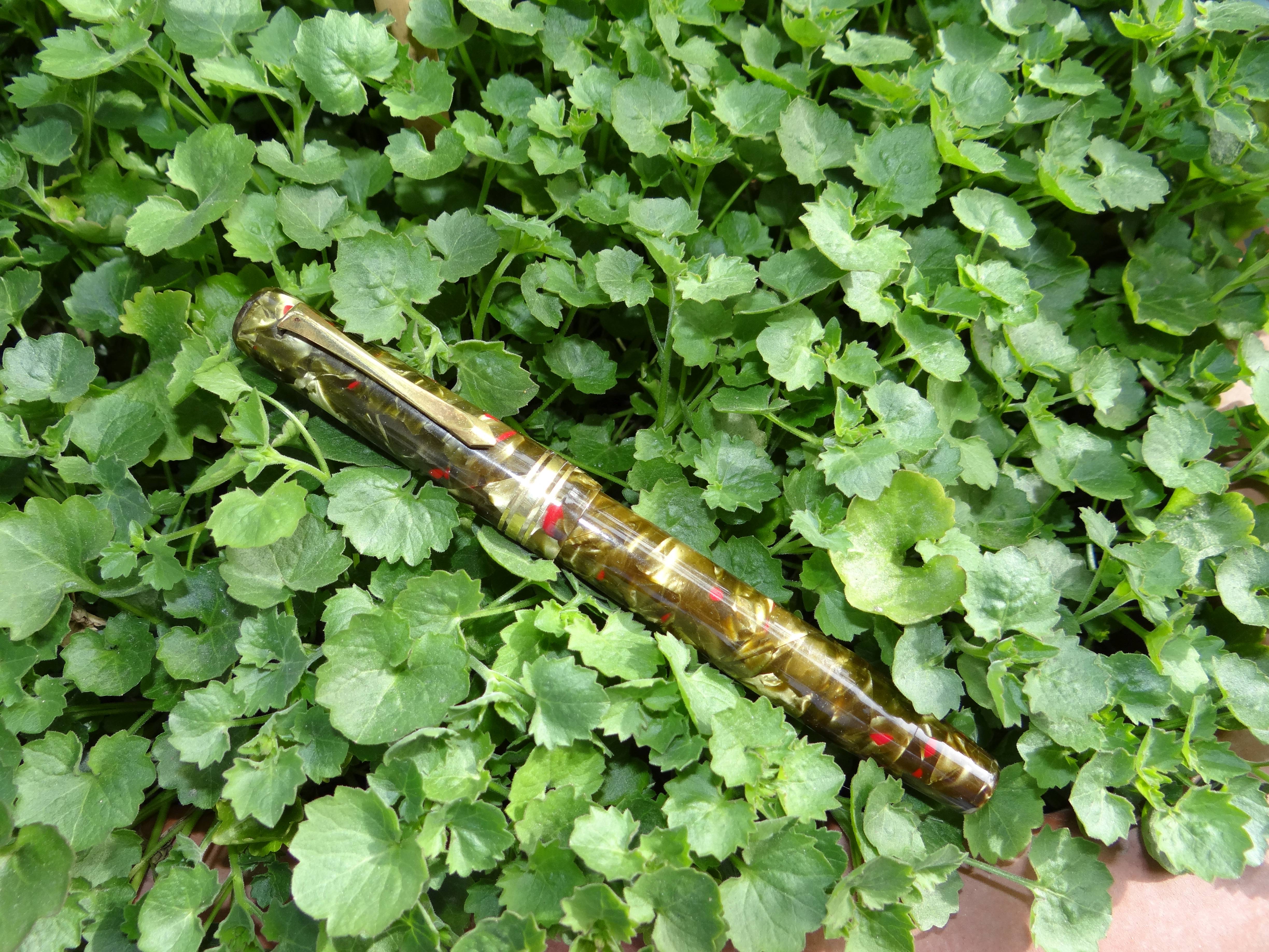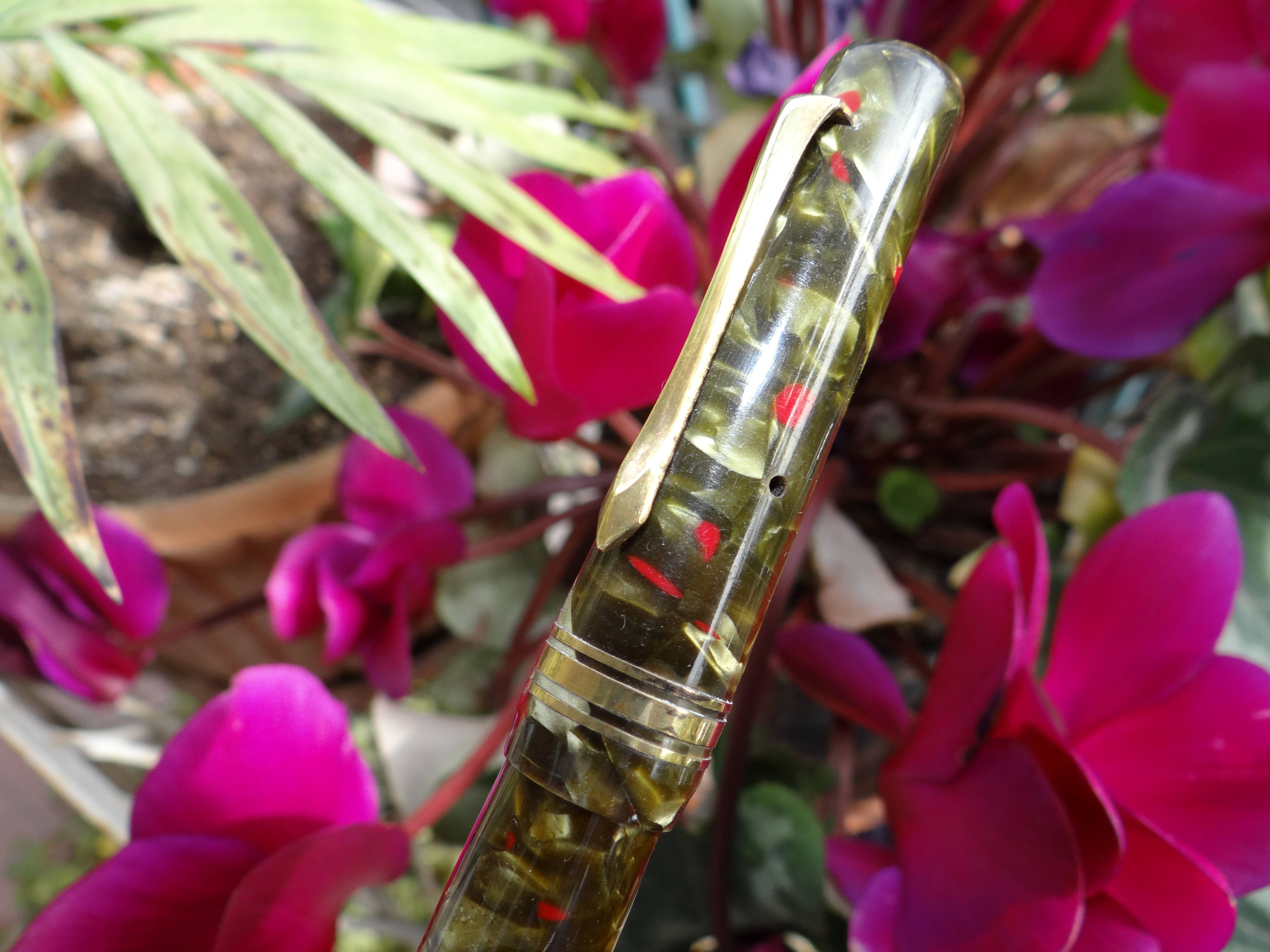 La penna è costruita con una magnifica celluloide verde oro cangiante con piccoli inserti rossi, che stupisce per la capacità di catturare la luce con un effetto madreperlaceo fuori del comune.