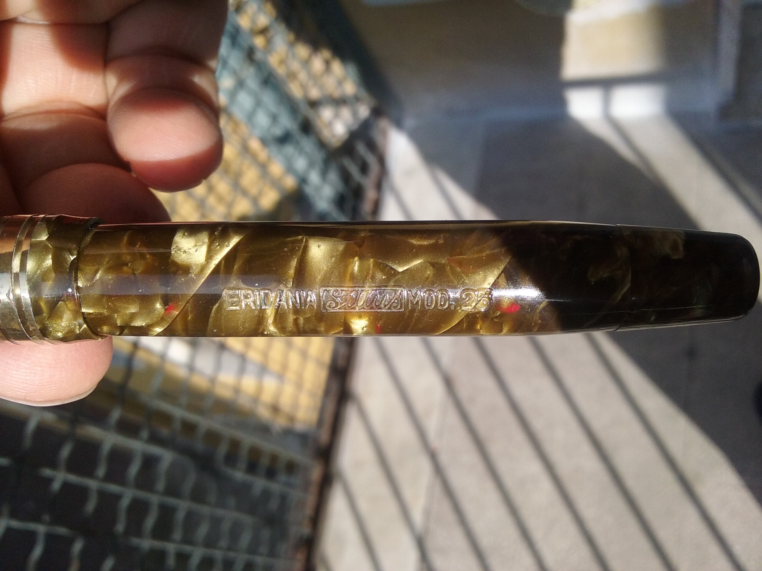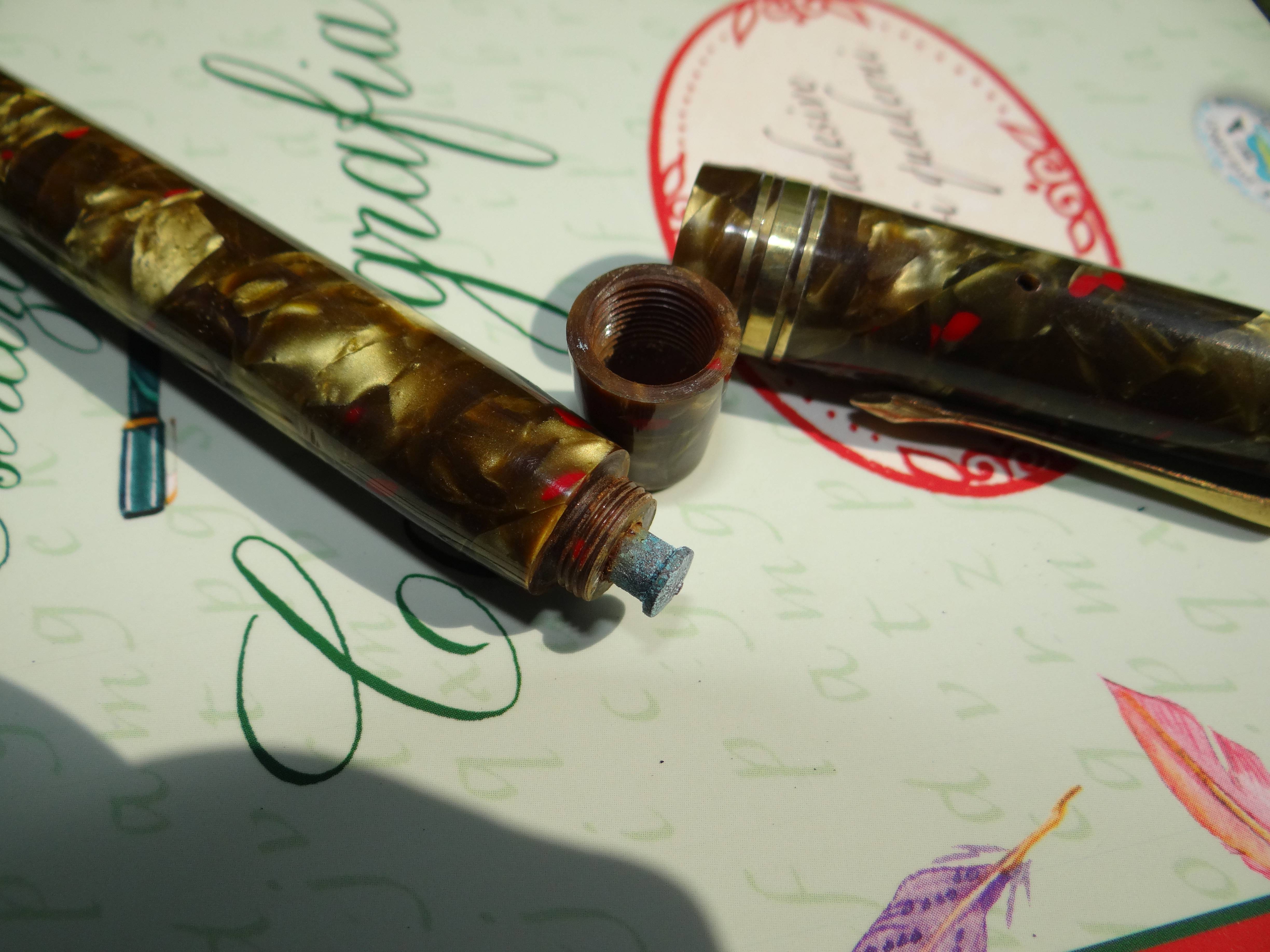 Per provare ad azzardare una datazione, a fronte delle considerazioni sulla comparsa "tarda" del sistema della celluloide in fogli, potrebbe tornarci utile l'iscrizione sul pennino: se fosse il suo (cosa comunque non sicura) e avesse oltre al titolo espresso solo in Carati (intravedo un 14...) daterebbe la penna a prima del 1934-5; se avesse anche il rombo con i millesimi all'interno (585), invece, collocherebbe la produzione a dopo il 1935 (cosa che mi sembrerebbe plausibile, vista la lavorazione).