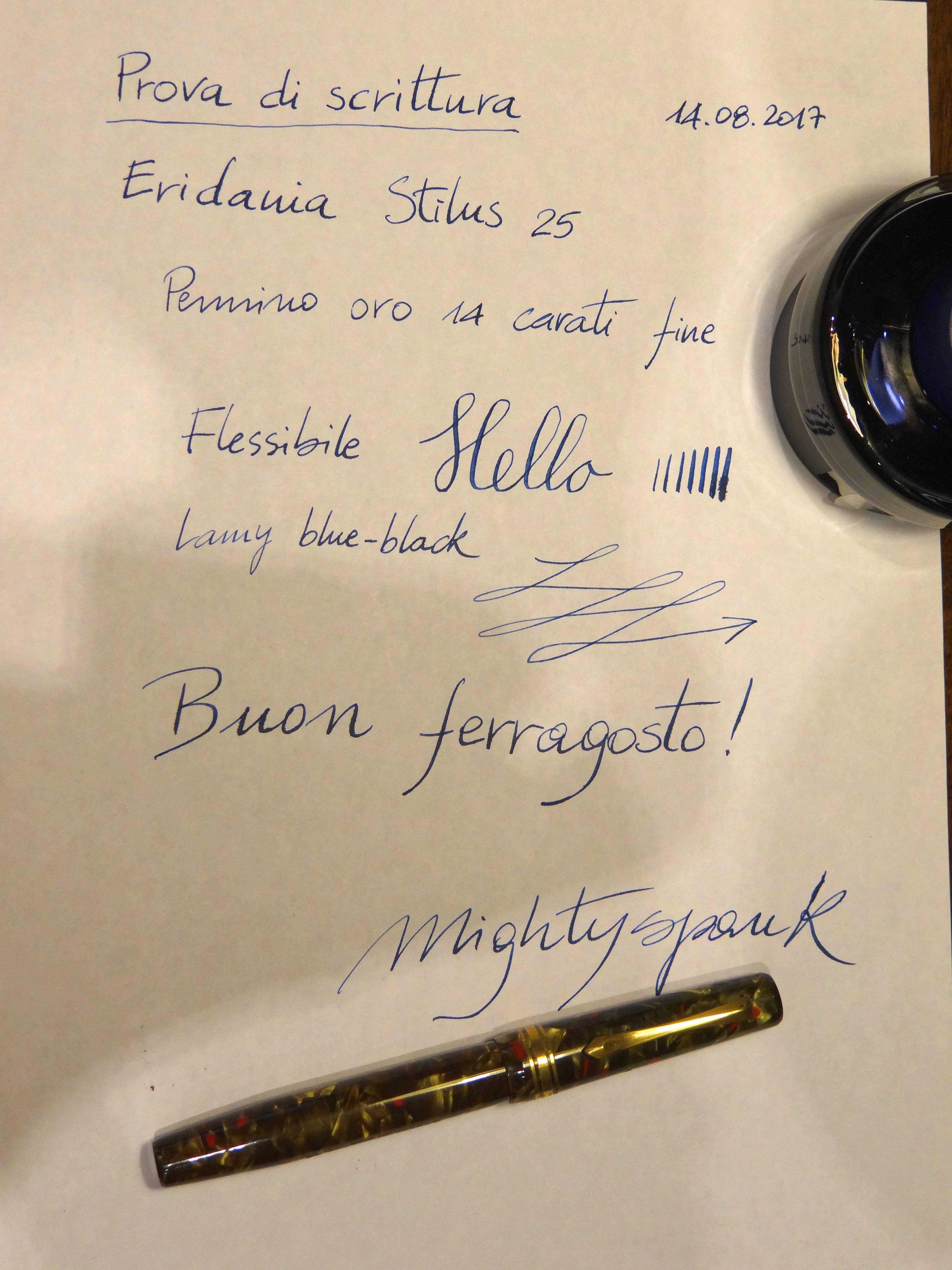 Purtroppo il pennino, originale, è un po' fuori fase e il pulsante di fondo mostra segni di ossidazione. Alla prova di scrittura dimostra una notevole, godibile flessibilità.