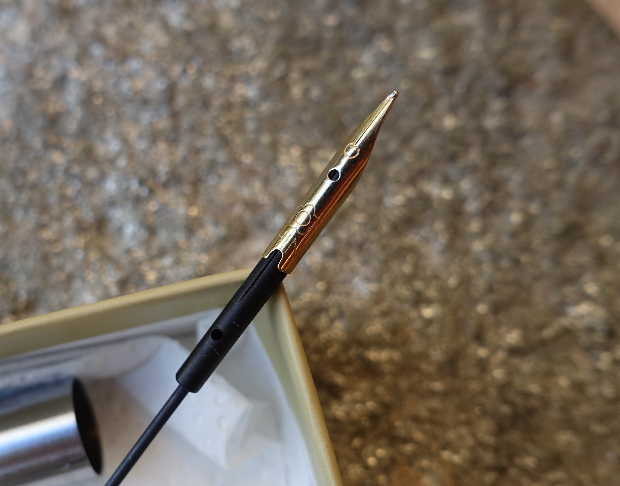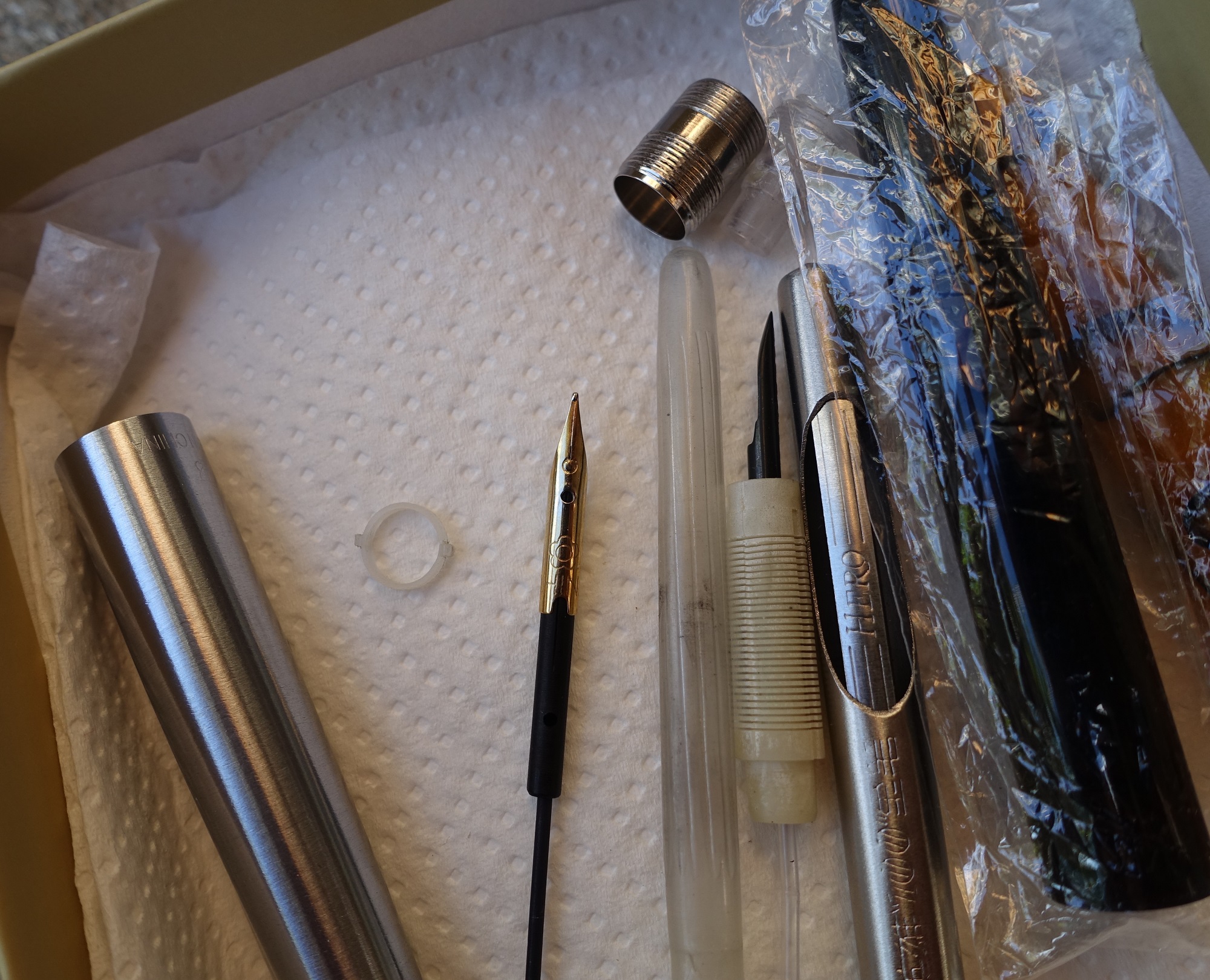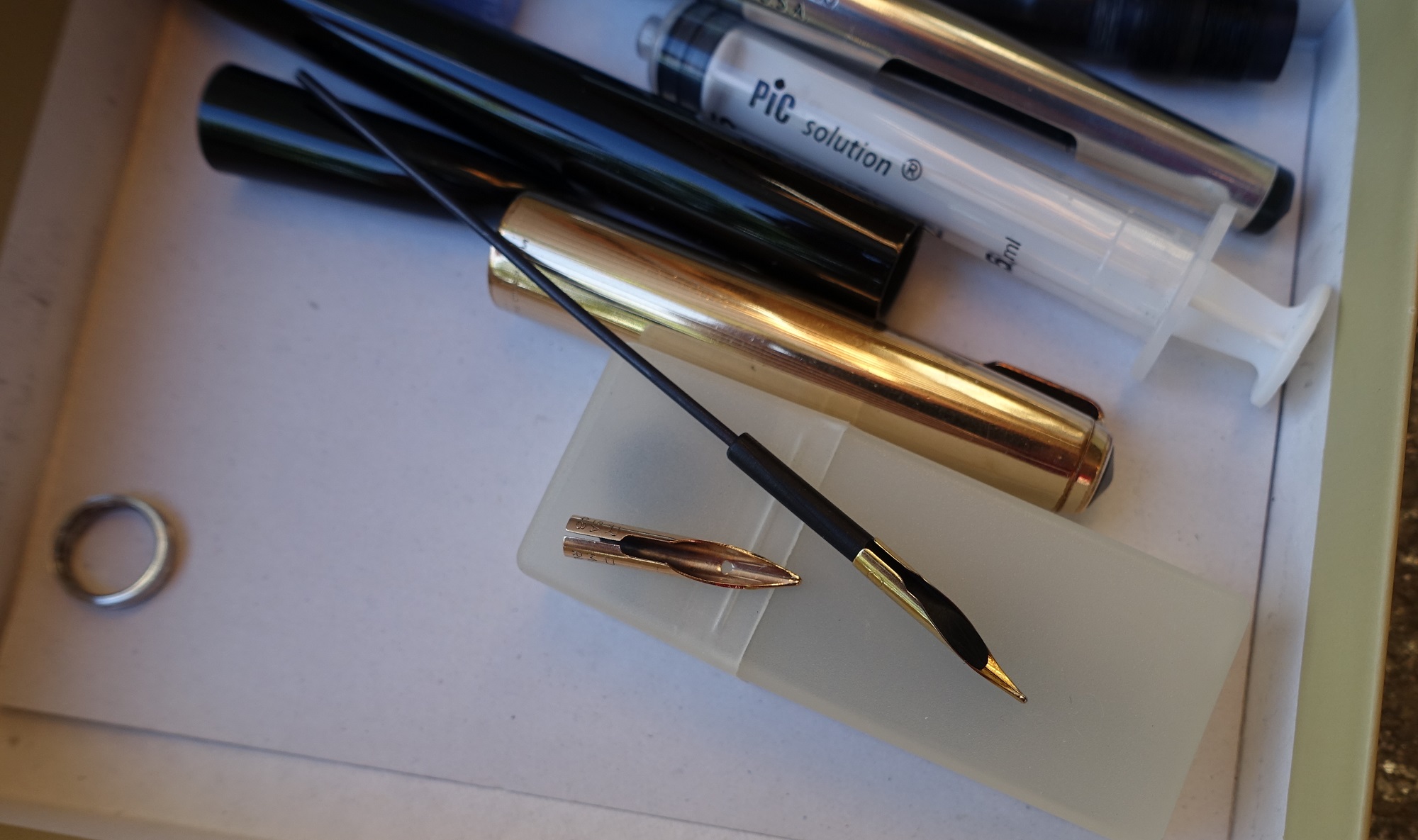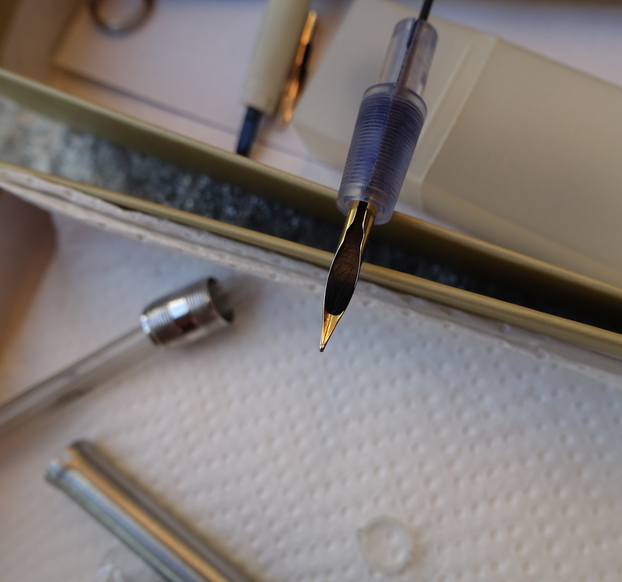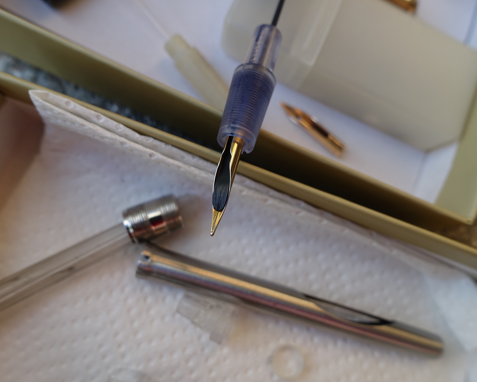 Stupore!!! nell'attesa di prendere una decisione mi è sorto un dilemma, se prendo un pennino e poi la penna ha altri problemi, spreco tempo e denaro, così mi sono armato di volontà e pazienza ed ho iniziato a smontarla, pulita per bene in acqua , controllato tutti i pezzi, ma in sostanza non mi bastava, ho richiamato alla memoria gli anni 50, scolaro alle elementari quando i pennini rotti non si contavano neppure e sopratutto a volte bisognava aggiustarli per poter finire il compito.