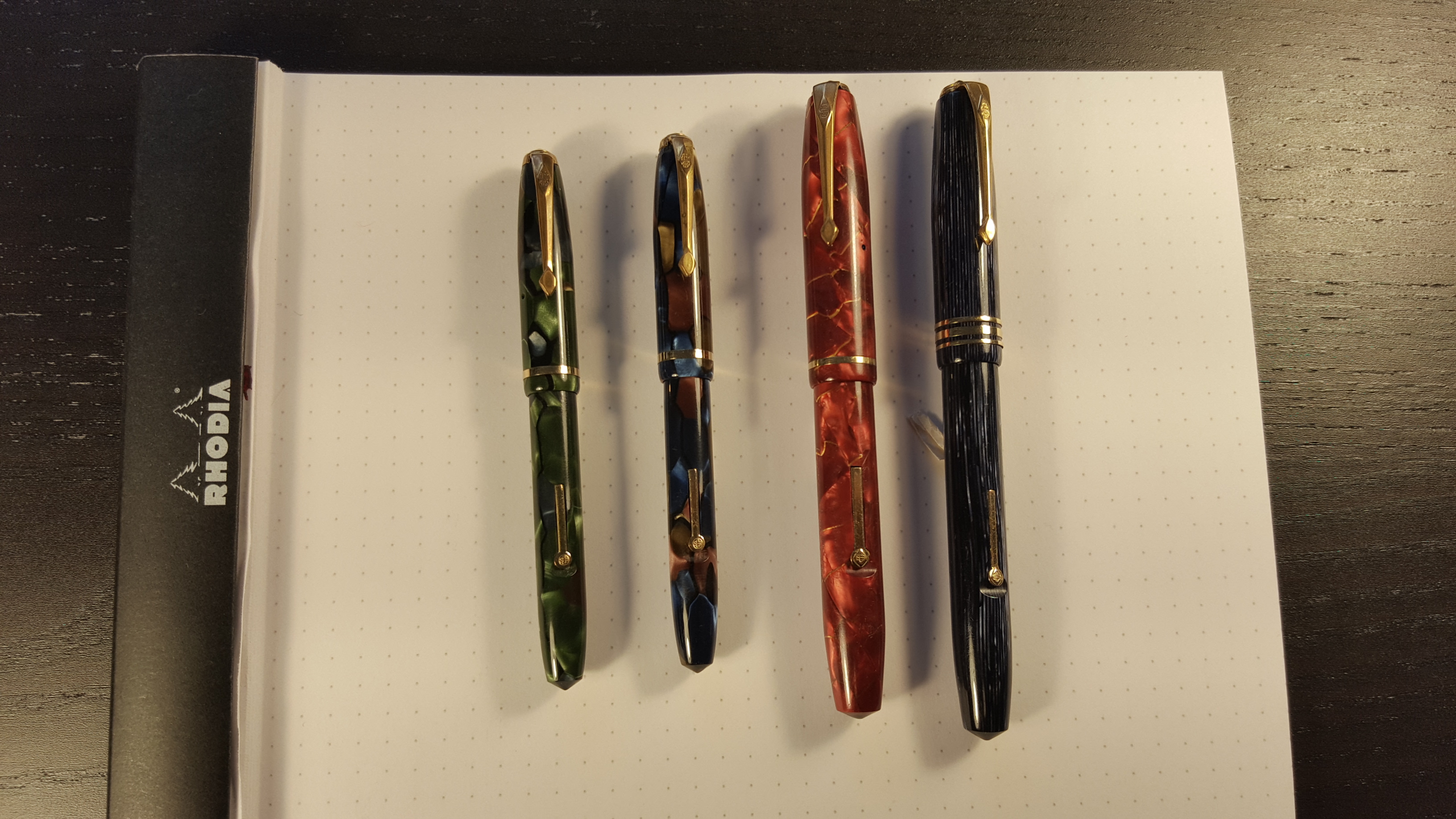 Le mie 4 penne di formaggio ( :mrgreen: ), da sinistra a destra: due Conway Stewart 550 "Dinkie" (fine anni 50), una Burnham 44 ed una Burnham B49 (entrambe credo fine anni 40, inizio 50)