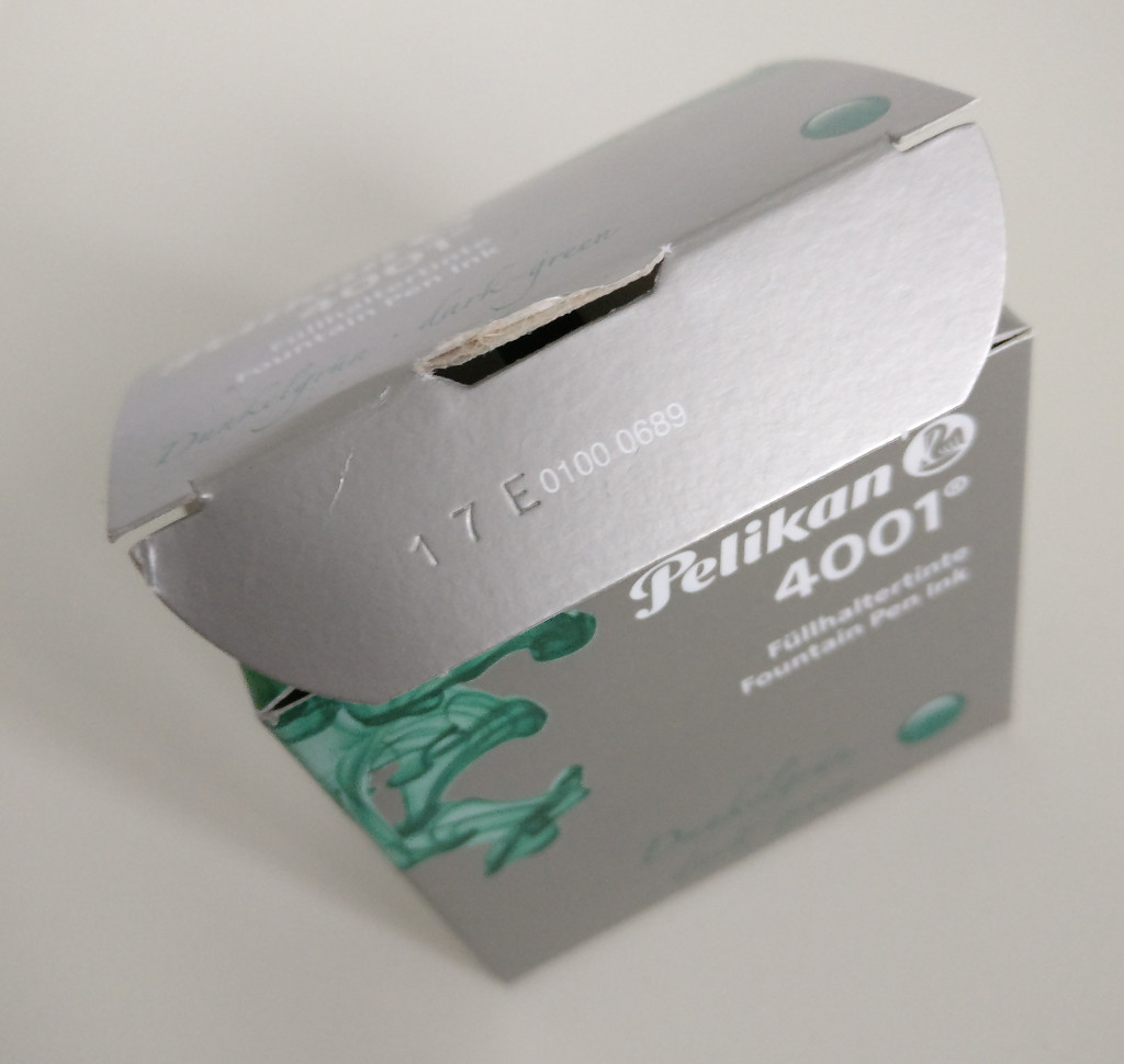 Oggi ho comperato tre flaconi di inchiostri Pelikan 4001. Ispezionando le scatole ho notato che nella linguetta della chiusura e'