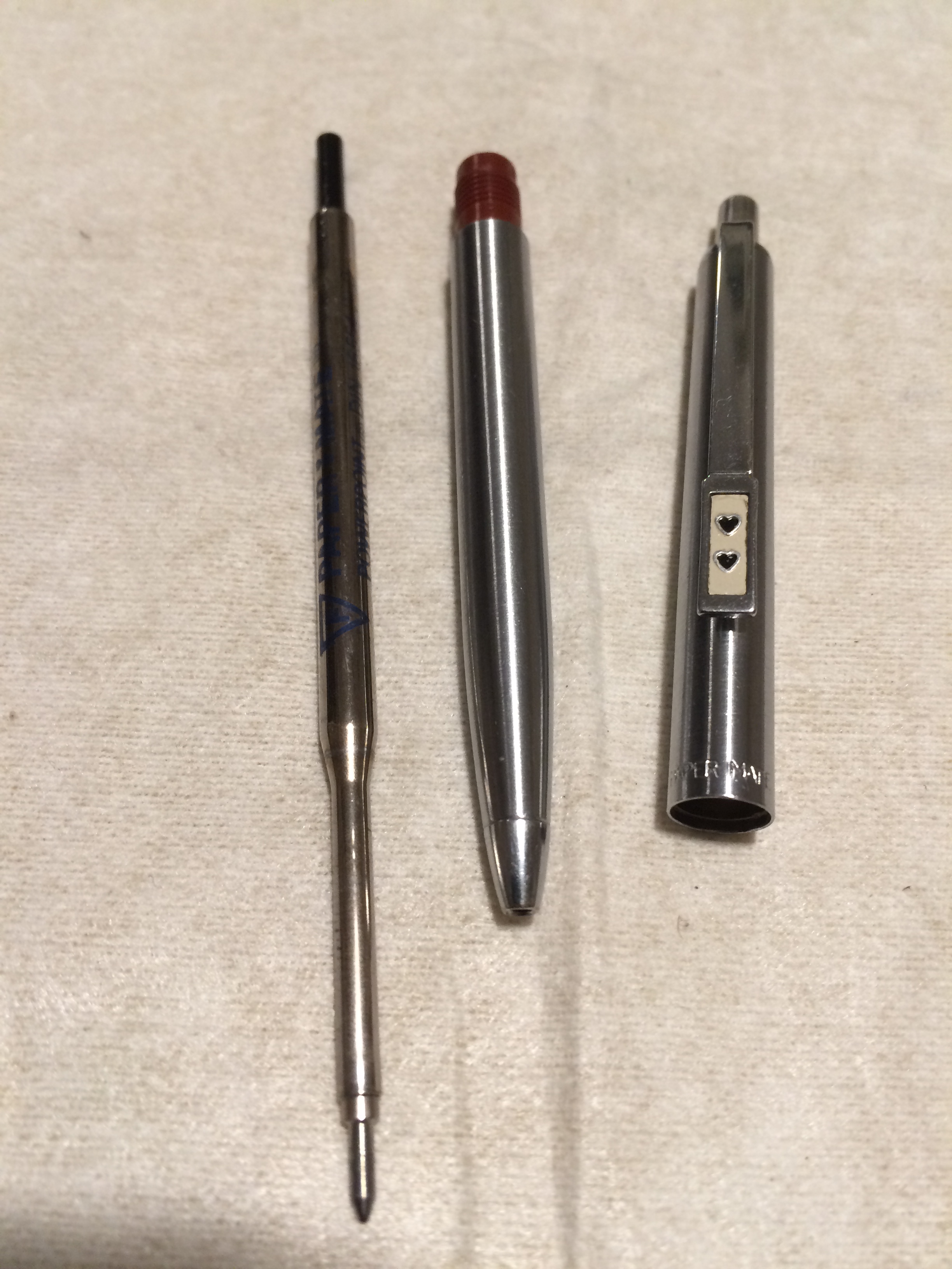 Nella foto, il mitico refill a pompa (la parte nera va pressata per aumentare la pressione interna che consente alla pena di scrivere anche a testa in giù).