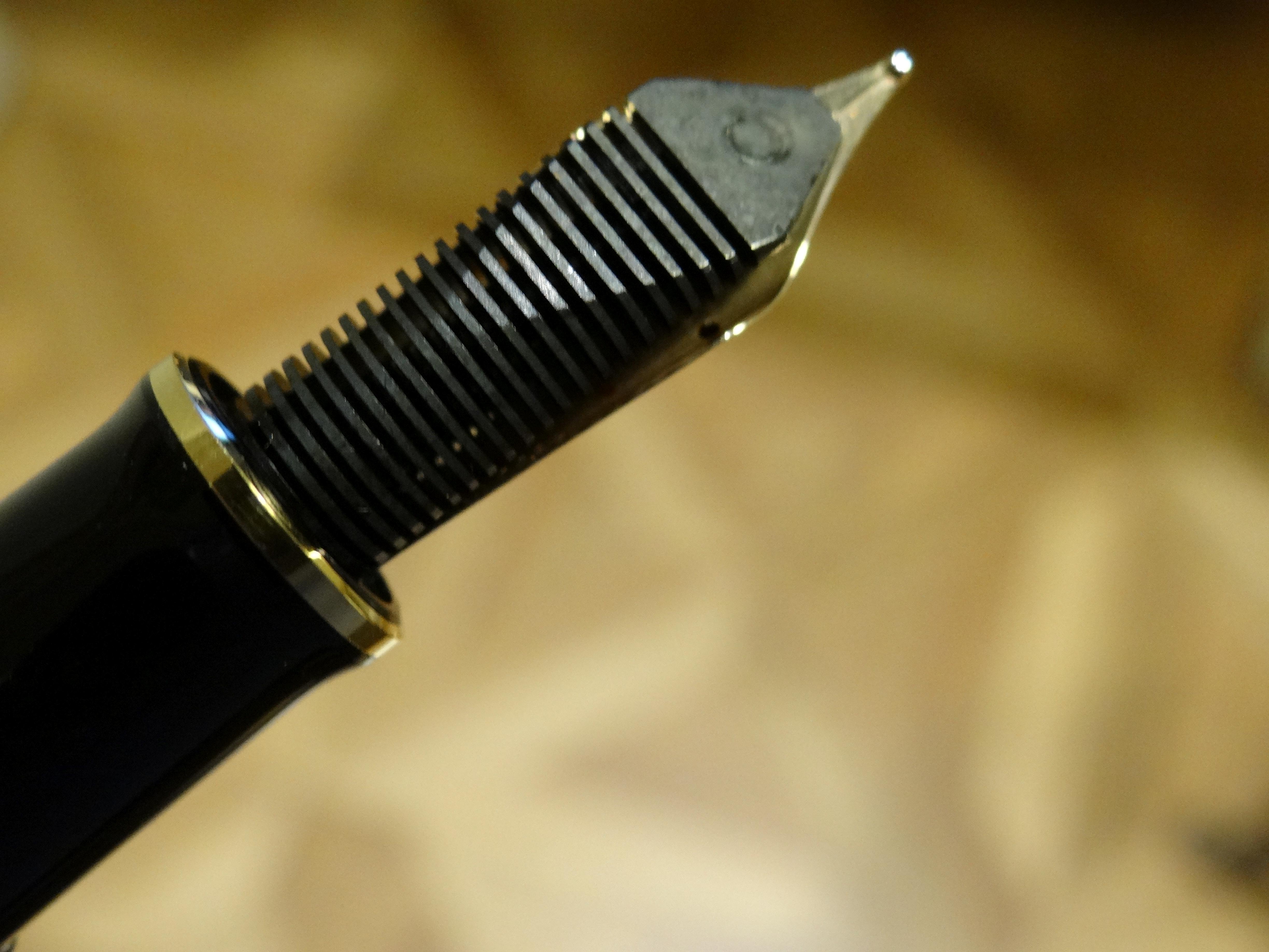 Ma veniamo alla scrittura. Il gigantesco pennino in oro 750/1000 è finemente decorato e si lascia ammirare in tutta la sua bellezza.