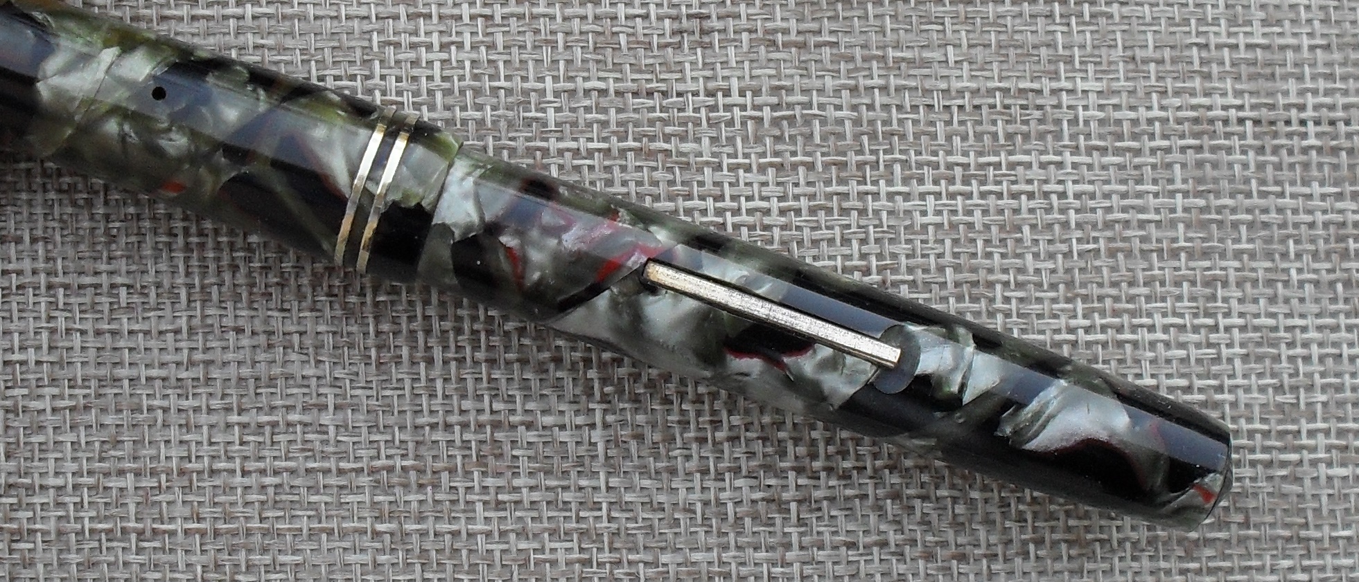 Si tratta, appunto, di una Summit “Sentinel” in celluloide marmorizzata a spirale verde chiaro e nero, con venature rosse, in condizioni originali.