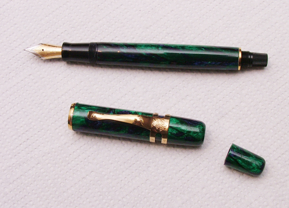 Celluloide di un bel colore verde elettrico, con chiazze blu e nere, pennino bicolore, non in oro, forse è stato sostituito, sarà per questo va che è una meraviglia.