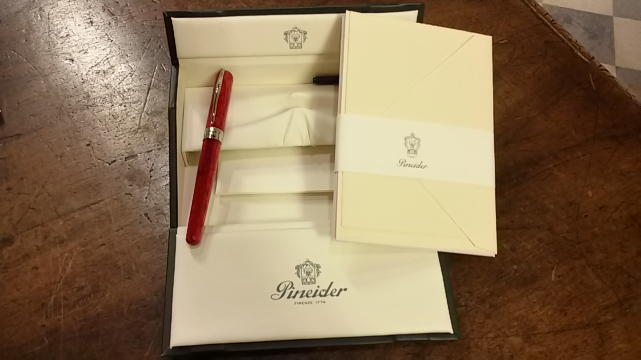 oggi vi presento la Pineider Avatar di cui ne avrei ignorato l' esistenza se non mi fosse stata recentemente regalata. È una penna di dimensioni generose, attorno ai 14 centimetri in resina rossa effetto pietra, la carica è a cartuccia o converter. Il pennino è in acciaio, il mio, di misura media è stata una piacevolissima sorpresa per la sua scorrevolezza e precisione. Il flusso è sempre ben calibrato e anche dopo giorni di inutilizzo la penna riparte senza alcun problema. Il pennino medio tende leggermente verso il fine. La clip è molto bella, fissata al cappuccio da un perno passante; la veretta riporta il nome Pineider e lo skyline di Firenze. Questa veretta contiene un magnete con cui si chiude comodamente la penna senza dover avvitare e l' ho apprezzato molto. Al contrario non mi piace molto l' incisione che appare sulla stessa veretta, che è anche molto sottile e trasmette un senso di "lavoro fatto in economia". A mio parere questo è l' unico punto debole della penna che trovo estremamente bella nel suo colore e nella comodità durante l' uso. La sezione è in metallo ma le dita non scivolano e in fin dei conti la apprezzo.