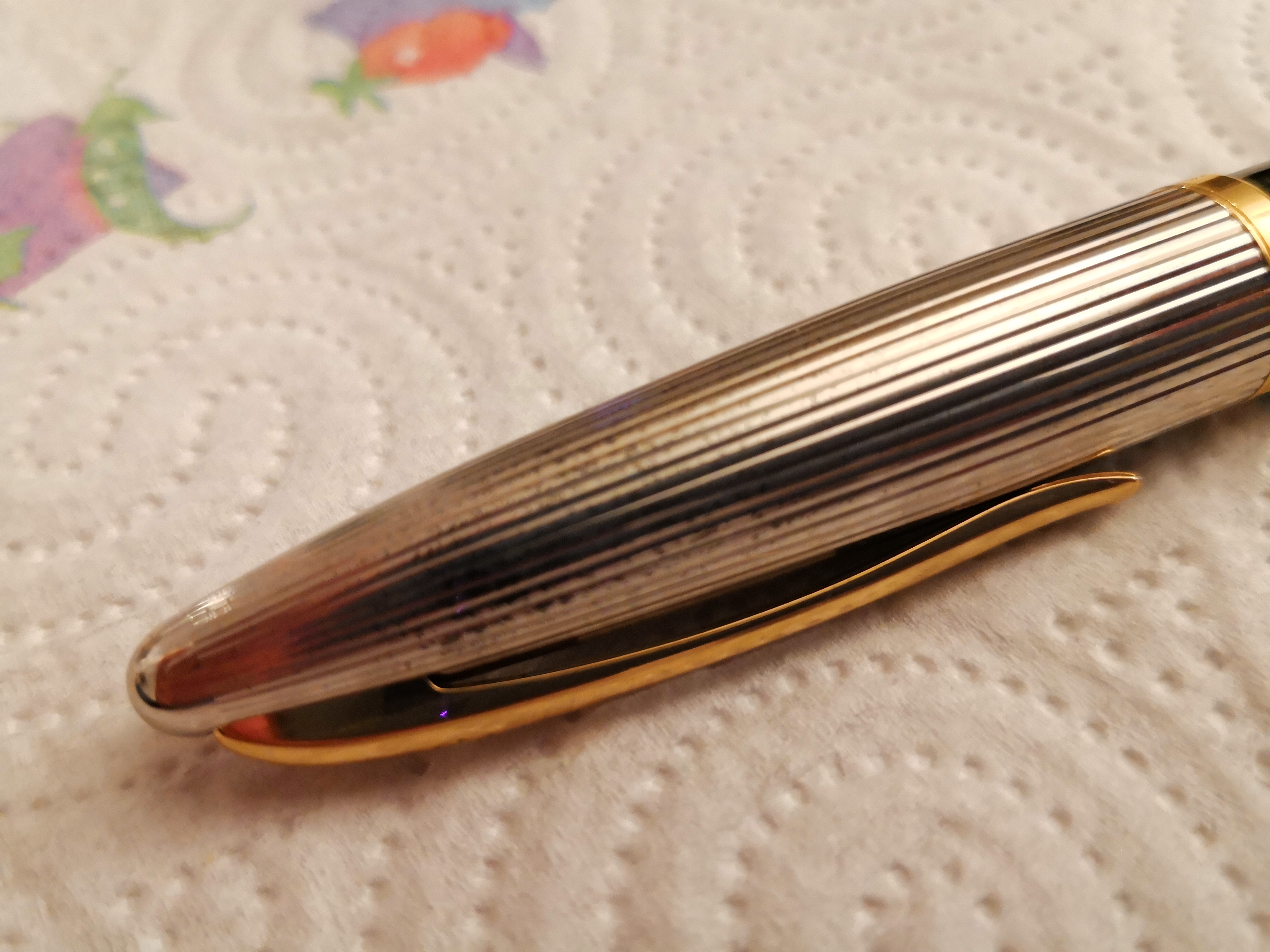 Lo so sto diventando infestante :wtf: .... Chiedo venia. Questa Waterman la comperai nuova una decina d'anni fa e usata per un po' poi è rimasta a riposo nel 'cassetto delle stilografiche'. Oggi l'ho inchiostrata per usarla e mi sono accorto di alcuni puntini scuri sul cappuccio. Come posso fare per rimuoverli se possibile? Ossidazione? Ho strofina con il polpastrello e non vengono via, non l'ho usata molto e non credo sia sporco. Grazie.