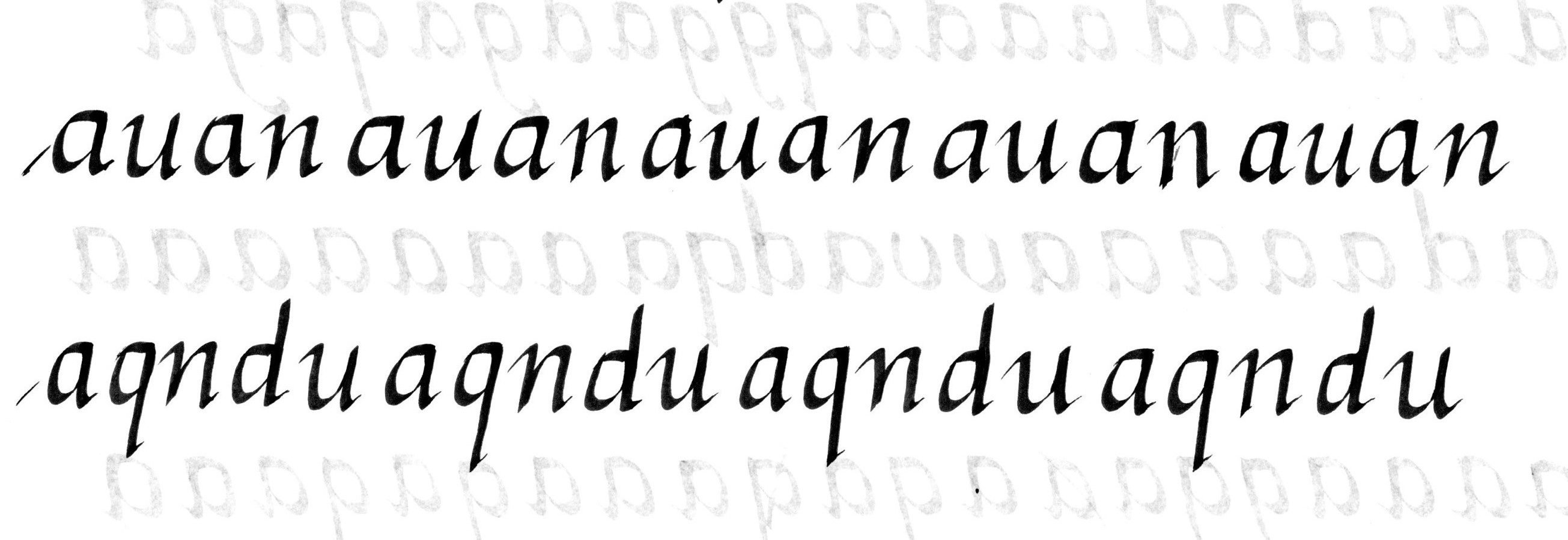 Nel "quaderno del cancelleresca" la "a" viene proposta dopo altri gruppi di lettere (nmruypbhk) e trovarmi così in difficoltà mi ha inizialmente spiazzata, visto che mi sentivo vagamente sicura sulle lettere che ti ho nominato (sottolineo vagamente, più che altro in quelle ottengo risultati più uniformi).