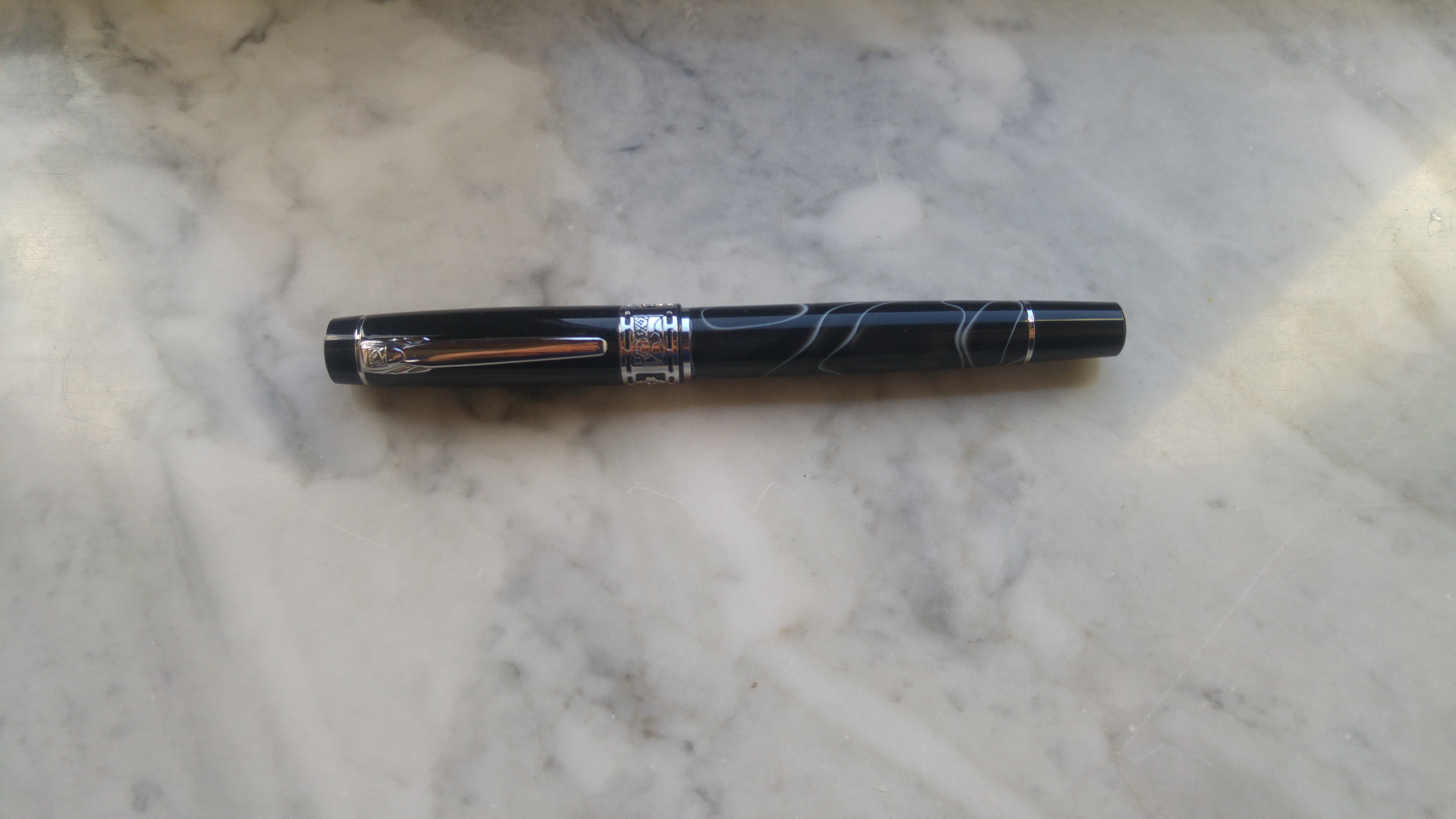 La Picasso 925 che ho acquistato con pennino M sono riuscita a trovarla a 27€ inclusa spedizione, ed è il modello con il pennino completamente scoperto. Io ho preso la “Nero Swirl”, che si caratterizza per un bel colore nero lucido con un motivo bianco sul fusto dai gradevoli riflessi grigiastri.
