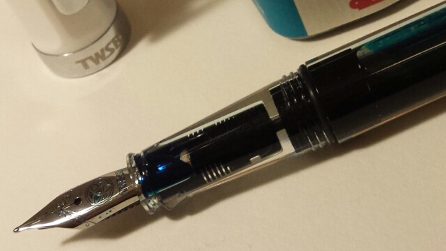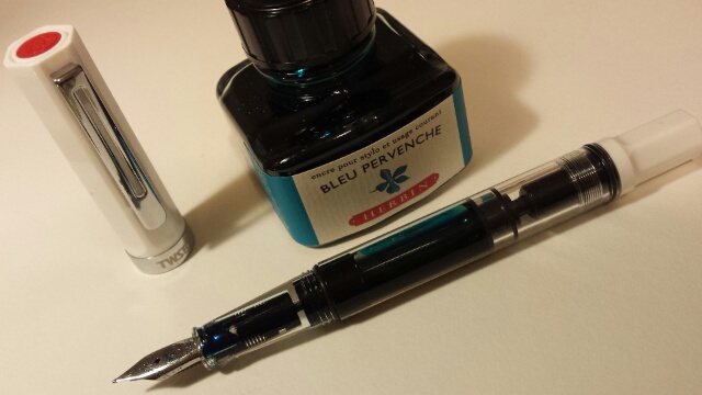 In ambiente domestico uso una stilografica, la Twsbi Eco, caricata con un inchiostro Herbin turchese. La sua scorrevolezza è meravigliosa. Il flusso di inchiostro abbondante, opulento, una beatitudine. Sfioro la carta e lascio un segno. L'inchiostro vivace è un azzurro turchese con note di verde, l'immensità del cielo sereno nelle mattine d'estate, il calore delle note verdi a rallegrare un blu che in altri contesti annienta. La penna Twsbi Eco con cappuccio esagonale bianco ha un corpo trasparente che mette in bella vista l'inchiostro, ondeggiante al suo interno come le onde del mare. Una favola.