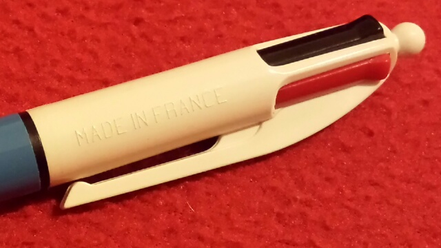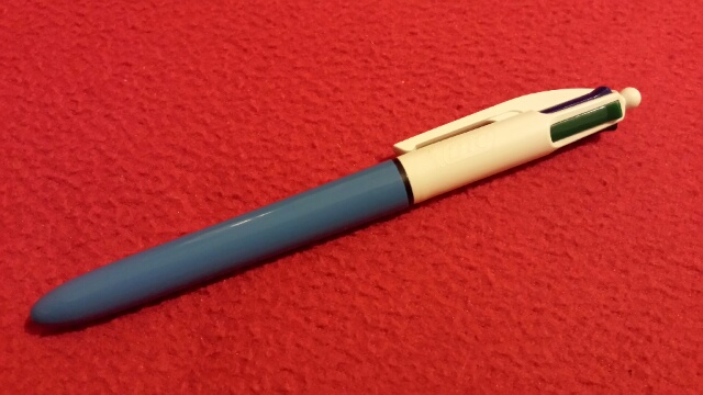 In ambiente lavorativo questo importante godimento mi è impedito. Devo celare questa passione. In tal senso ritorna estremamente utile il foglio piegato a quarto, piccolo, immediato, da tenere nel taschino senza deformare la tasca dei pantaloni. E devo utilizzare una penna sferografica, immediata nell'uso (prima o poi però mi acquisterò una capless della Pilot) e possibilmente con più colori, che mi permettono di corrispondere l'umore del momento o l'importanza che attribuisco all'appunto. La scelta cade di necessità sulla regina indiscussa delle multipen, la Bic 4colours. Meccanismo a scatto del primo modello (pomello sferico e non bucato), fusto azzurro e però caricata con i refill del modello crystal che, per chi non lo sapesse, sono estremamente brillanti e scorrevoli (ovviamente nulla rispetto a una stilografica, infatti scriverci è comunque 'na mezza tortura...).