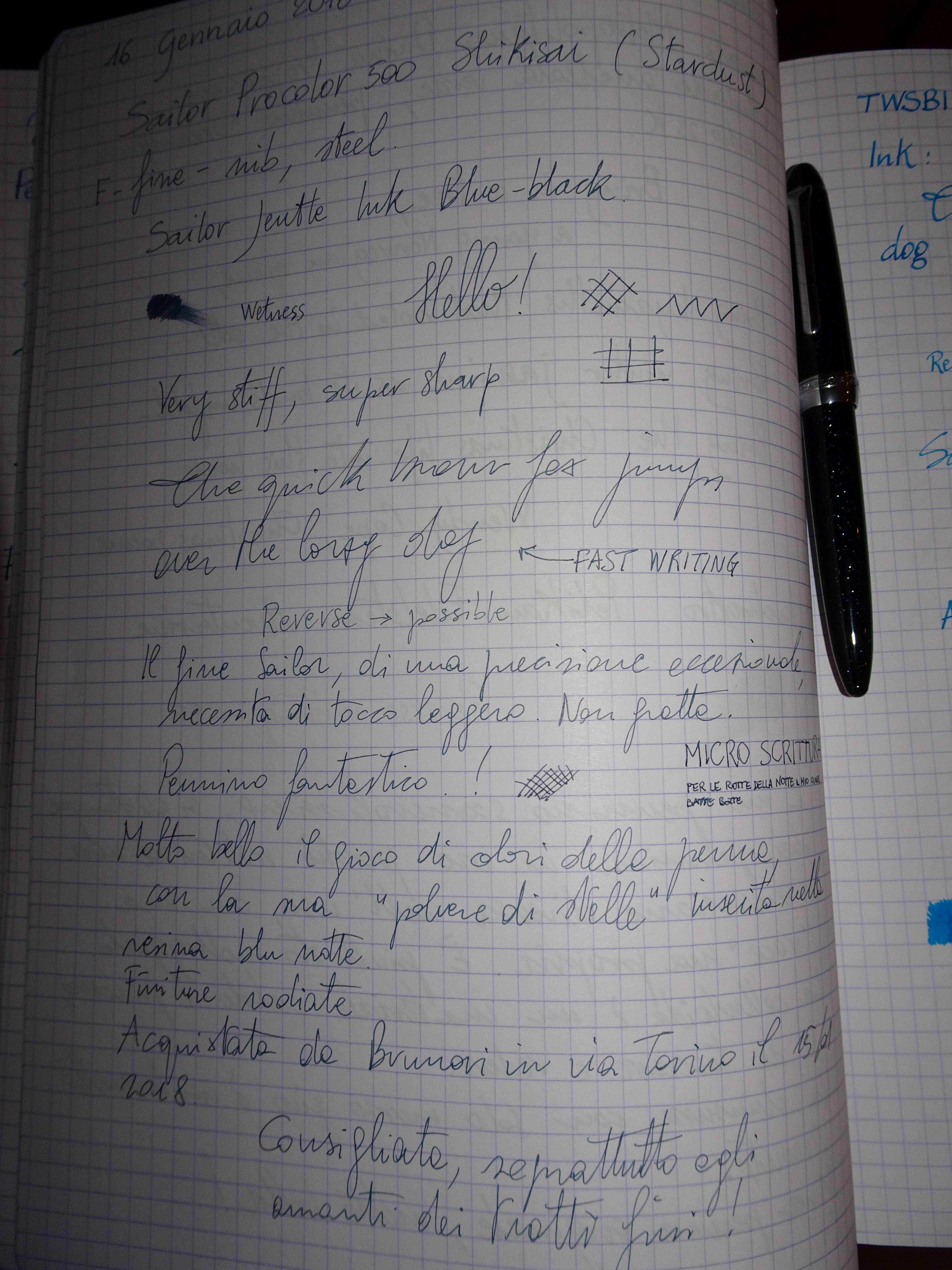 Per la prova ho usato un inchiostro Sailor Jentle Ink Blue Black, un blu dalle sfumature grigio verdi, interessante e, soprattutto, adatto alla Stardust.