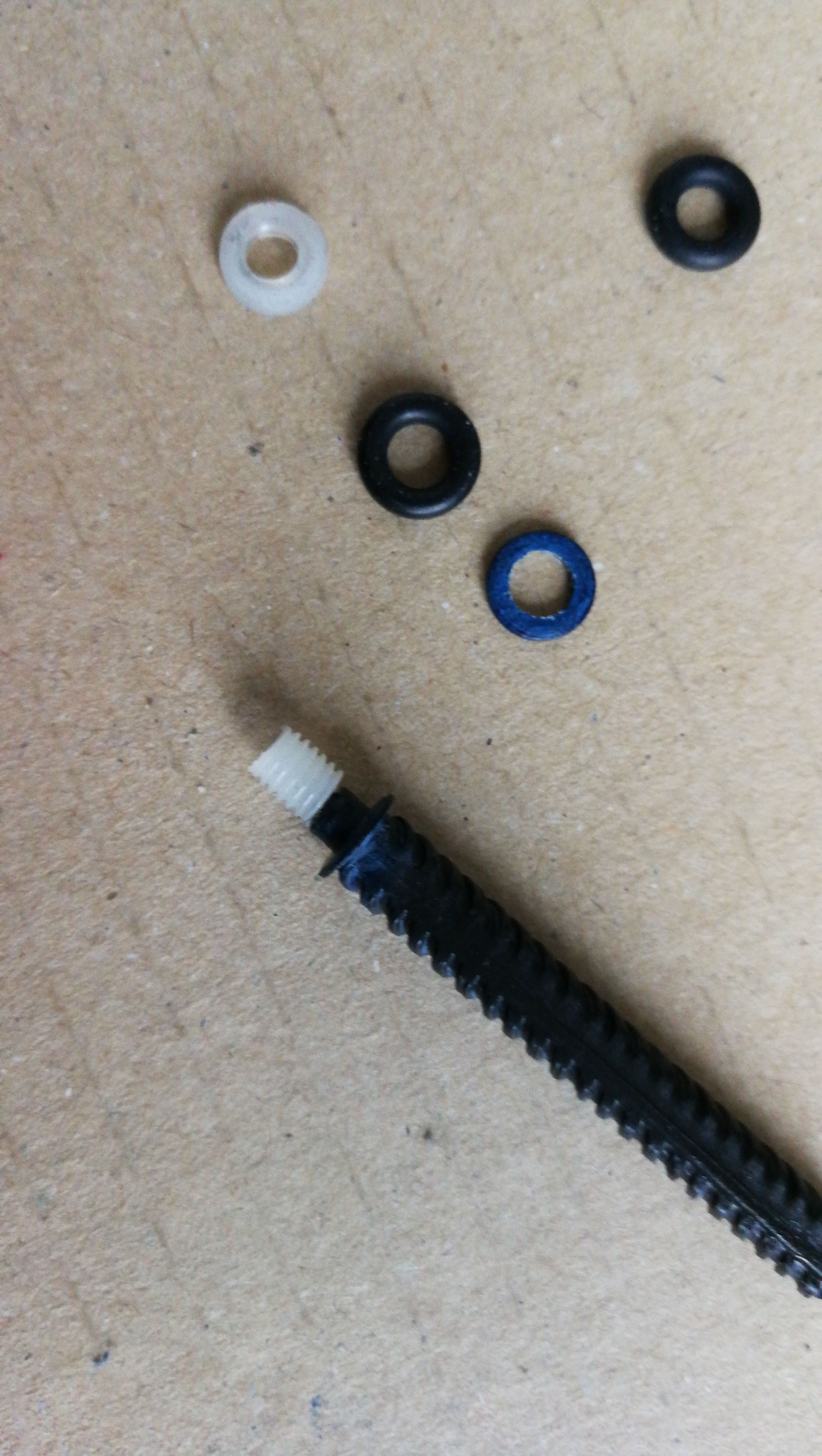 Foro quindi assialmente il moncone con una punta da 1.8 mm e passo un maschio da 2 mm. Prendo poi due viti in plastica (forse nylon): una da 2 mm ed una da 4 mm e ne ricavo segandole due monconi: quello da 4 verrà forato e filettato analogamente allo stantuffo mutilato, quello da 2 servirà a collegare saldamente le due parti, ricreando una condizione molto prossima a quella d'origine. L'ultima cosa da fare è ridurre l'esterno di un dado da 4 mm, che altrimenti non passerebbe nel serbatoio. Rimontato tutto la penna funziona ora perfettamente.