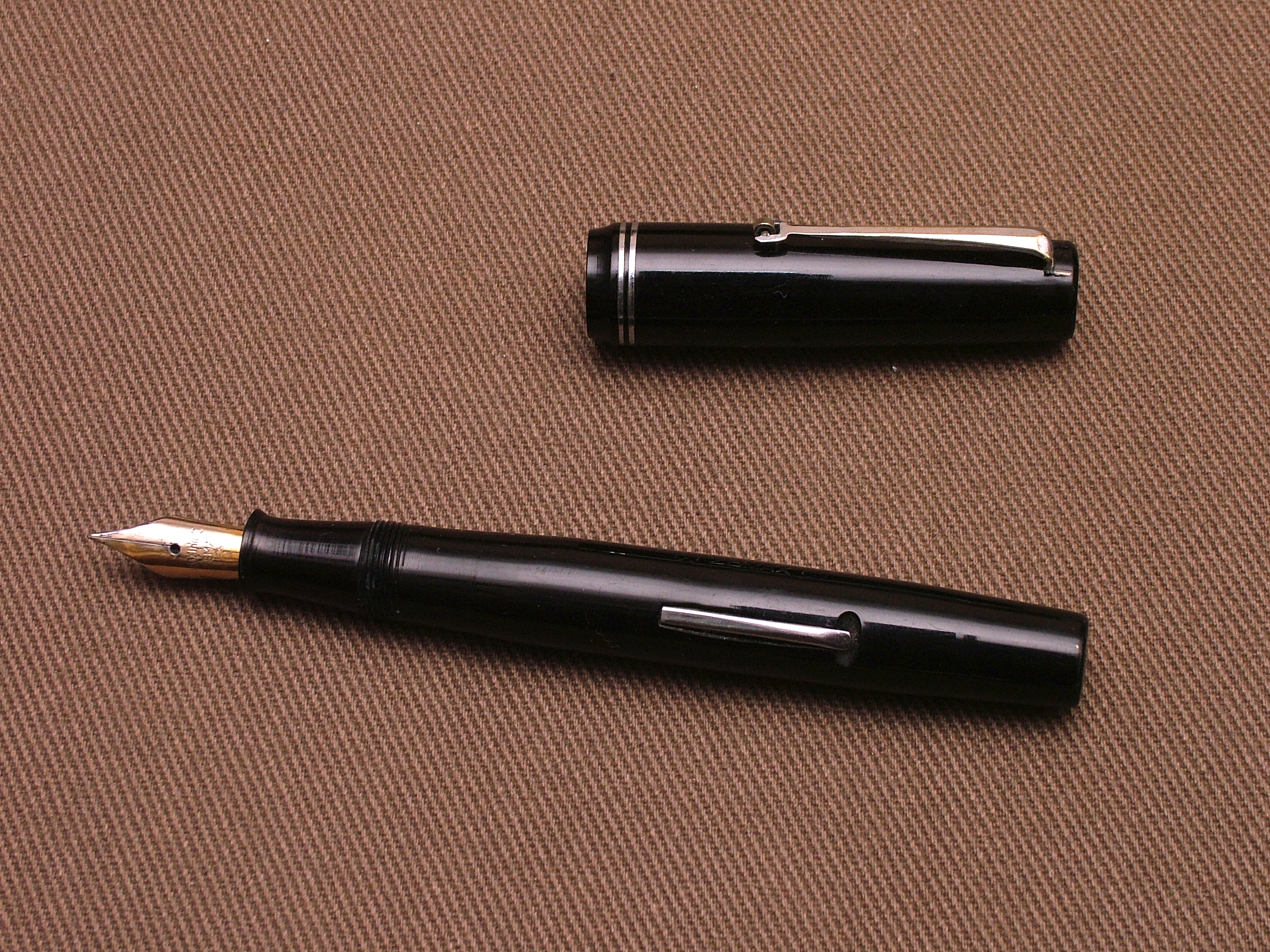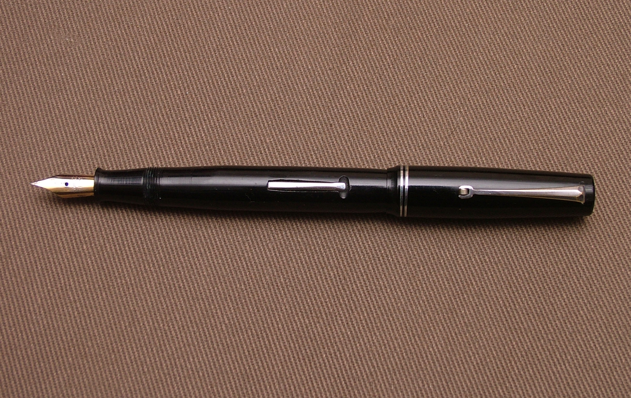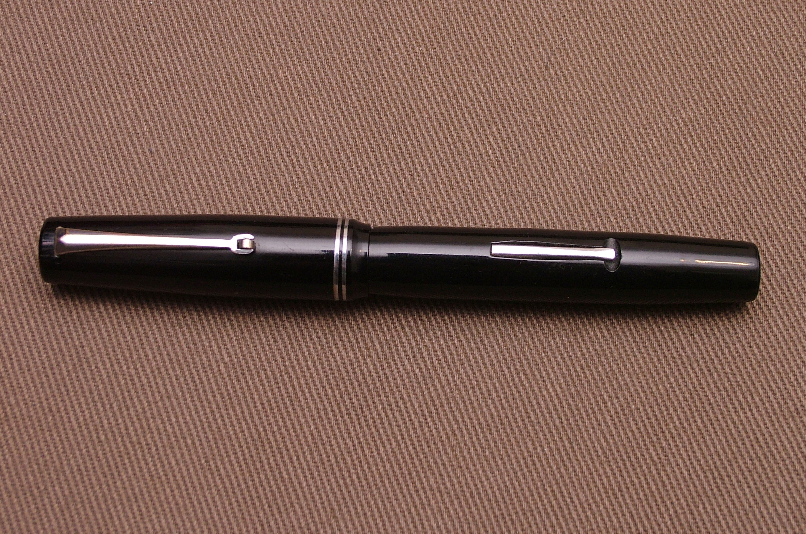 La penna è di misura media, è in celluloide nera ed il pennino è in acciaio dorato.