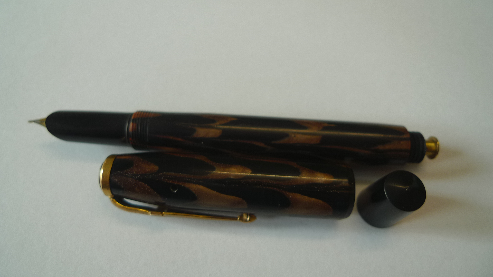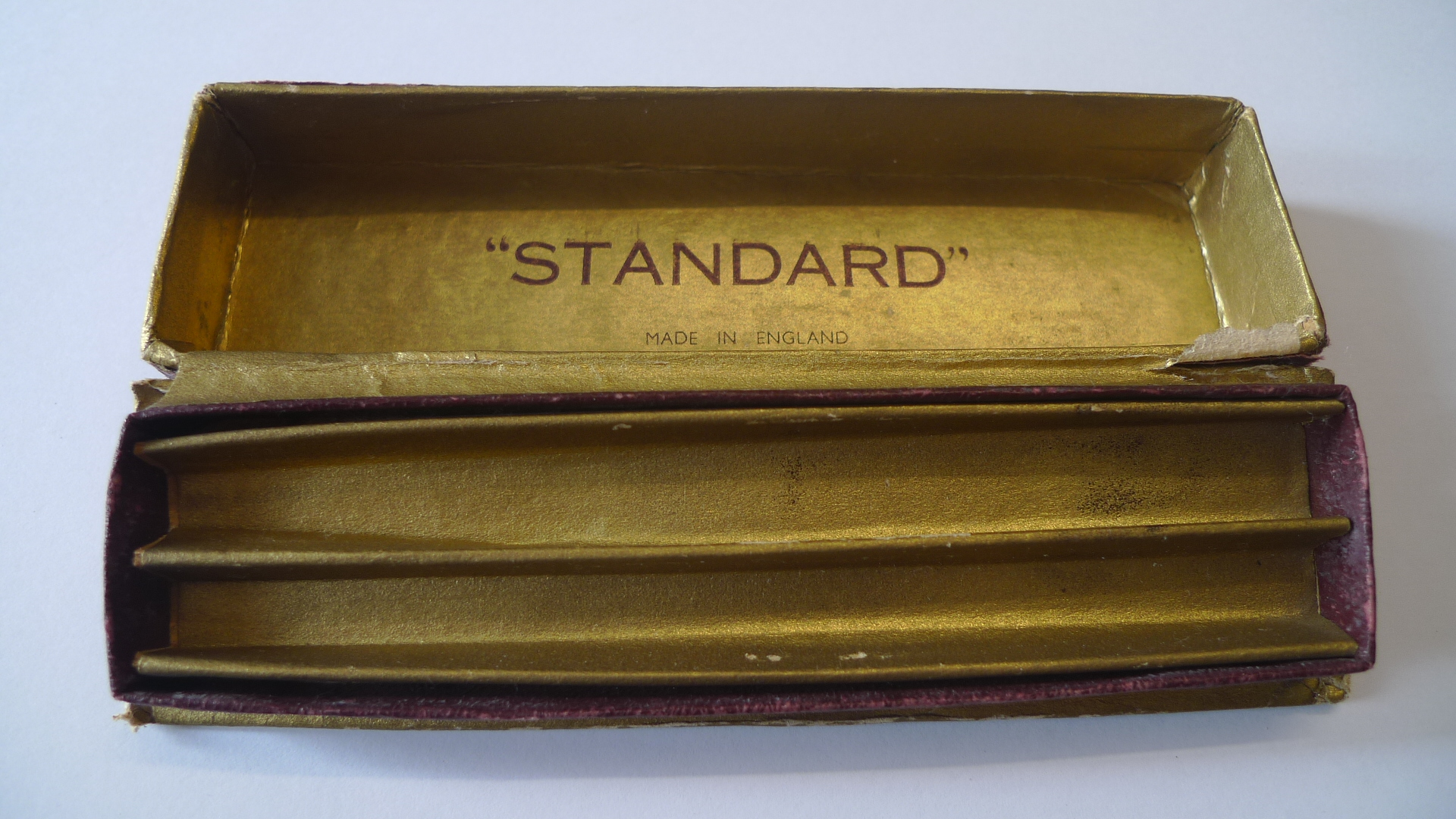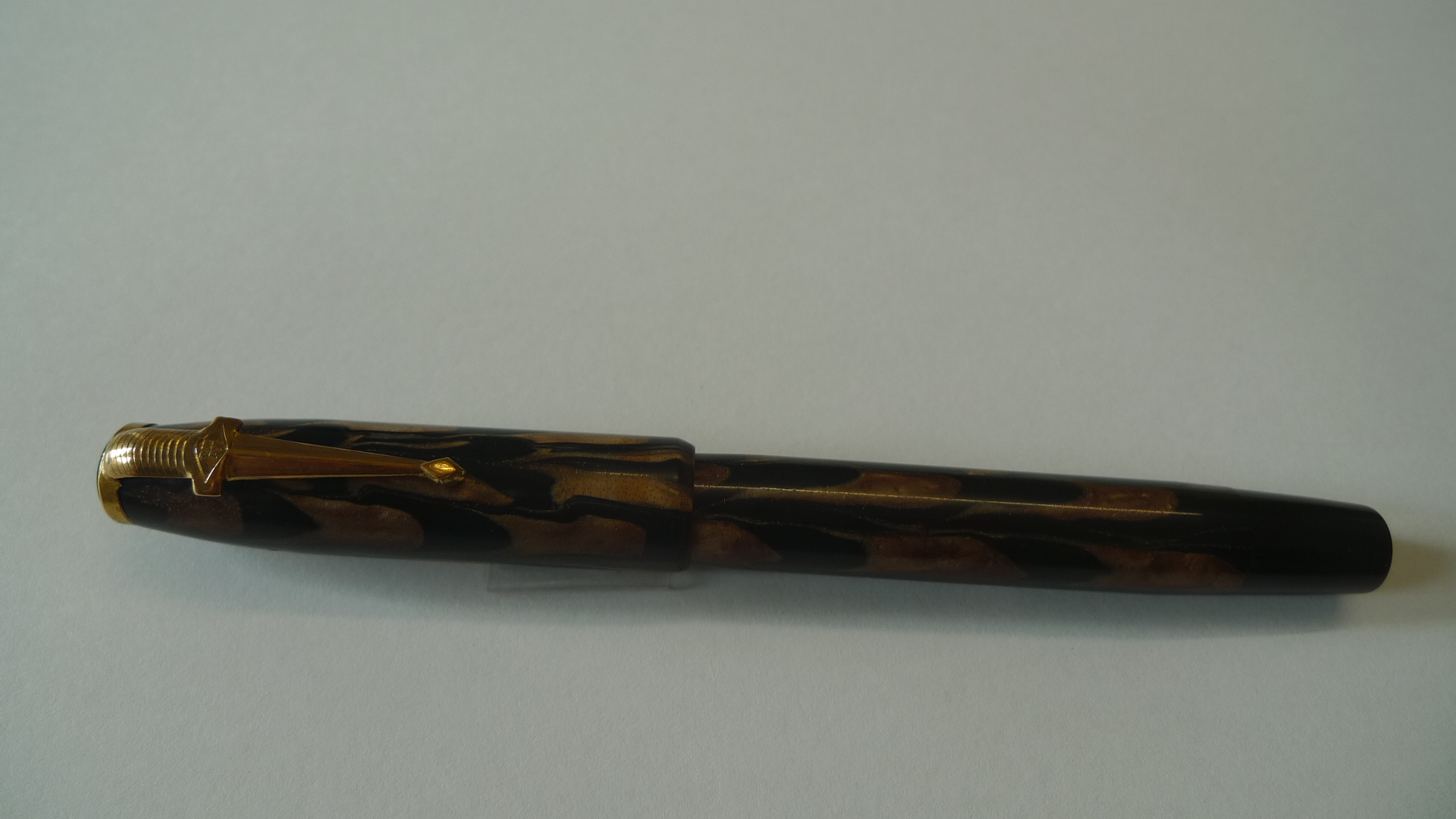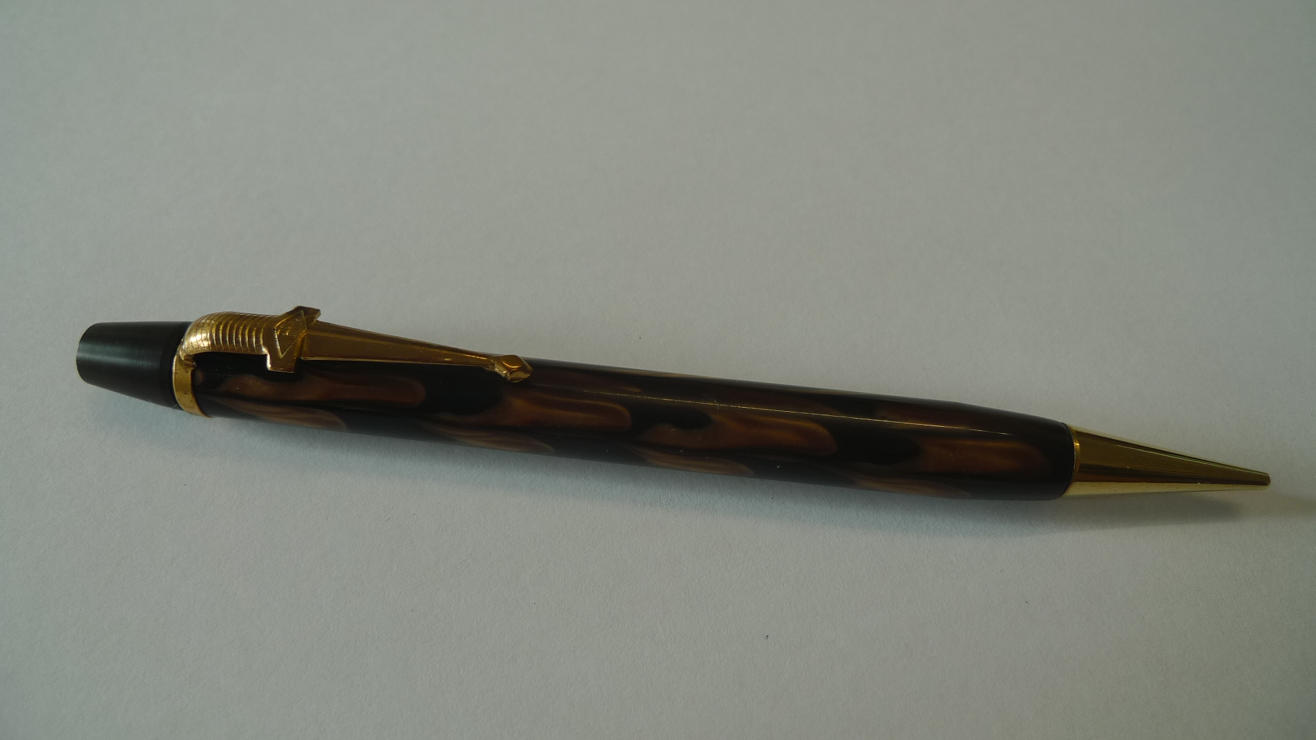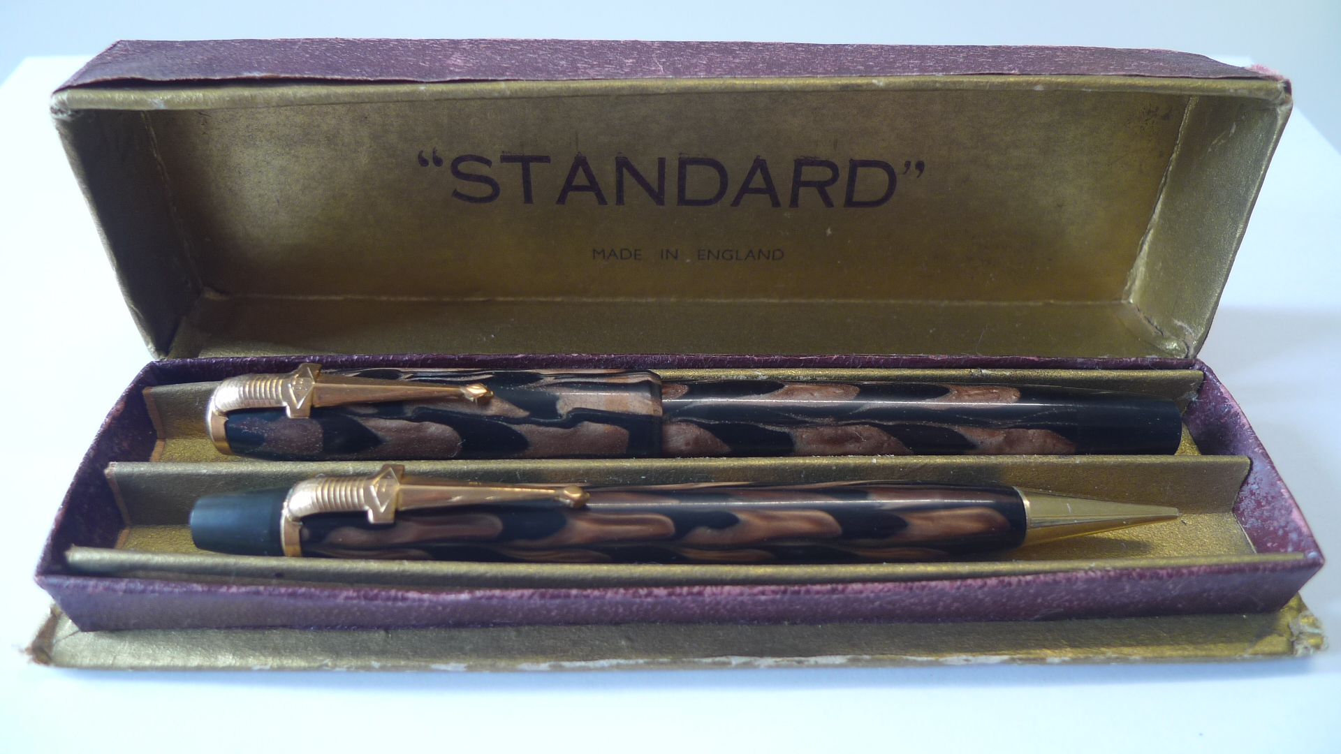 È sicuramente un marchio inglese. Sul locale sito di aste ne ho vista una in celluloide verde, caricamento a pulsante di fondo e stessa clip a spada. Anni '40.