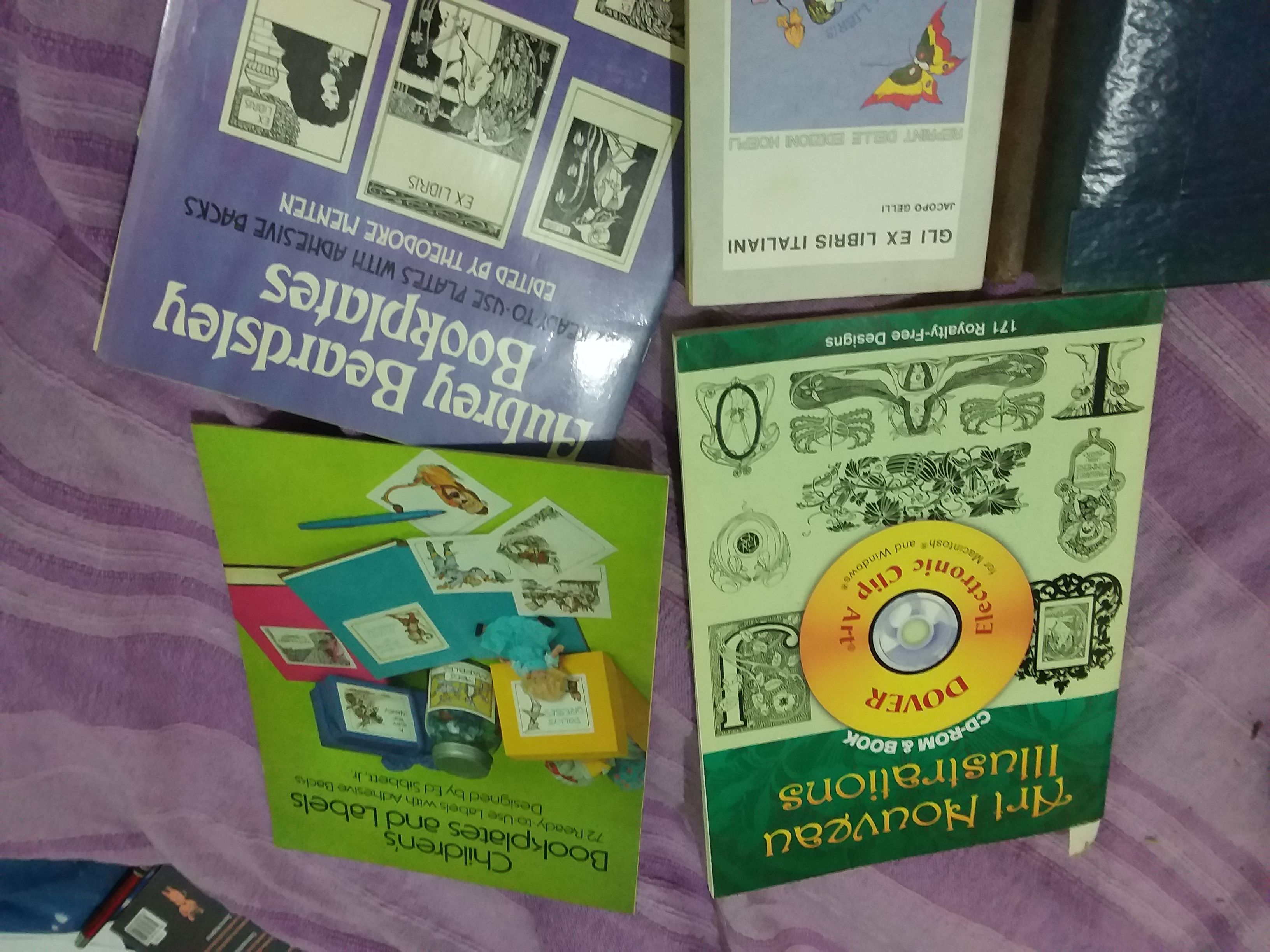 Per la precisione sono libri, quasi tutti con Cd incluso contenenti le jpg, di immagini di Art Nouveau. Mi arrampico sulla scala perché essi sono su un ripiano alto, fotografo le copertine e le allego. Pazientate un poco.
