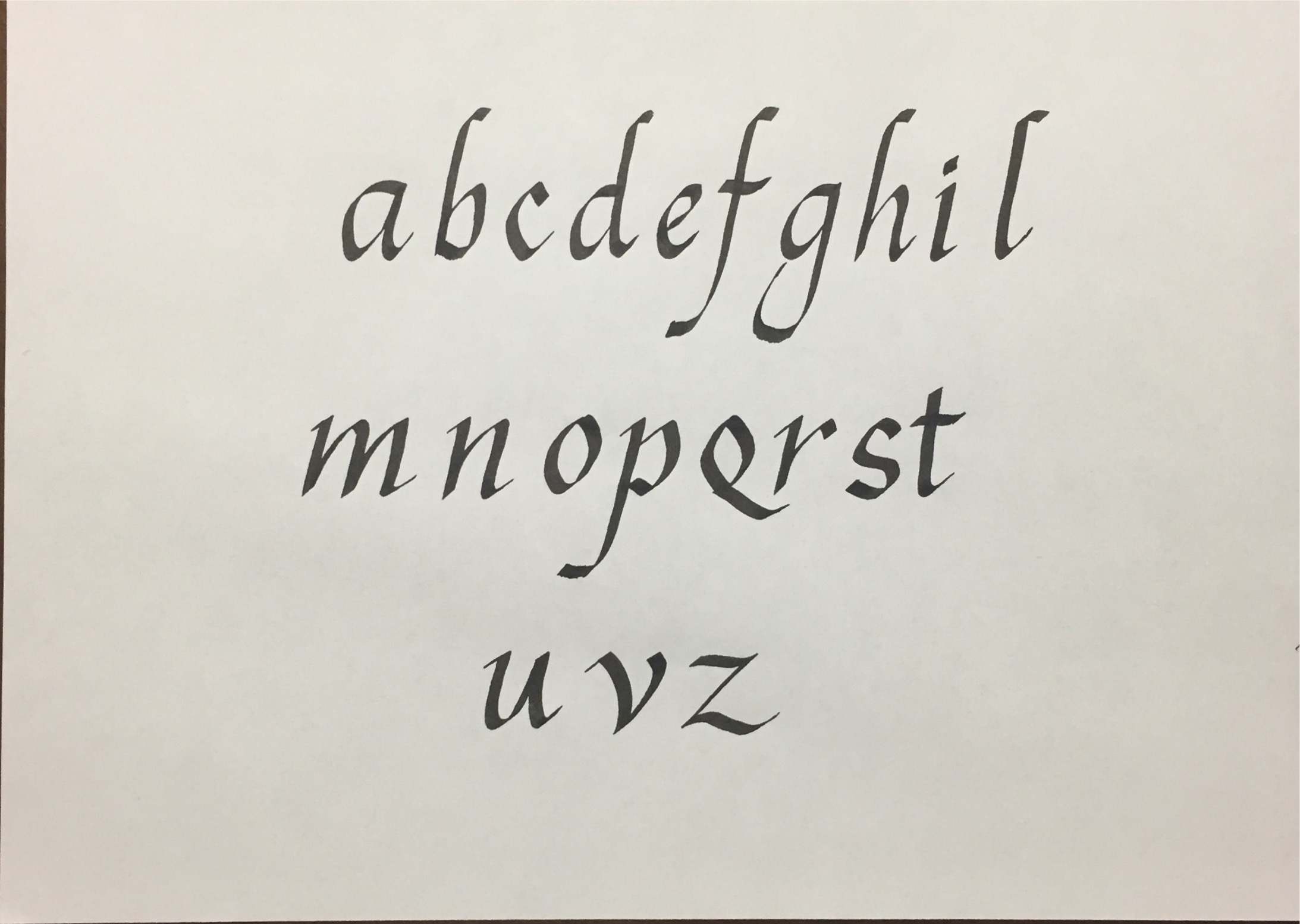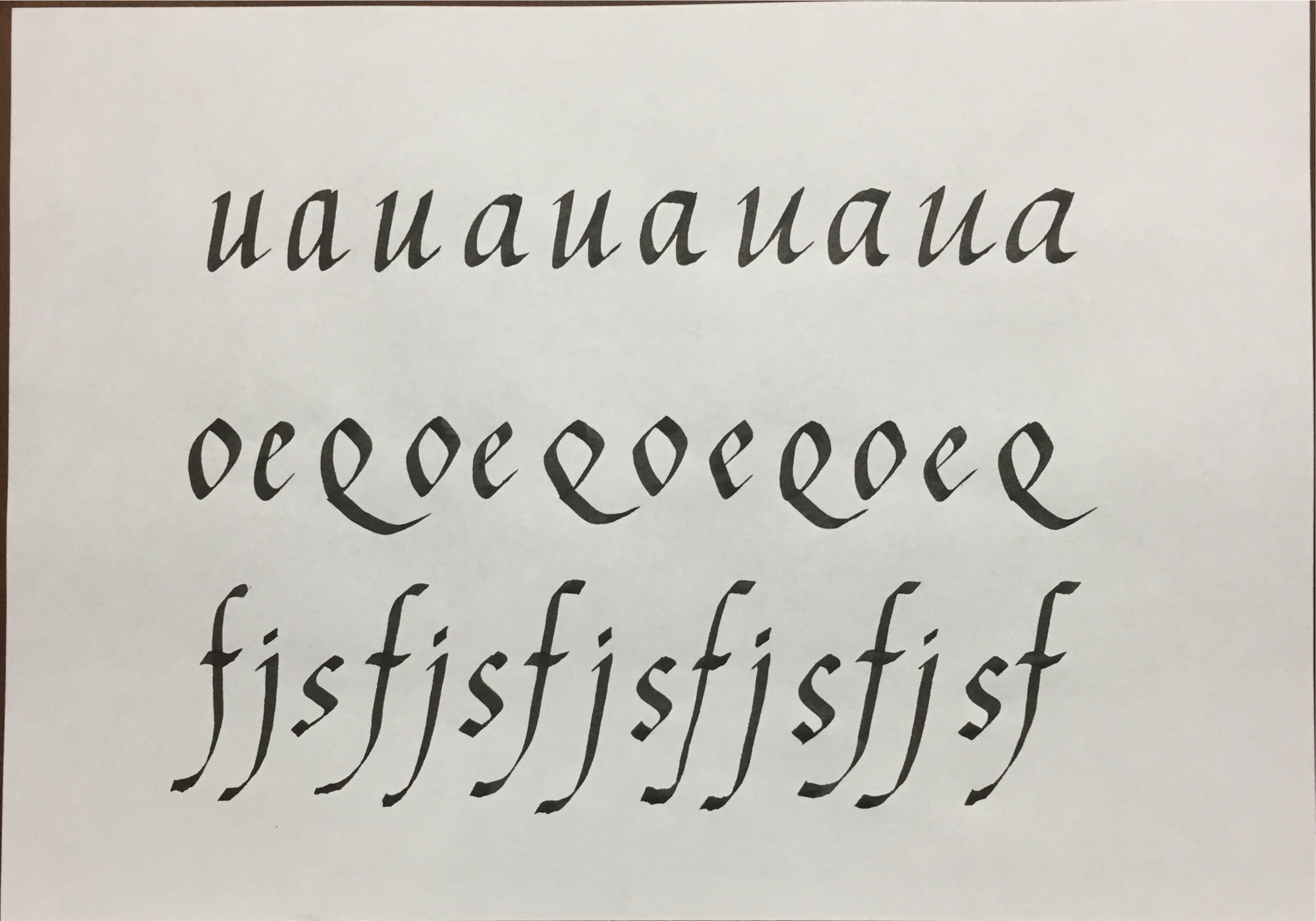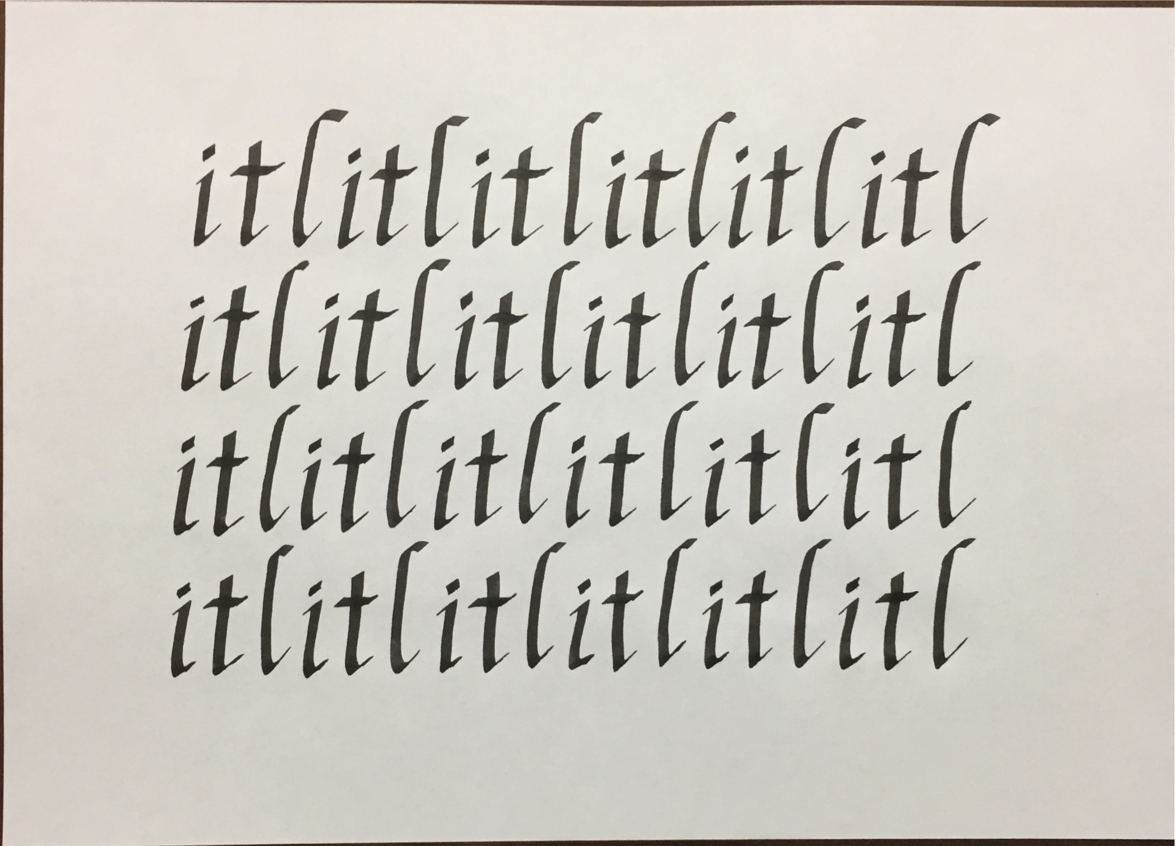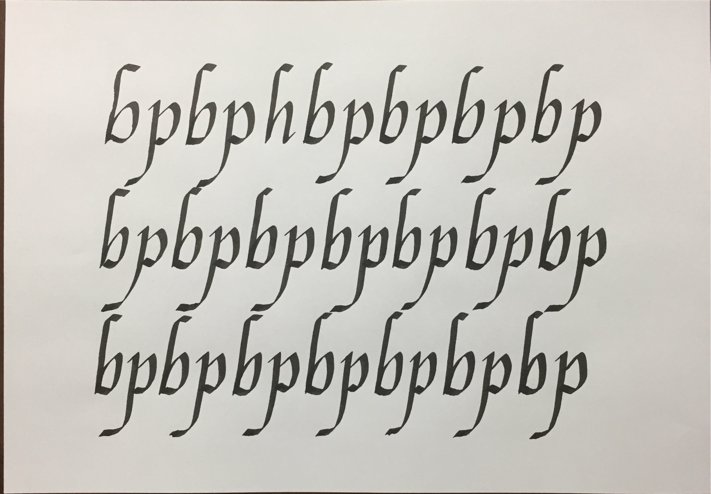 Riprendendo quanto scritto da Daniela, insisterei sul mantenere costante l'inclinazione del pennino rispetto alla linea di scrittura. I tratti verticali di b, d, h, l, i, e così via devono avere tutti lo stesso spessore e questo si ottiene solo se non si cambia l'angolo di inclinazione.