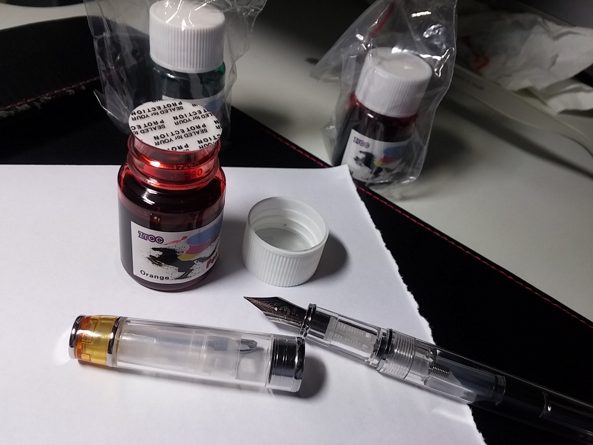 La boccetta è in plastica e contiene 15 ml di inchiostro. Il tappo era ben sigillato. L'ho caricato su una penna economicissima ma che adoro, la Wing Sung 3003.