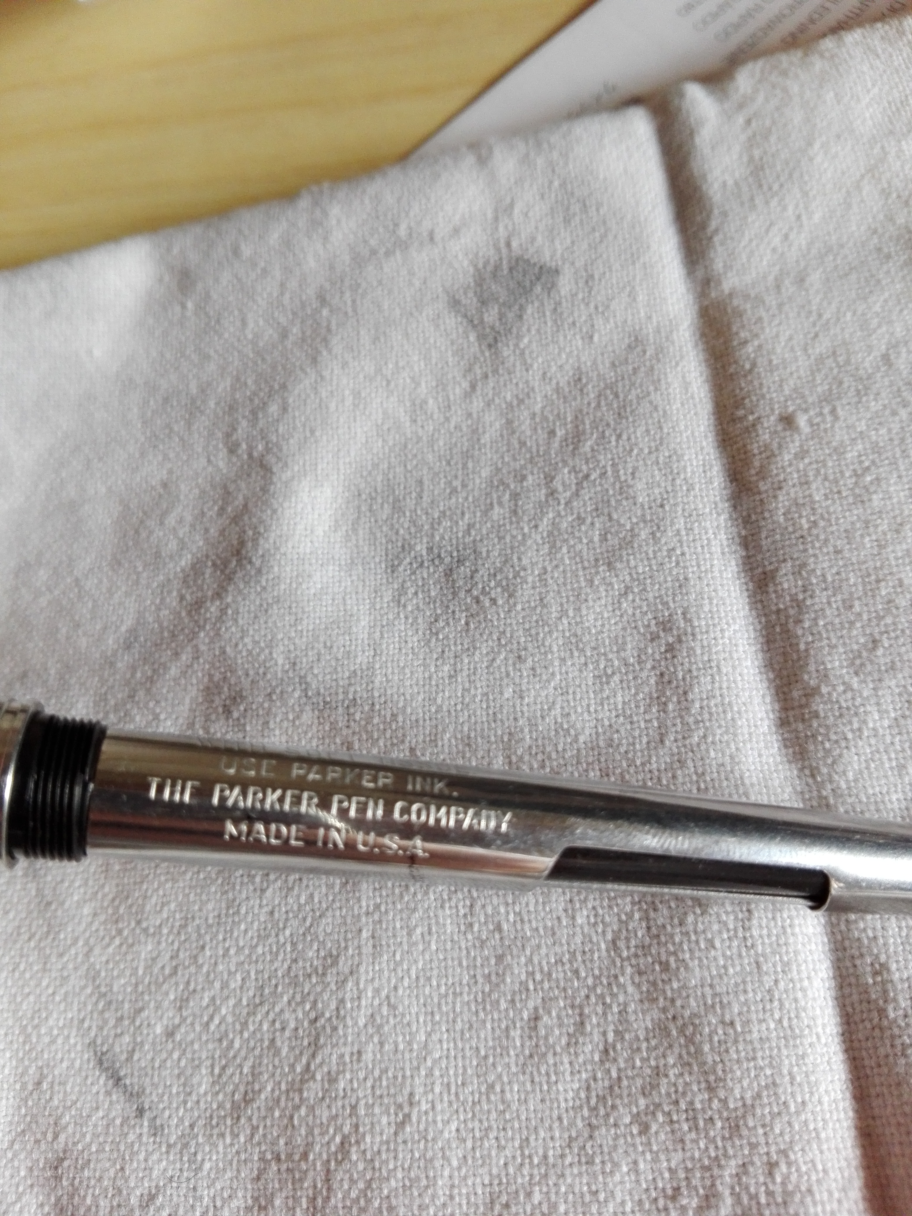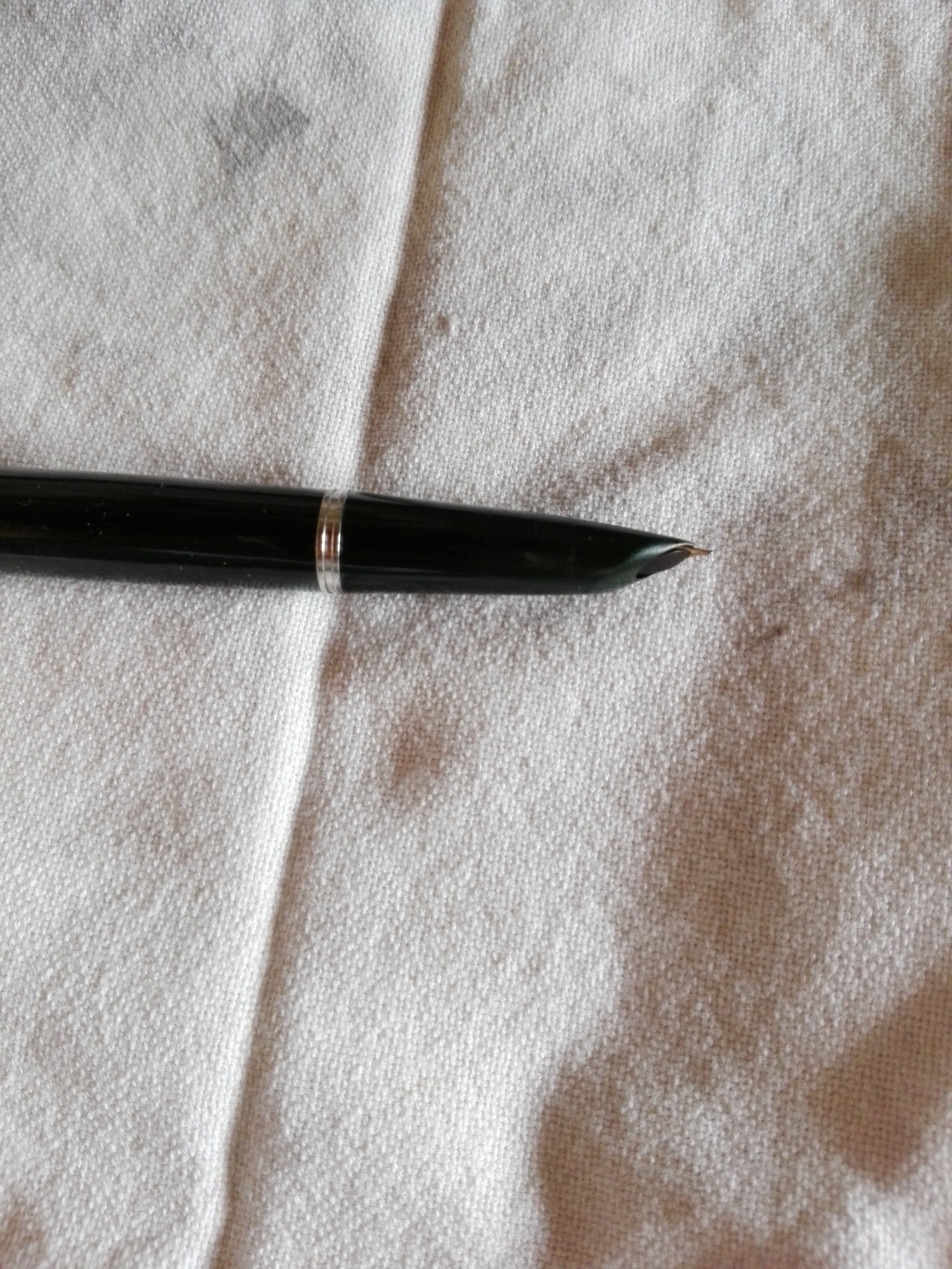 Smontata con attenzione, lavata e rimontata, la penna ha risposto molto bene alla prova scrittura (inchiostro Pelikan 4001 Brilliant Black). Durante la manutenzione casereccia, ho potuto apprezzare tutti i componenti della penna ben conservati, cosa non sempre scontata quando si compra al buio. Durante la prima settimana di utilizzo però mi sono accorto che a causa della posizione non proprio perfetta del pennino, la penna scriveva male se non inclinata in una determinata posizione. Ora ho posizionato il pennino in una posizione decisamente migliore (non voglio azzardare a dire ottima), e mi sembra che scriva molto meglio, nonostante ogni tanto si "perda" la traccia dell'inchiostro.