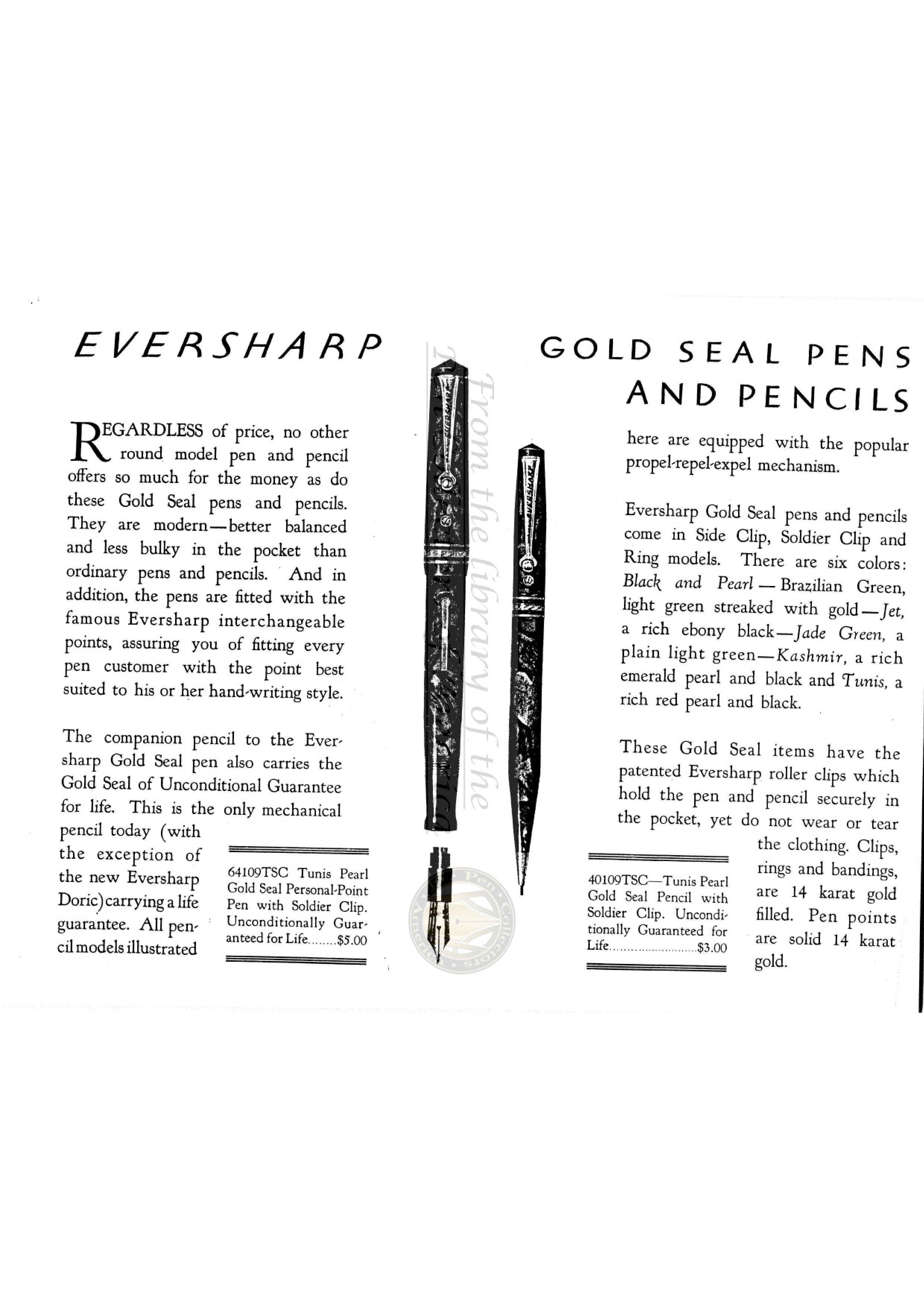 Nel 1932 la "tua" penna, erede della Personal Point / Gold Seal e della Equipoised non estrema, era così pubblicizzata: Era dalla casa considerata commercialmente inferiore solo alla Doric e il suo nome era GOLD SEAL PEN.