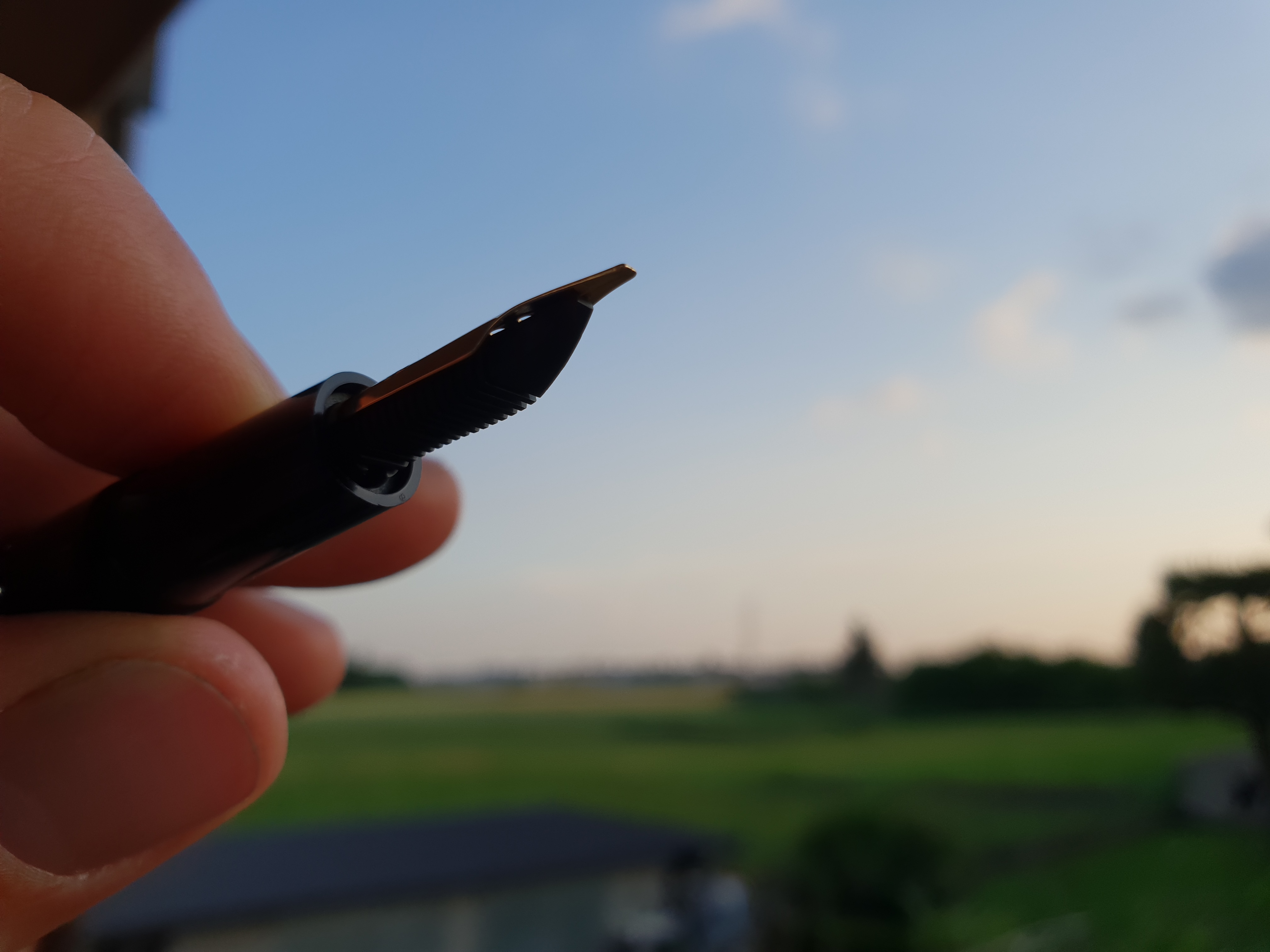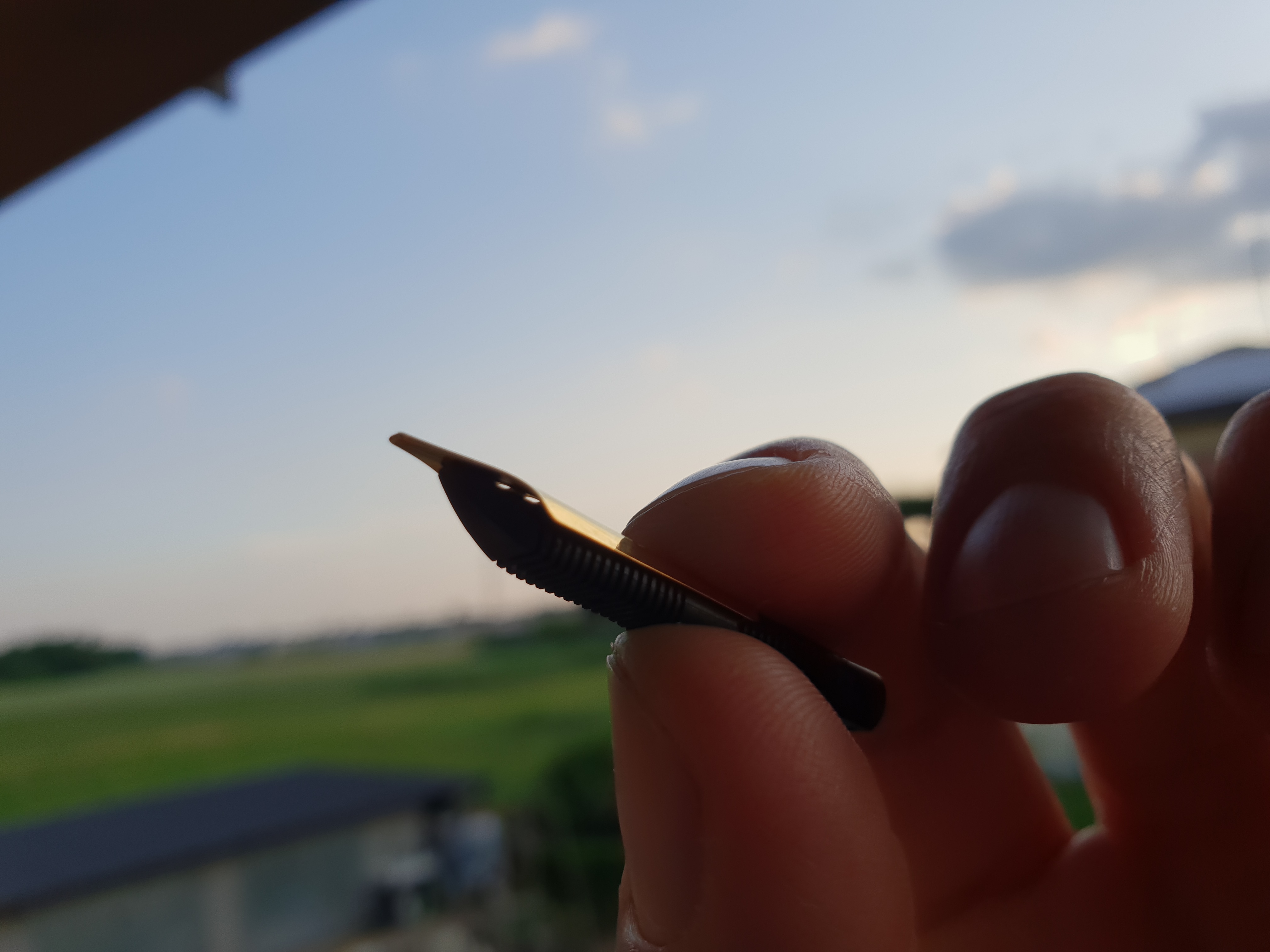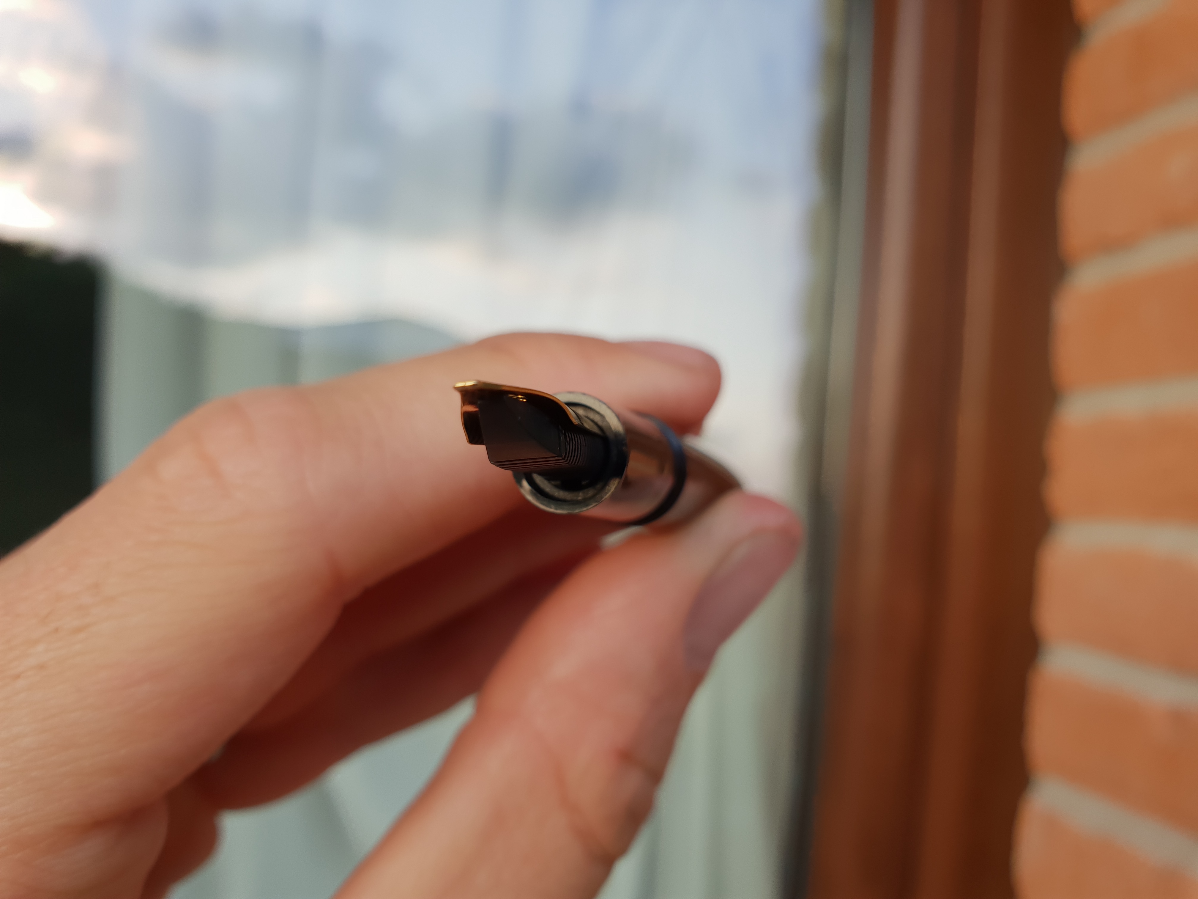 Il pennino, per quel che ho potuto provarlo ieri sera, quando è raggiunto dalla corretta quantità di inchiostro scrive liscio e scorrevole senza impuntamenti e grattamenti vari. E, ad occhio, sembra dritto(non punta eccessivamente in alto o in basso).