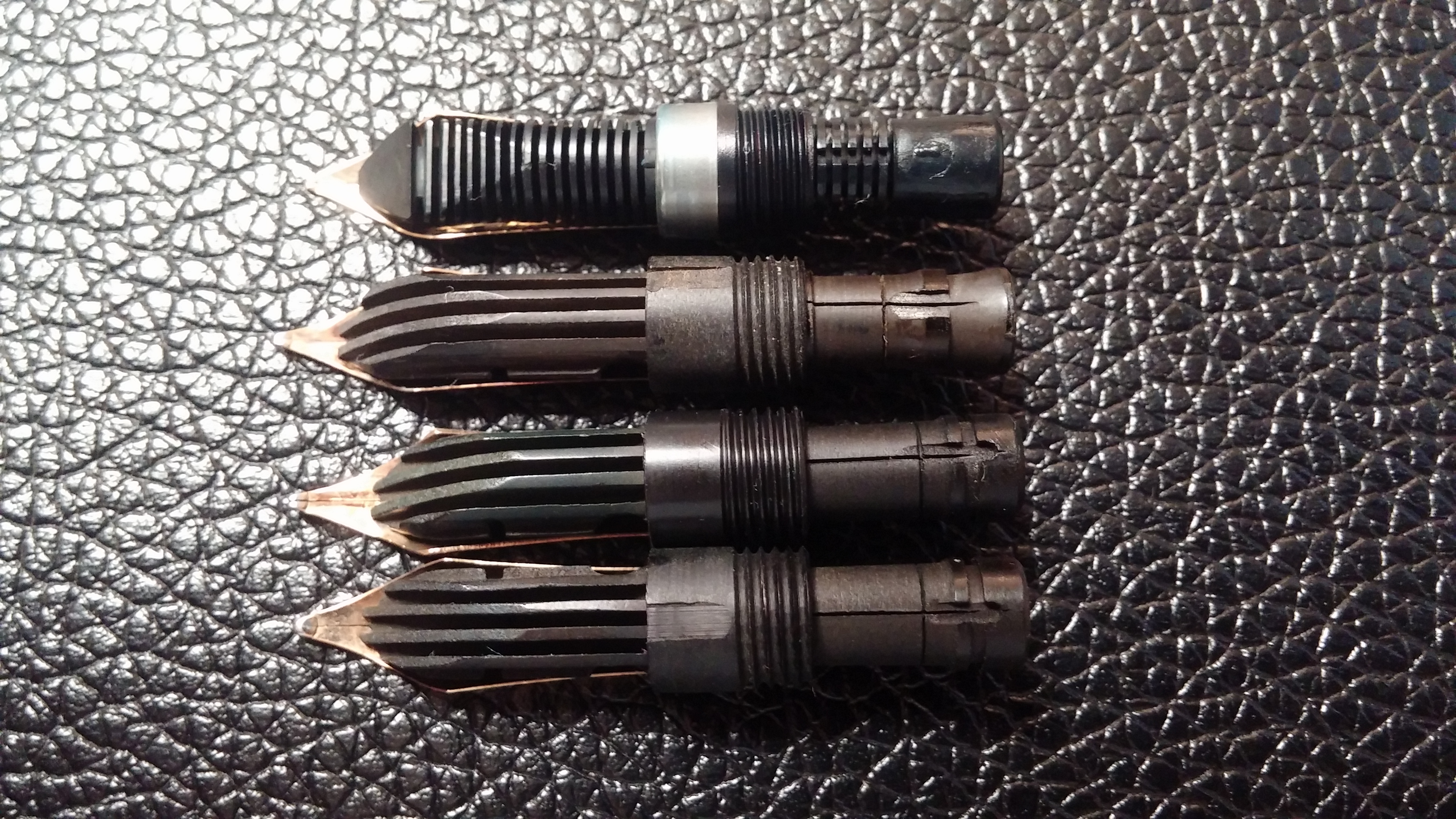 Ecco quattro assiemi pennino/alimentatore. Dall'alto: M400 "old style" anni '80; 400N, due 140: