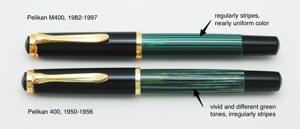 La mia 140 ha le strisce più o meno come la 400 in alto, mentre la penna in questione ha le strisce come quella in basso, tuttavia la filettatura della sezione, non arriva fino al fusto e questo particolare la riconduce alla versione "moderna" della 400, l'alimentatore e il pennino sono coevi a quest'ultima.