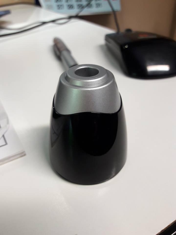 Ha il cappuccio, così volendo lo si può portare appresso, e la base in cui inserirlo se usato sulla scrivania.