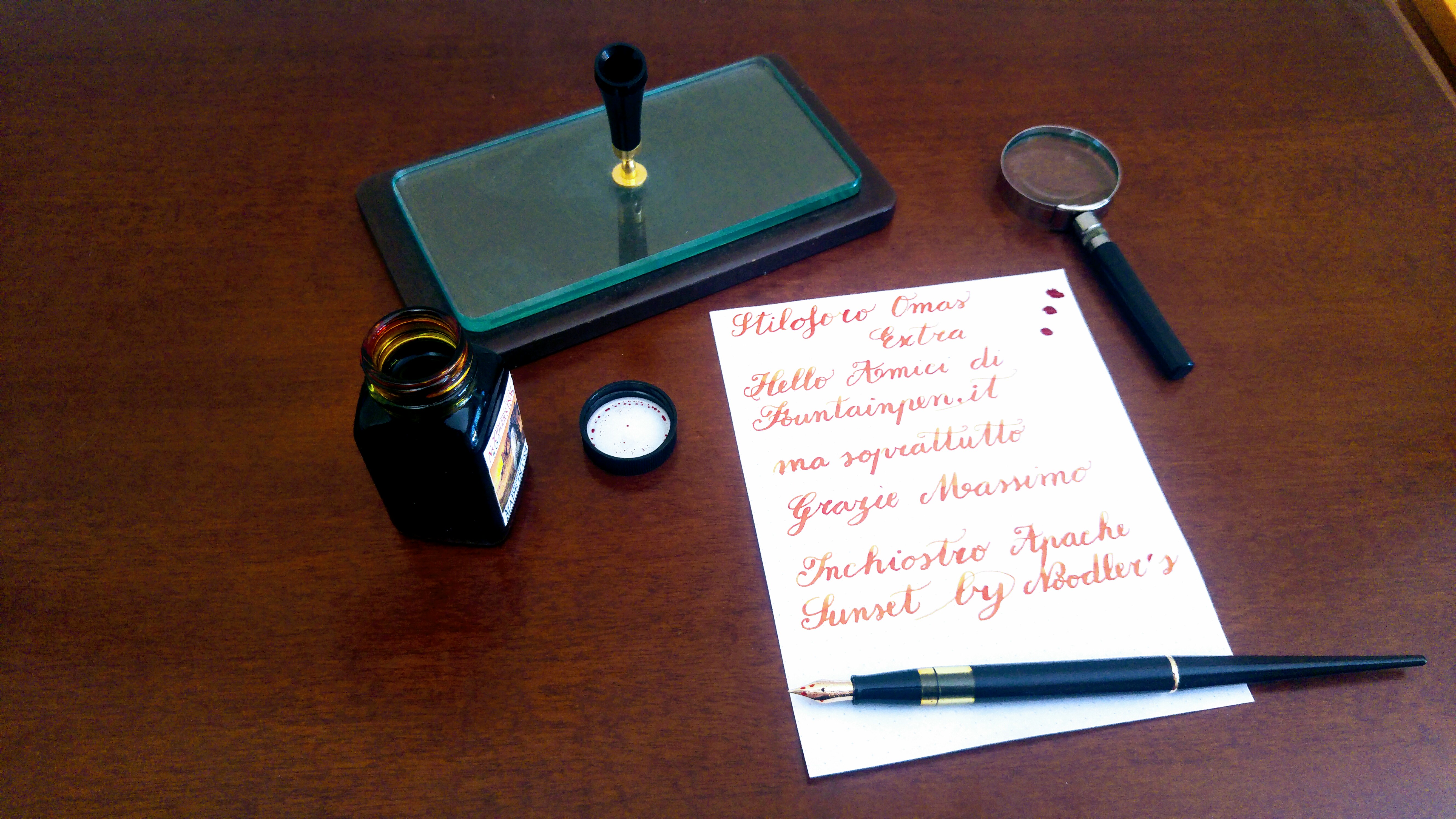 Oggi l'ho provato per intinzione. Sono in partenza, ma appena rientro lo inchiostro, di sicuro però non con l'Apache Sunset usato per la prova, bellissimo ma poco "usabile".