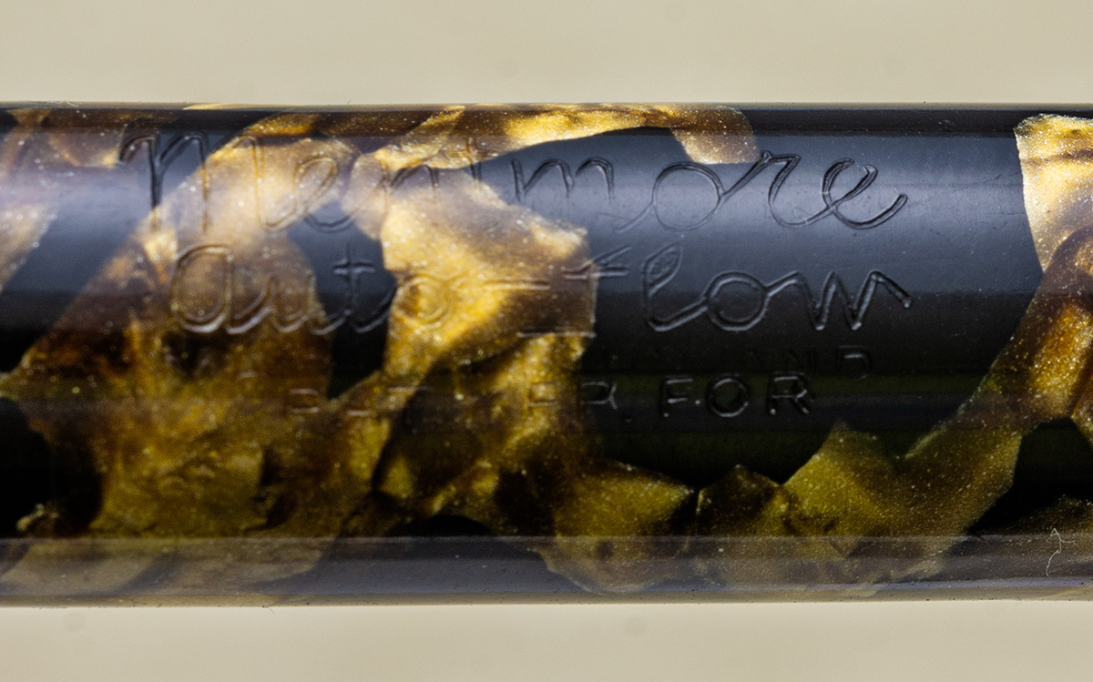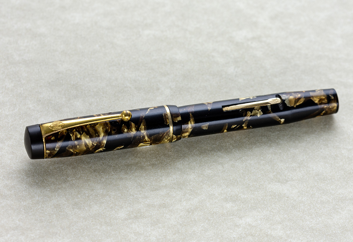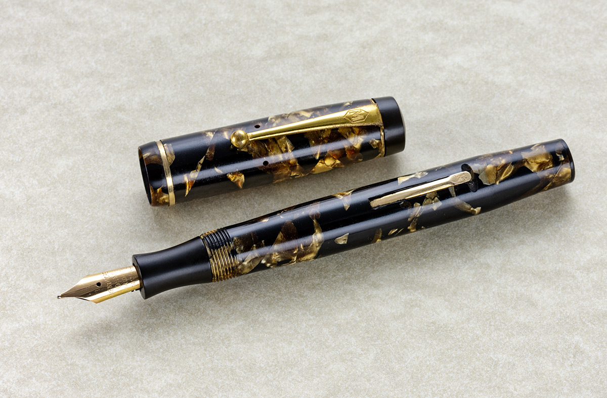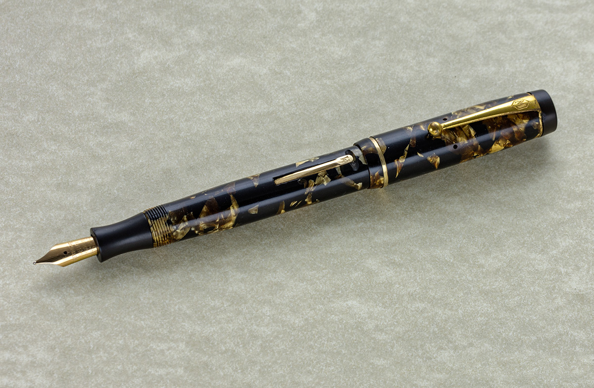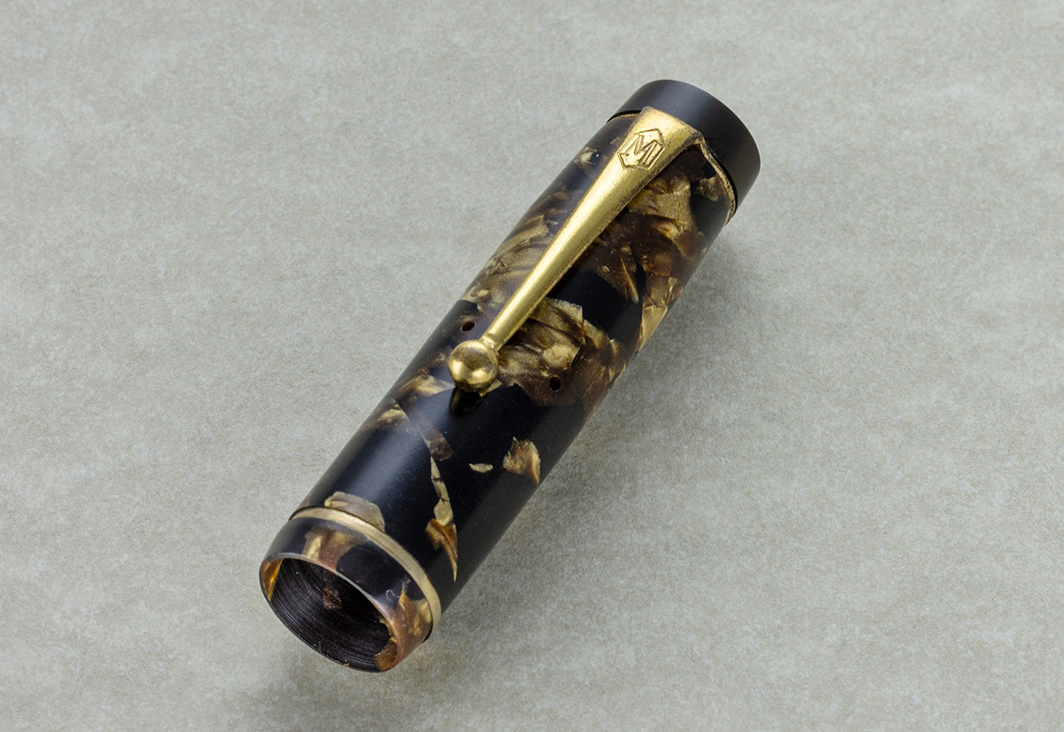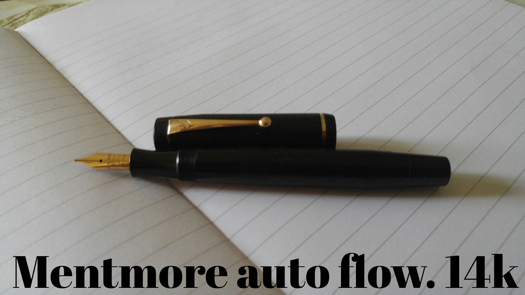 sono venuto in possesso di questa penna Mentmore modello "Auto-Flow, l’anno di produzione dovrebbe essere il 1934, ma data la scarsità di notizie, la forbice temporale potrebbe andare dal 1930 al 1940; il pennino in oro 14 carati e il caricamento a levetta, il materiale usato dovrebbe essere celluloide, nera con inserti color oro, mentre l’impugnatura e la testina del cappuccio dovrebbero essere in bachelite nera.