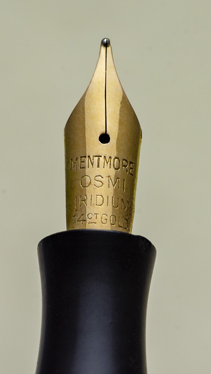 Il pennino in oro riporta la scritta Mentmore, subito sotto la scritta Osmi Iridium, e la sigla 14 ct – Gold, dalle prove di scrittura direi che come misura si tratta di una M, come durezza direi che è un pennino poco flessibile, la variazione di tratto è minima.