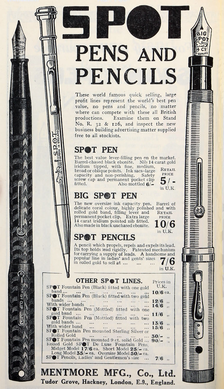 La prima penna stilografica prodotta dalla mentmore era la "Spot", una penna con un sistema di riempimento a leva efficiente; i pennini, prodotti dalla azienda erano gli "Osmi Iridium" in oro 14 carati.