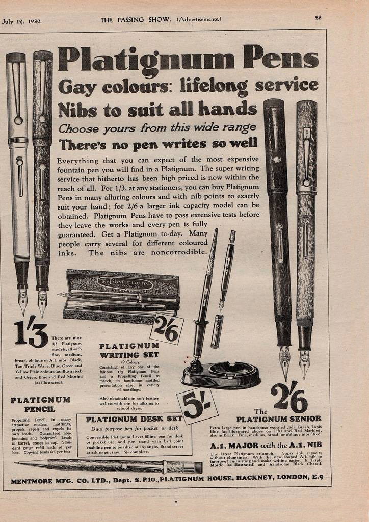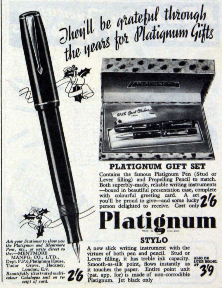 Ma da una locandine del 1949 la Mentmore sembra destinata (è evidente che viene creata la Plastics Division) più alla produzione in larga scala di componenti plastici, quindi sembra che la Platignum Pen Company, sia il ramo dell’azienda destinato alla produzione delle penne.