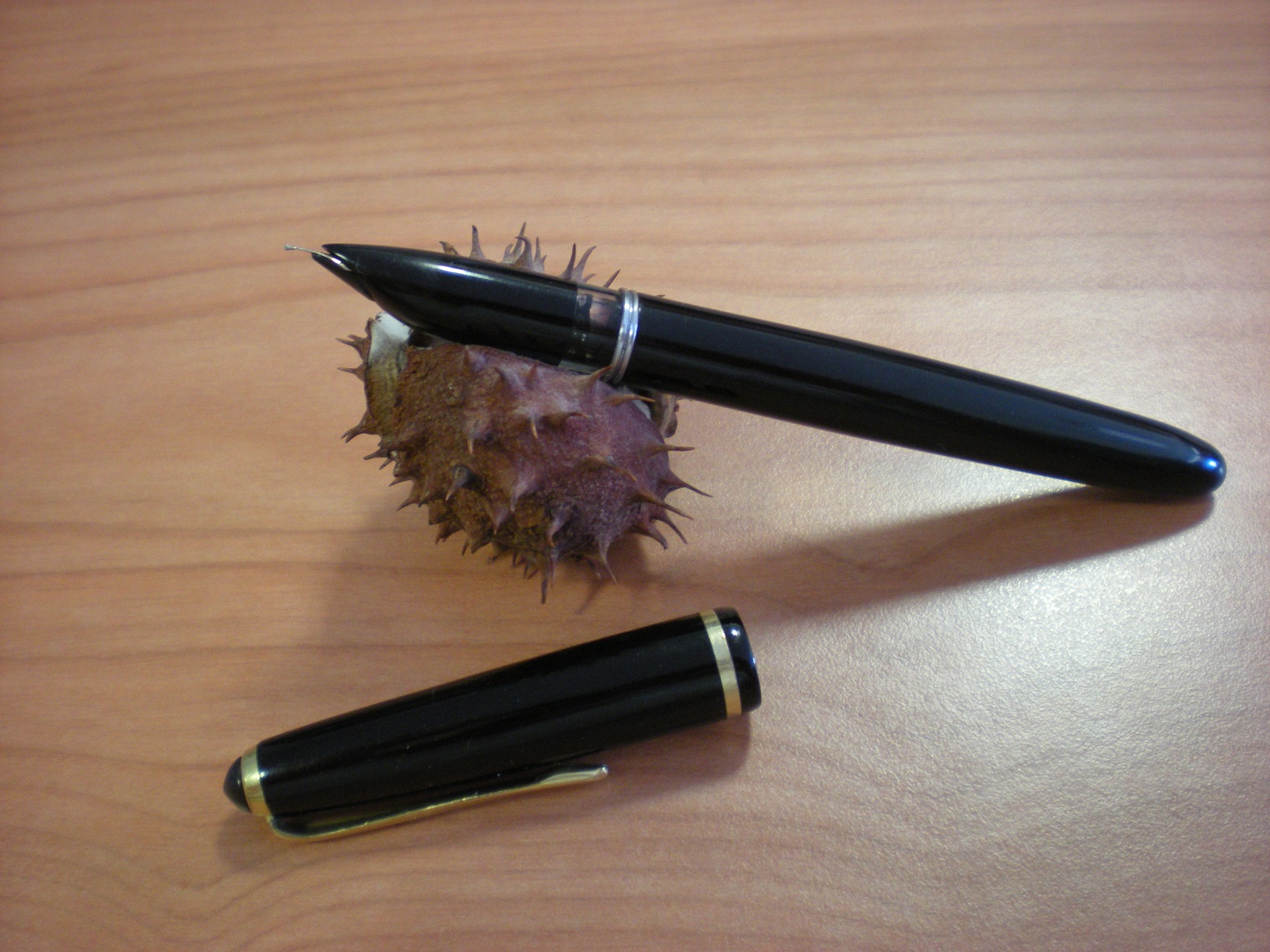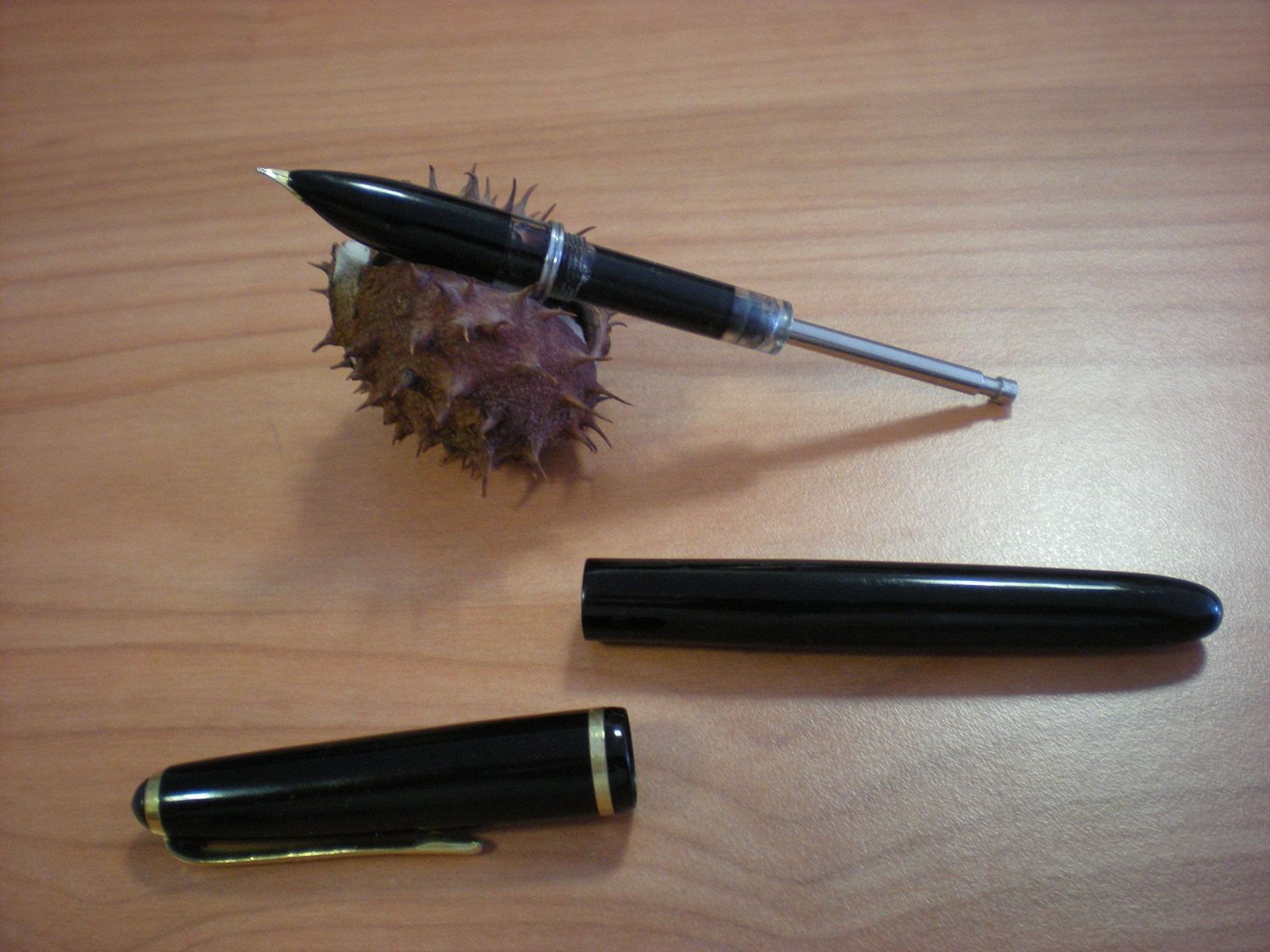 Salve a tutti,questa penna era stata gettata nel cestino della carta da un mio conoscente, l'ho recuperata e rimessa in carreggiata. Aveva il serbatoio con due crepe longitudinali che ho sigillato con l' Attack e poi levigato. Ho sigillato anche la crepa sul fusto ripassando con un incisore per modellismo la filettatura interna. Lavata e lucidata un po' non mi sembra male. Sul fusto a stento si leggono, su tre righe sovrapposte, le parole: V...... - AUTOVAC - MADE IN ITALY. Sul Wiki,alla lettera V, non ho trovato niente di simile. Lo stile ricorda la Parker e l'Aurora. Il sistema di caricamento è a siringa e la guarnizione di testa tiene ancora bene. Penso che la penna sia stata un modello economico per via della fattura del pennino, in acciaio dorato, con la punta ottenuta per stampaggio.