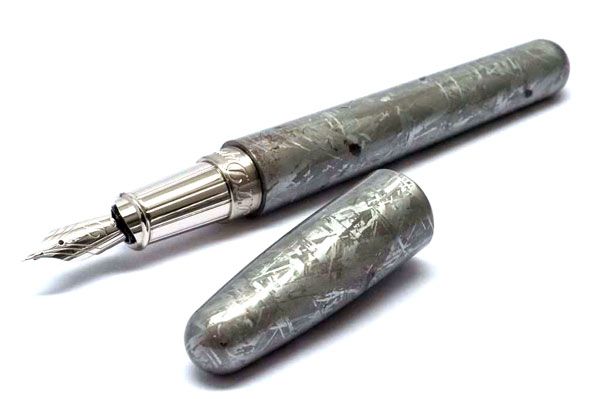 La stilografica in meteorite (polvere mescolata a lacca). Materiale "strano" usato anche per fabbricare alcuni quadranti di orologi, qui viene proposto da Dupont. In rete ci sono anche dei progetti di indipendenti che vorrebbero realizzare penne di questo genere. Progetto crowfounding...