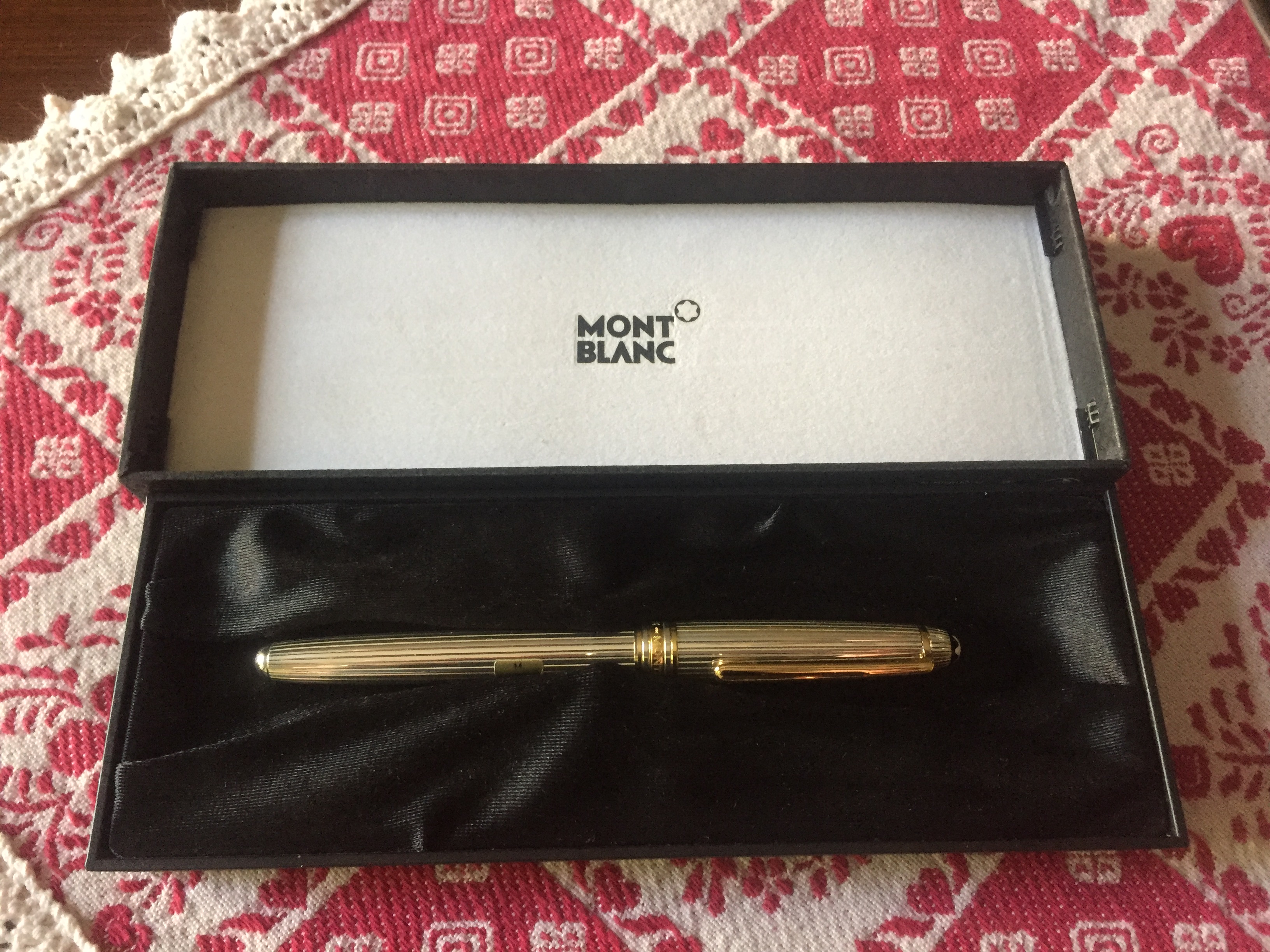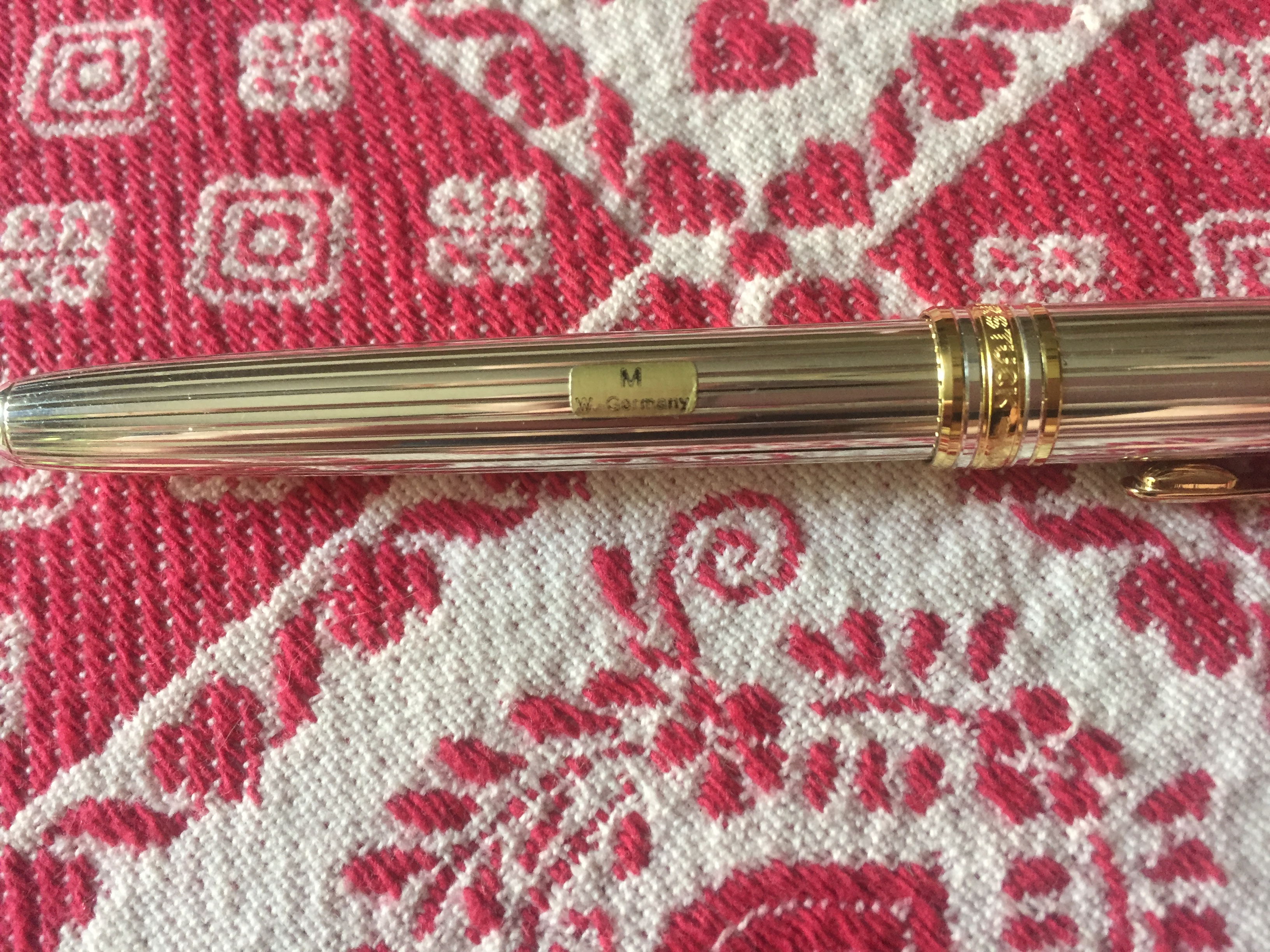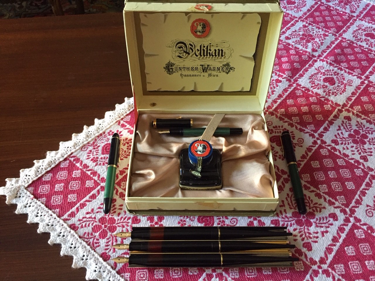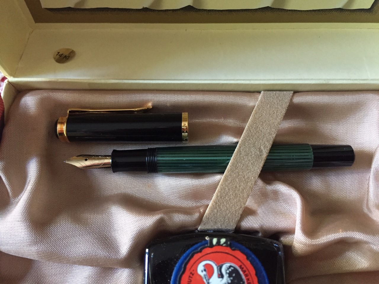 porta penne per 12 posti; flacone inchiostro Lamy turchese; due scatoline in plastica per pezzi di ricambio per penne, marchiati Omas e MontBlanc; base per stiloforo (porta penne singolo), marchiato Soennecken, in pura arte Bahaus, suppongo anni 20/30; Waterman Concord, nuova nella sua confezione originale; Pelikan 120 e 150 in buone condizioni; Penco 53, caricamento funzionante; penna biro per stiloforo Sheaffer; Aurora Ypsilon praticamente mai inchiostrata; una Aurora 88 Slim in ottimo stato, cappuccio in argento, caricamento cartuccia/converter; ed infine una MontBlanc 144 Solitaire in argento, usata, in buono stato con la dicitura Made in W. Germany. Successivamente una nuova ricerca ha fruttato: tre stilofori Omas Extra con pennino in oro 585 marchiato Omas in ottime condizioni; Pelikan M400 con scatola ed inchiostro mai usata, databile anni 80; Pelikan 120 e M150 in discrete condizioni. Ecco le foto di rito.