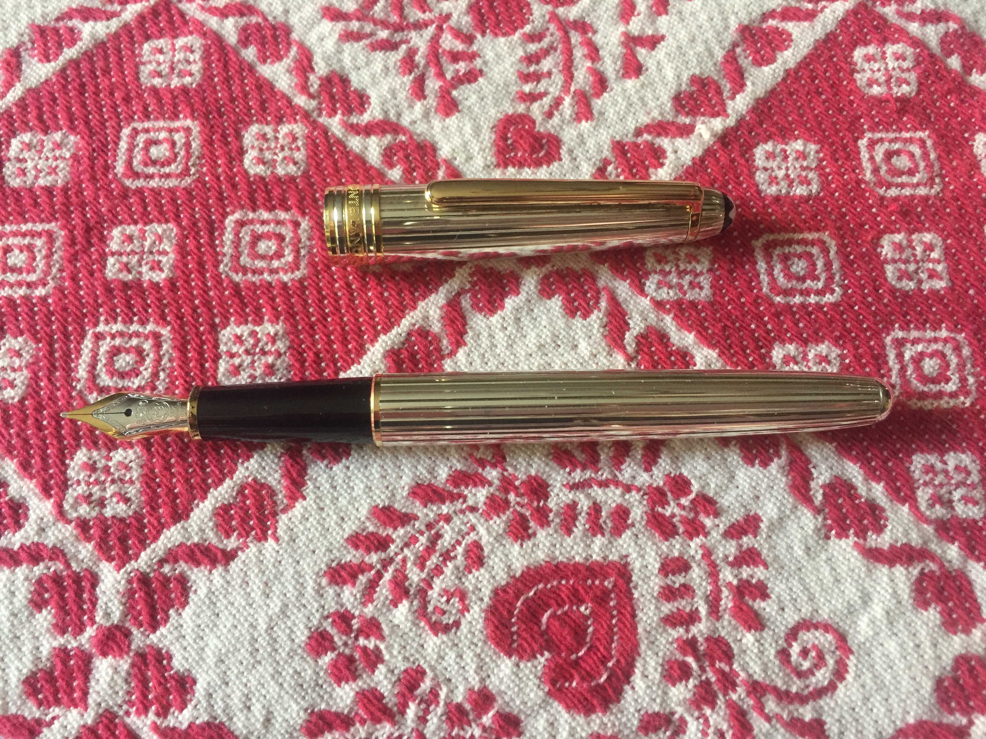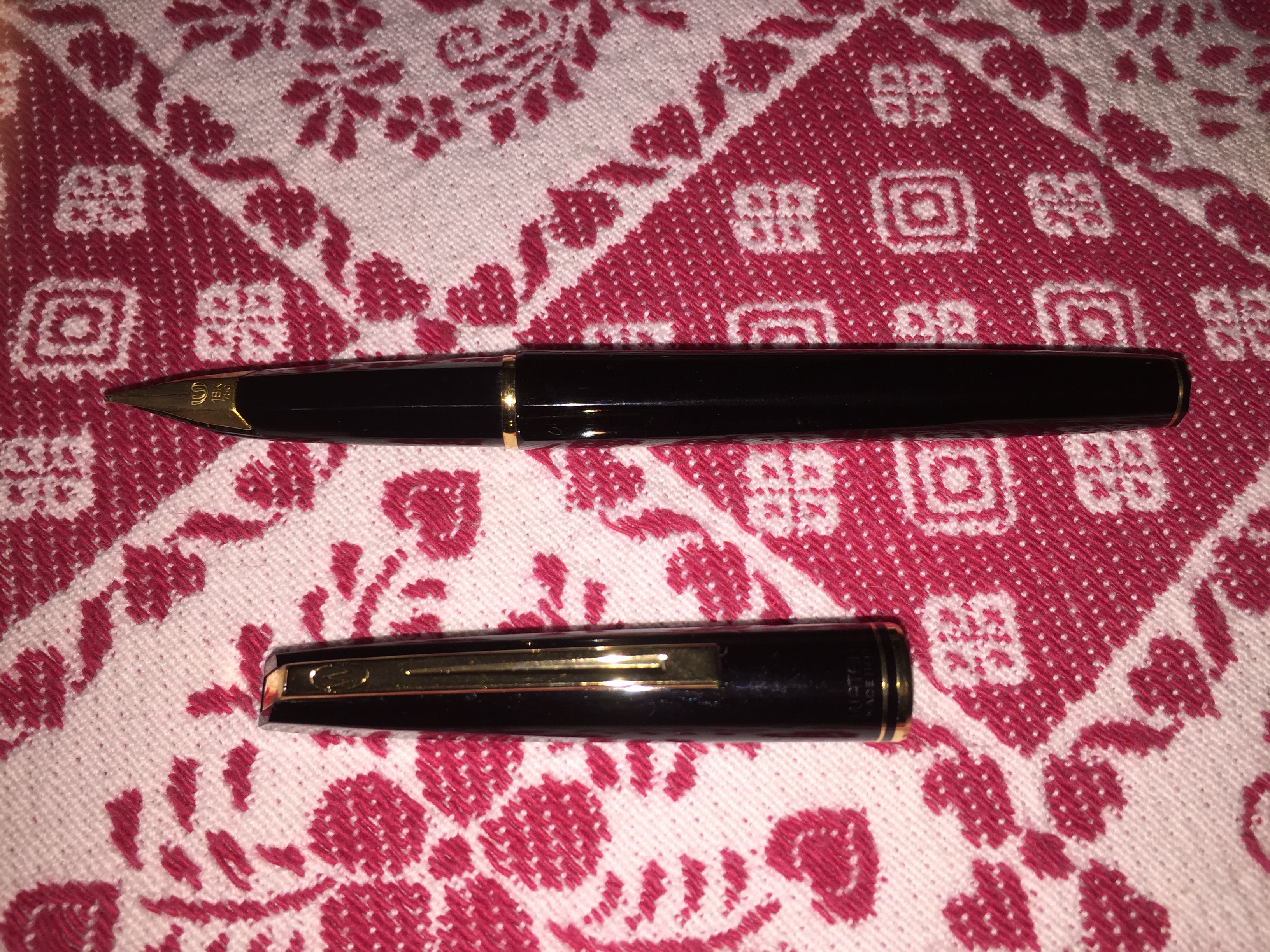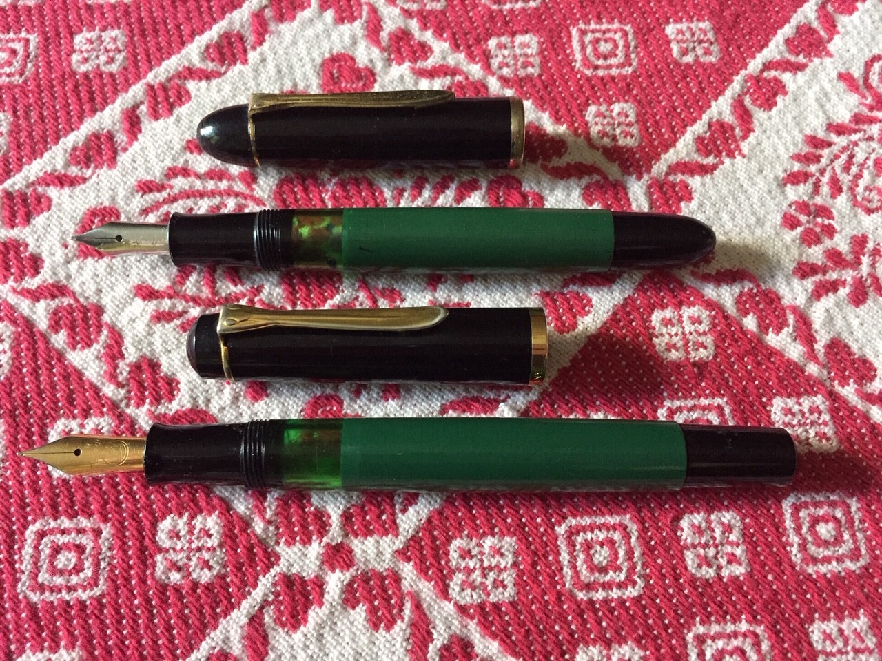 porta penne per 12 posti; flacone inchiostro Lamy turchese; due scatoline in plastica per pezzi di ricambio per penne, marchiati Omas e MontBlanc; base per stiloforo (porta penne singolo), marchiato Soennecken, in pura arte Bahaus, suppongo anni 20/30; Waterman Concord, nuova nella sua confezione originale; Pelikan 120 e 150 in buone condizioni; Penco 53, caricamento funzionante; penna biro per stiloforo Sheaffer; Aurora Ypsilon praticamente mai inchiostrata; una Aurora 88 Slim in ottimo stato, cappuccio in argento, caricamento cartuccia/converter; ed infine una MontBlanc 144 Solitaire in argento, usata, in buono stato con la dicitura Made in W. Germany. Successivamente una nuova ricerca ha fruttato: tre stilofori Omas Extra con pennino in oro 585 marchiato Omas in ottime condizioni; Pelikan M400 con scatola ed inchiostro mai usata, databile anni 80; Pelikan 120 e M150 in discrete condizioni. Ecco le foto di rito.