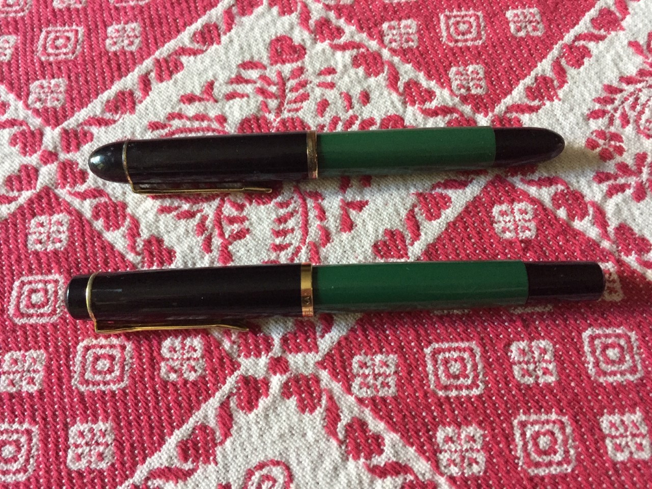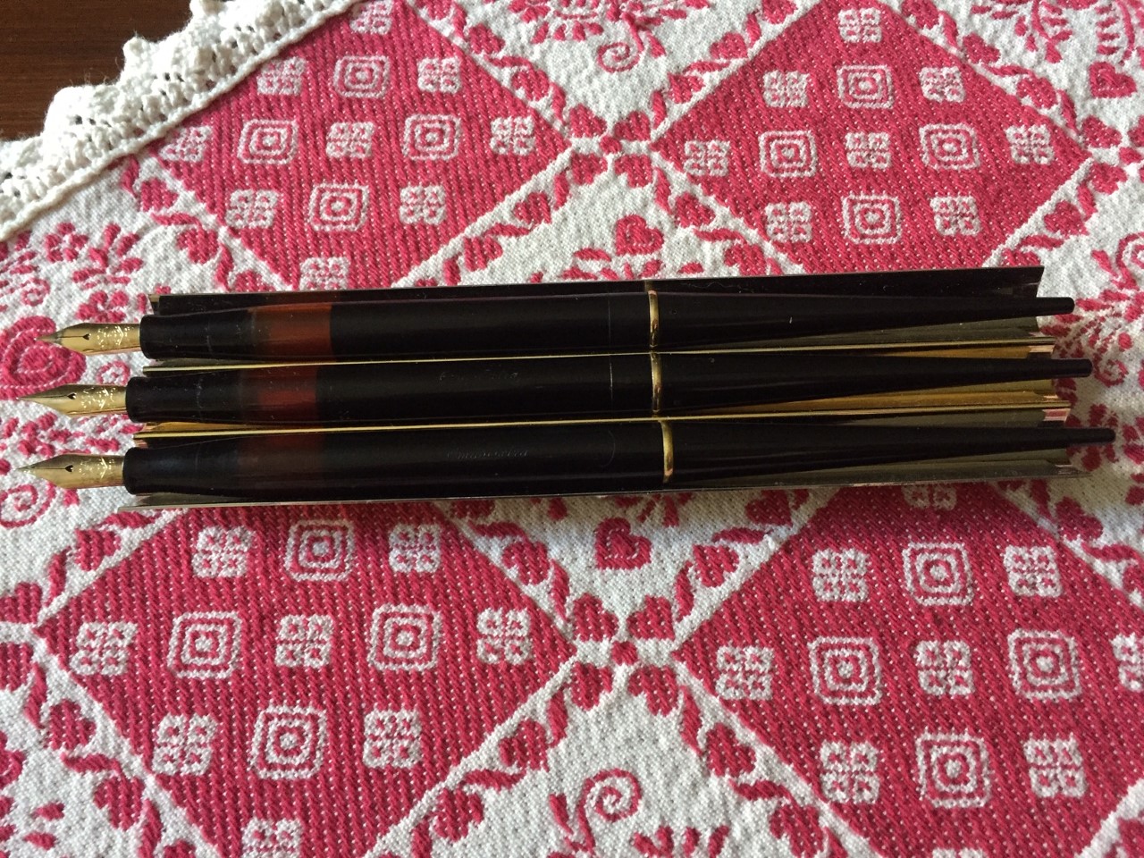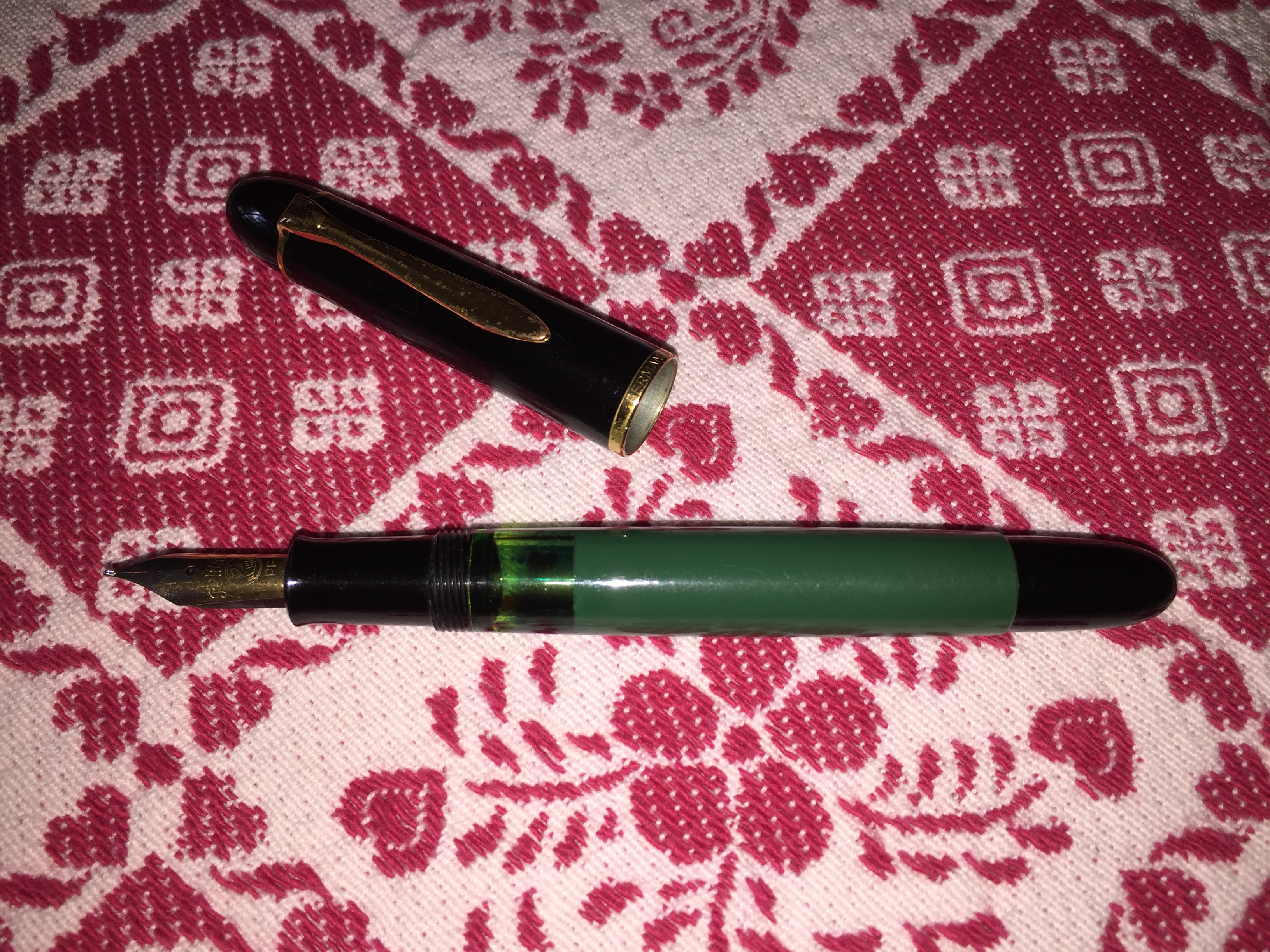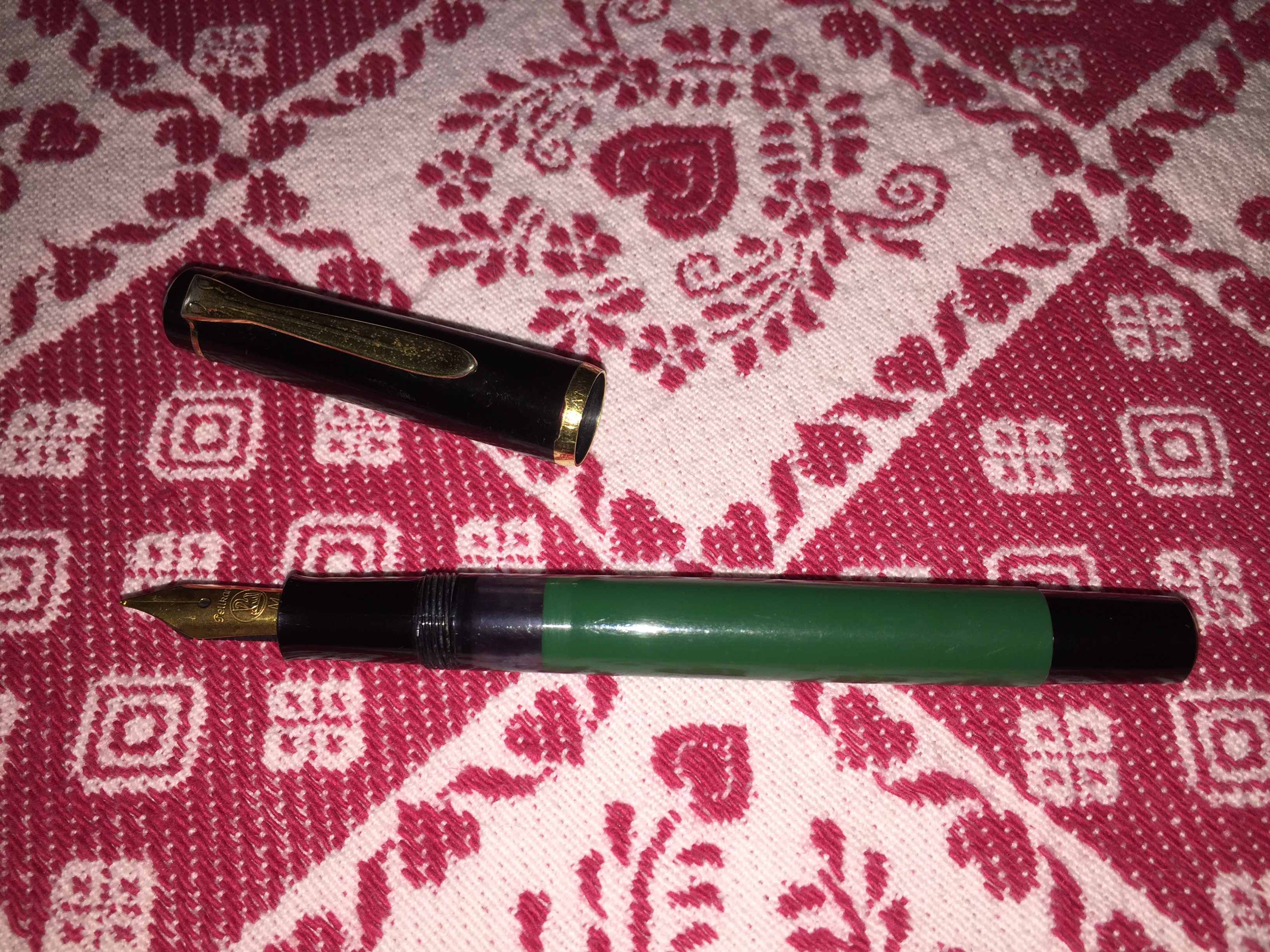 porta penne per 12 posti; flacone inchiostro Lamy turchese; due scatoline in plastica per pezzi di ricambio per penne, marchiati Omas e MontBlanc; base per stiloforo (porta penne singolo), marchiato Soennecken, in pura arte Bahaus, suppongo anni 20/30; Waterman Concord, nuova nella sua confezione originale; Pelikan 120 e 150 in buone condizioni; Penco 53, caricamento funzionante; penna biro per stiloforo Sheaffer; Aurora Ypsilon praticamente mai inchiostrata; una Aurora 88 Slim in ottimo stato, cappuccio in argento, caricamento cartuccia/converter; ed infine una MontBlanc 144 Solitaire in argento, usata, in buono stato con la dicitura Made in W. Germany. Successivamente una nuova ricerca ha fruttato: tre stilofori Omas Extra con pennino in oro 585 marchiato Omas in ottime condizioni; Pelikan M400 con scatola ed inchiostro mai usata, databile anni 80; Pelikan 120 e M150 in discrete condizioni. Ecco le foto di rito.