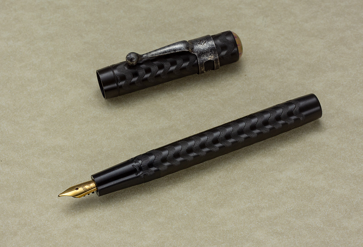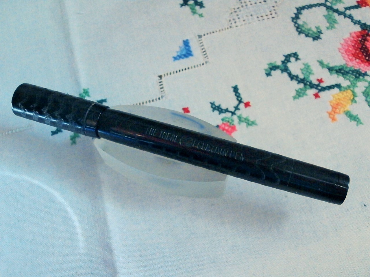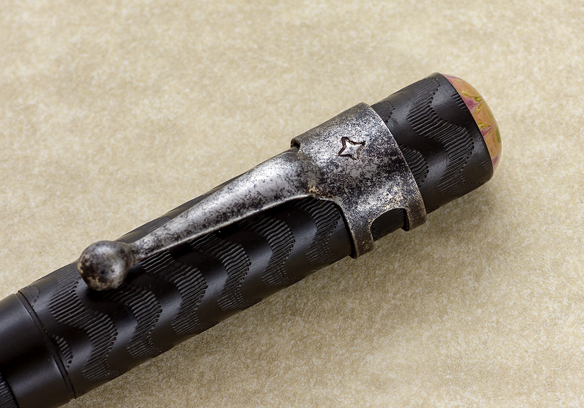 Il corpo della penna, il materiale dovrebbe essere in ebanite, e il cappuccio (ha un incastro a frizione) riportano incisi dei disegni che nuovamente farebbero pensare ad una Waterman.