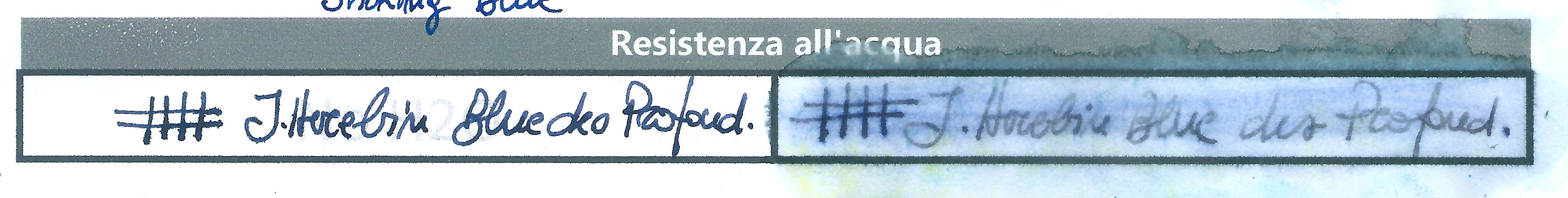 Non sono molto fan dei blu neri, però ho preso una confezione di cartucce di questo Bleu de Profondeurs, e non mi dispiace. Sulla penna in cui lo ho caricato, su alcune carte più porose spiuma un pochino, ma niente di drammatico. È un colore serio, credo che come blu nero sia valido, ma non sono avvezzo a questa tonalità. Se però la curiosità si può appagare, ben vengano le prove inchiostrate