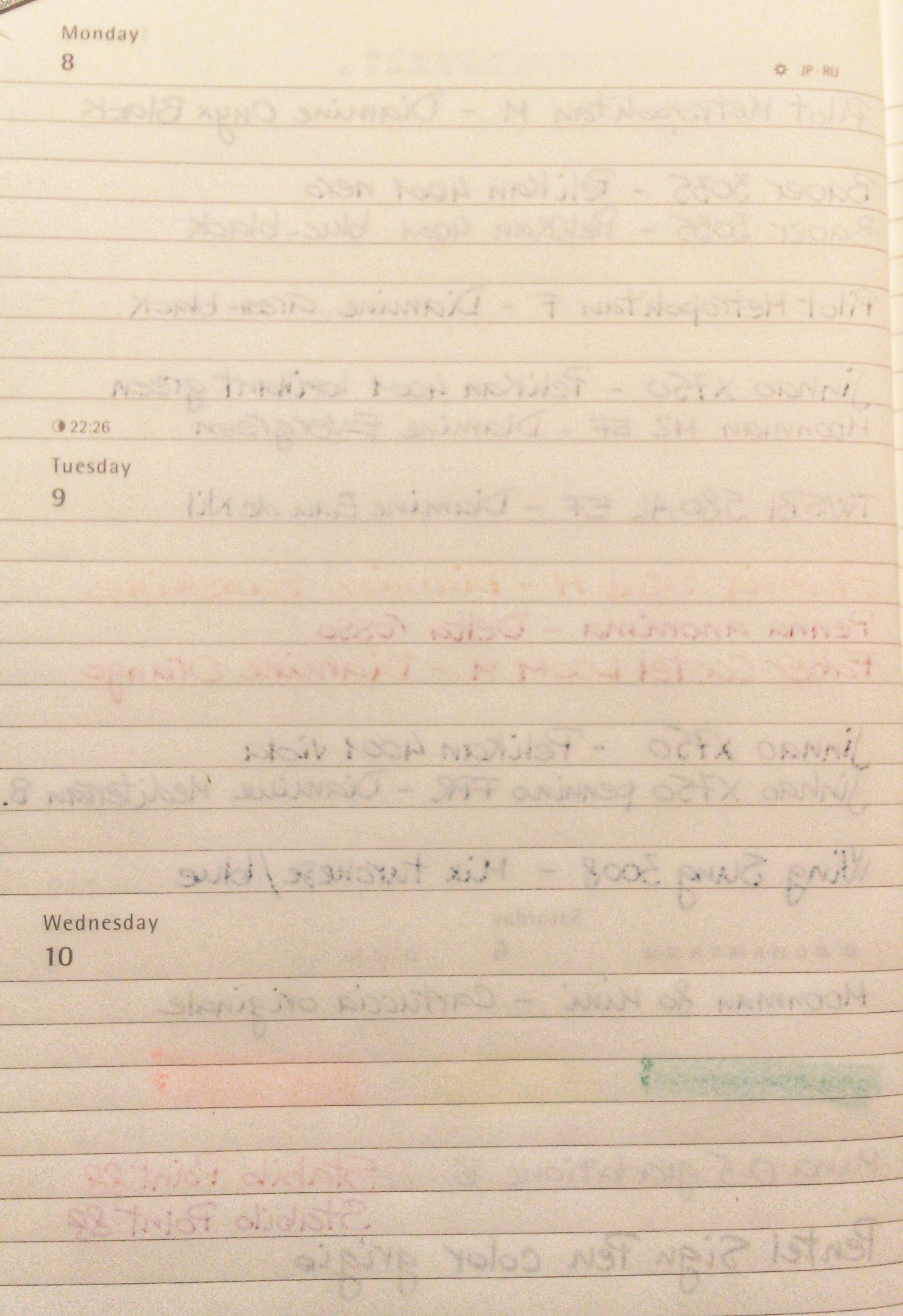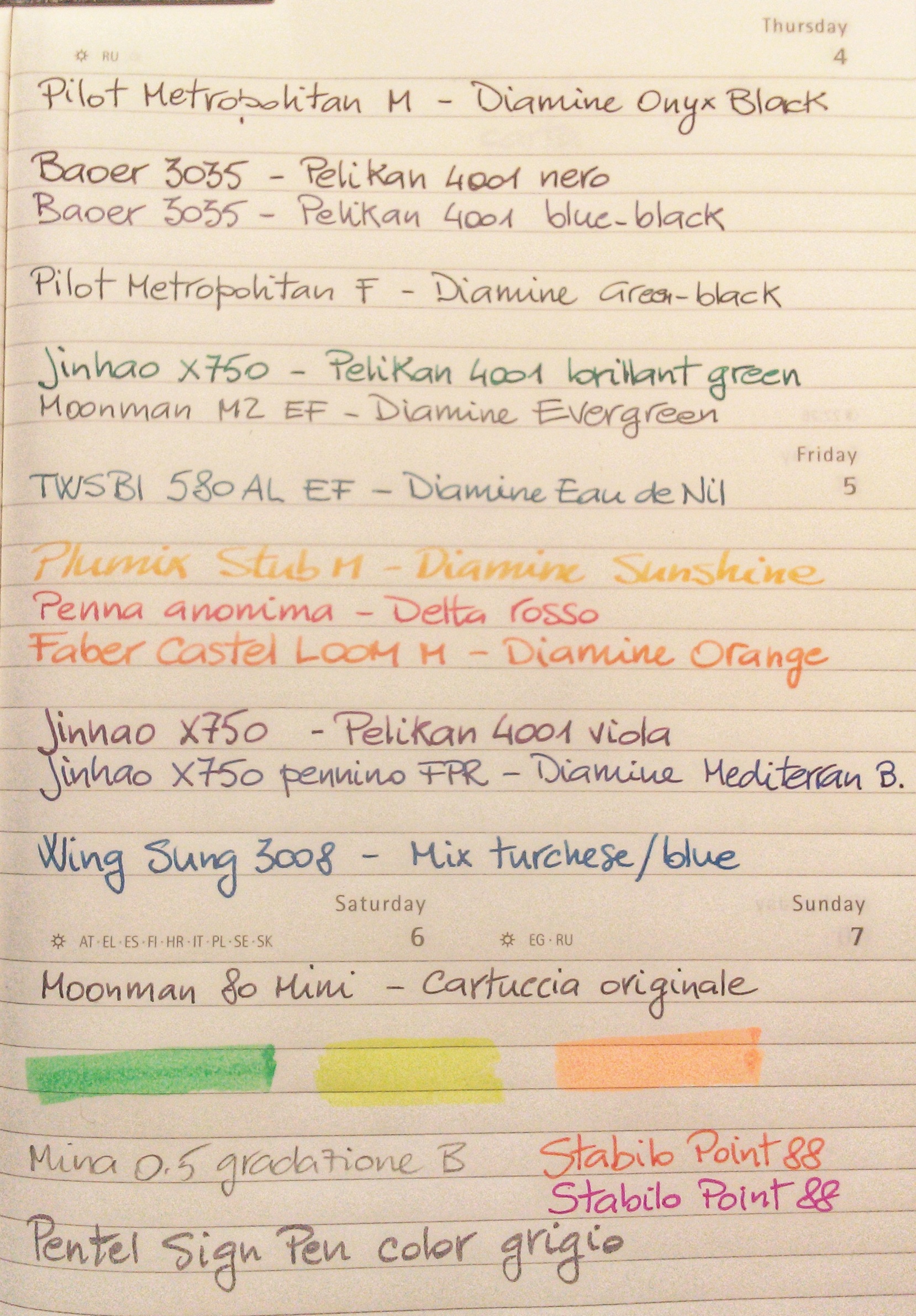 Bando alle ciance, allego due foto (perdonate la pessima qualità ma non ho lo scanner a portata adesso) dimostrative: solo l'ottimo Diamine Onyx Black su Pilot Metropolitan è vagamente utilizzabile, ma non per me che uso nell'agenda un mio sistema di "color coding".