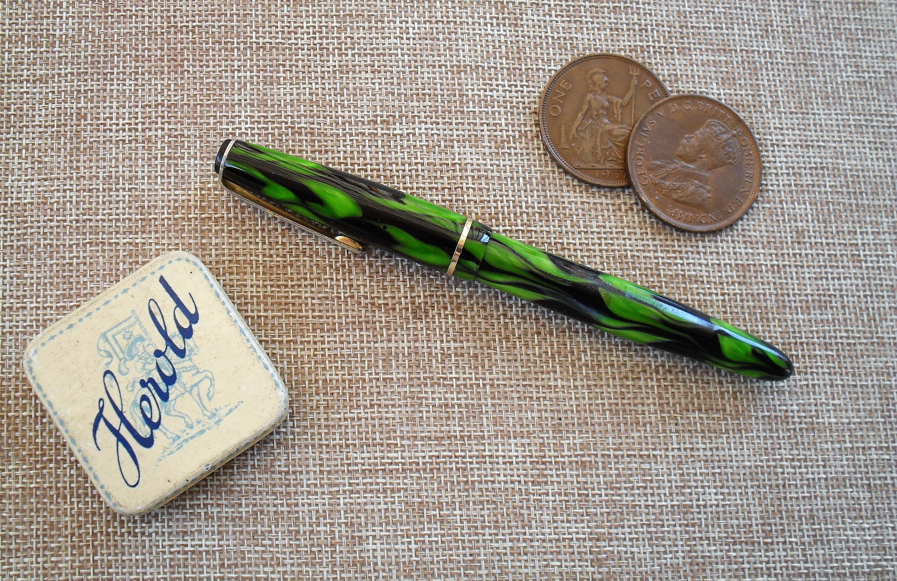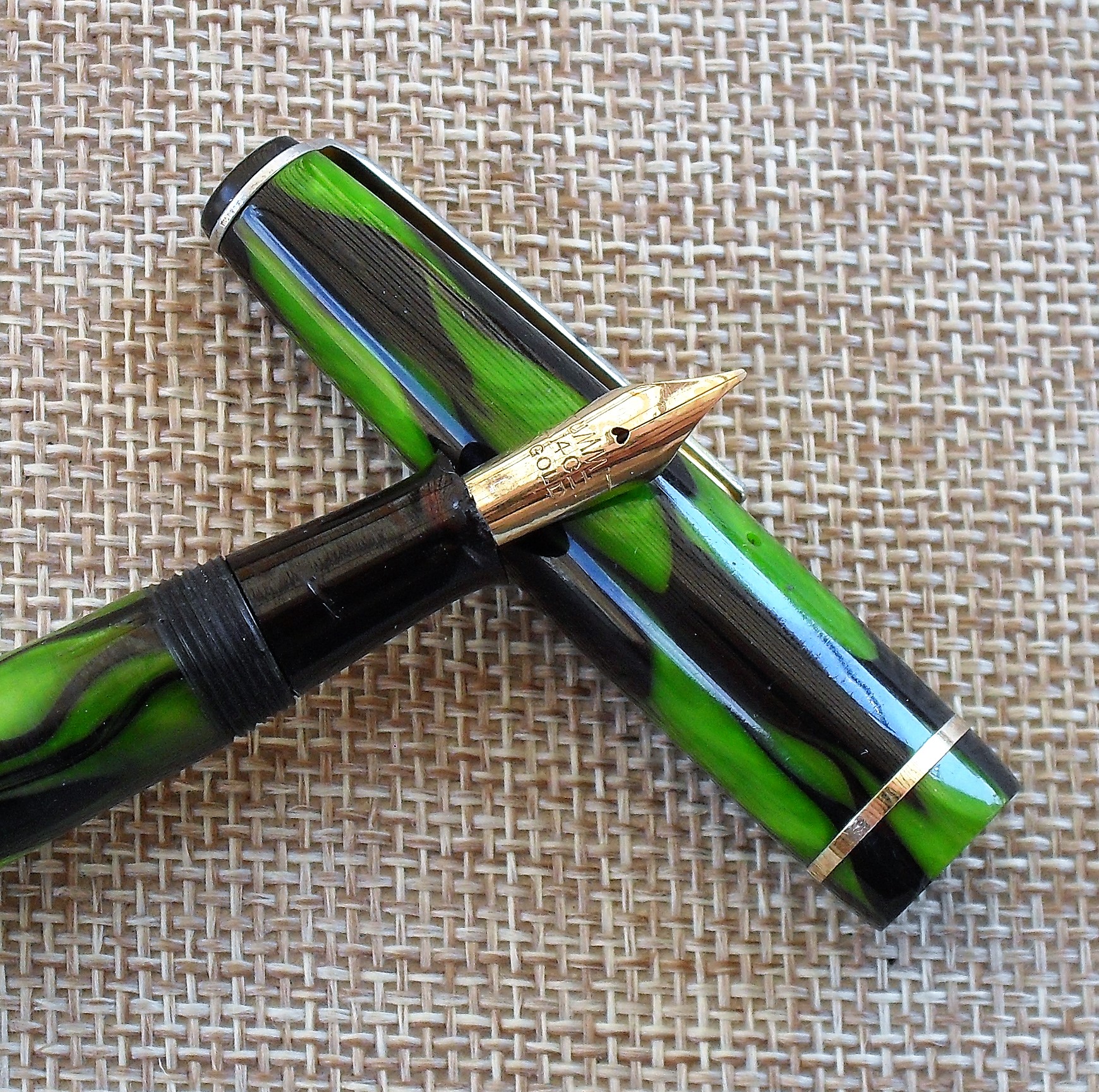 La finitura dell’esemplare che vedete, caratterizzata da una bella celluloide verde fiammata, piuttosto originale, suggerisce che il prodotto fosse pensato per un pubblico giovane, inserito nella tendenza di quegli anni che privilegiava non soltanto il colore ma anche tutto ciò che poteva risultare divertente o accattivante. Chissà se la “fiammatura” fu ispirata dal fenomeno dei dragsters americani, che proprio nel secondo dopoguerra consolidarono la loro popolarità.
