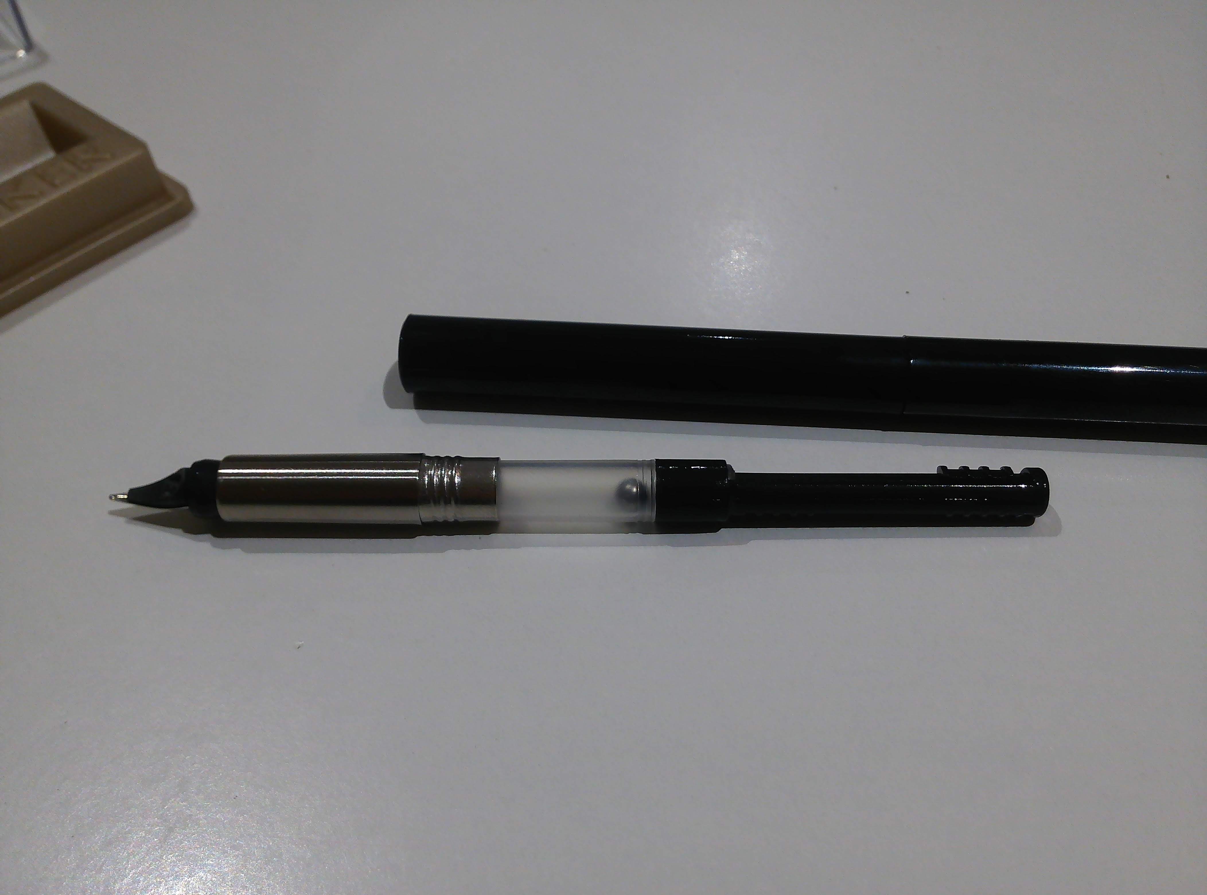 E qui c'è la prima delusione. Davvero. Ero convinto che fosse in metallo, non so perché: forse visto che il prezzo "normale" è intorno ai 20-25 euro, e l'estetica fa pensare a un fusto tutto in alluminio o acciaio. Invece le parti nere (o colorate, negli altri modelli) sono in plastica e, devo dire, neanche rifinita particolarmente bene: nel punto di giunzione tra tappo e fusto, a penna chiusa, lo scalino è netto e avvertibile. Pazienza.