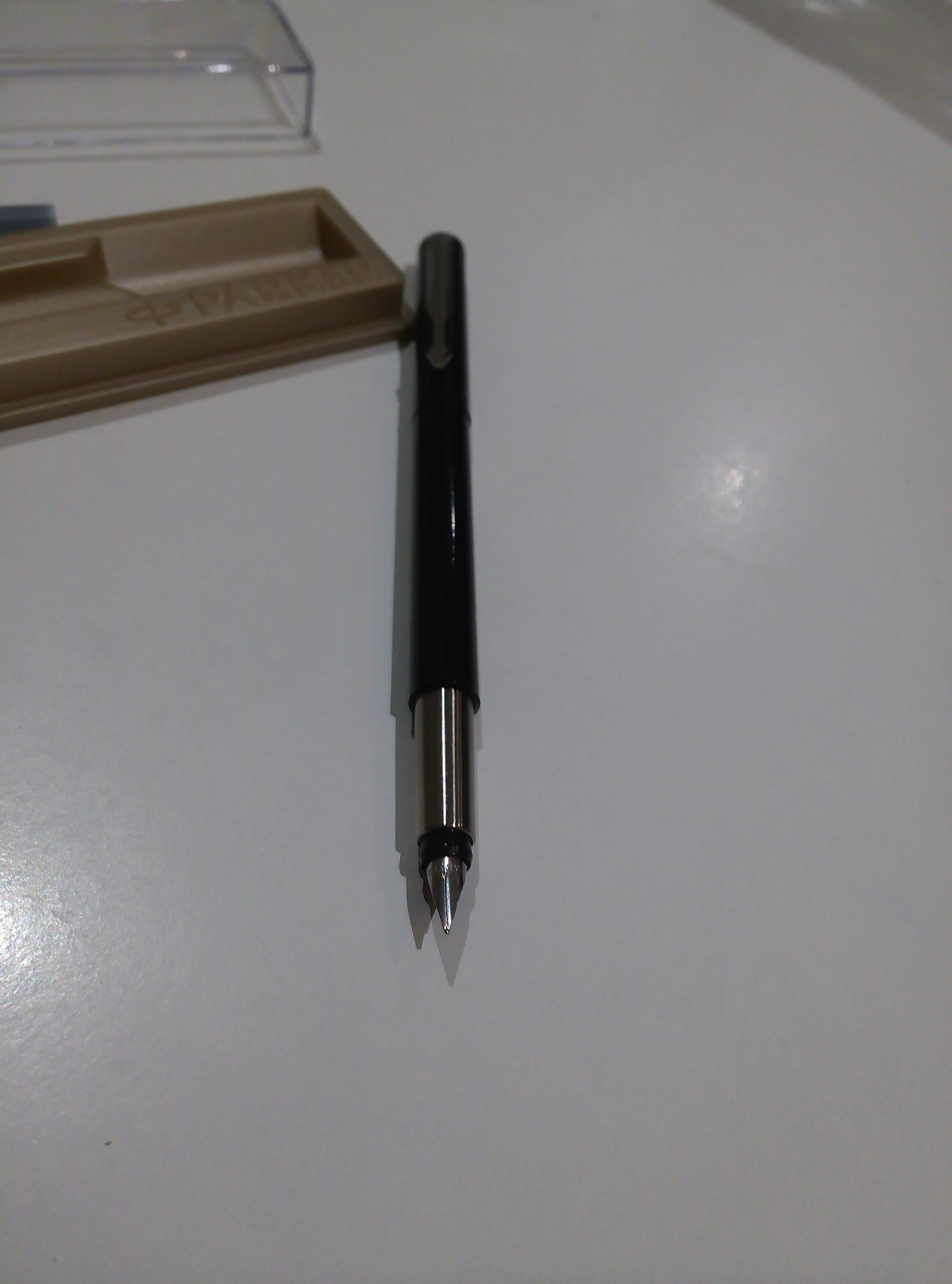Alla fine devo dire che questa Parker non mi ha particolarmente impressionato. Il pennino è rigidissimo e non particolarmente scorrevole. Il flusso è buono, quindi non è questione di "stitichezza", è solo che non scorre bene. E non è neanche questione di allineamento: la prima cosa che ho fatto, infatti, è stato guardare lo stato della punta del pennino con la mia lente 30x comprata all'uopo: i rebbi sono perfettamente allineati. Forse è da rodare un po', chissà. Il bilanciamento è invece buono, anche a cappuccio calzato, aiutato anche dalla leggerezza della penna che - come detto - è in realtà prevalentemente in plastica - ma lo scalino che separa il fusto dalla sezione portapennino è davvero fastidioso perché il punto ideale di impugnatura è proprio a cavallo di quello.
