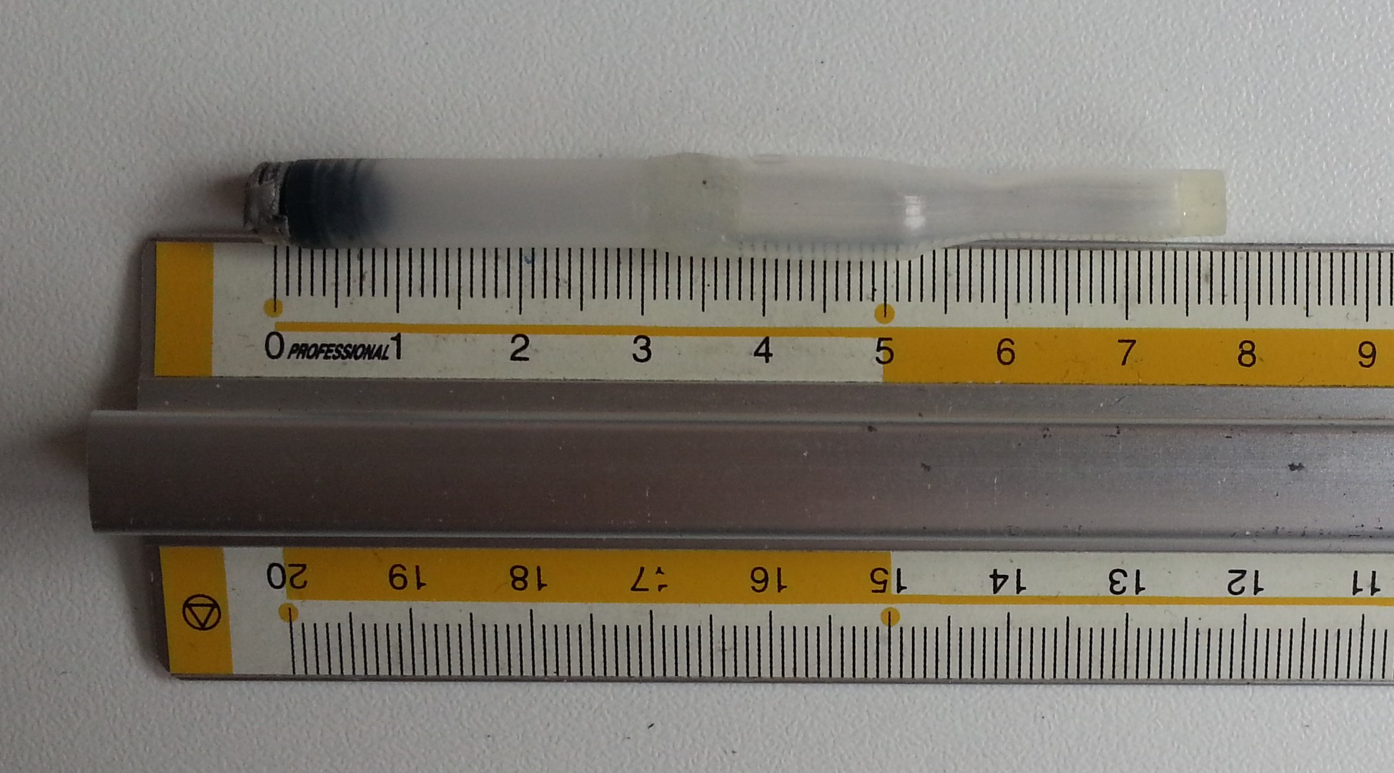 Fatto questo ho rimosso la parte terminale della pipetta appena ristretta perché tende a restringersi dippiù chiudendosi, per poi ottenere 1.7cm di pipetta a sezione costante, di circa 6mm, necessari a farla entrare nel corpo della penna.