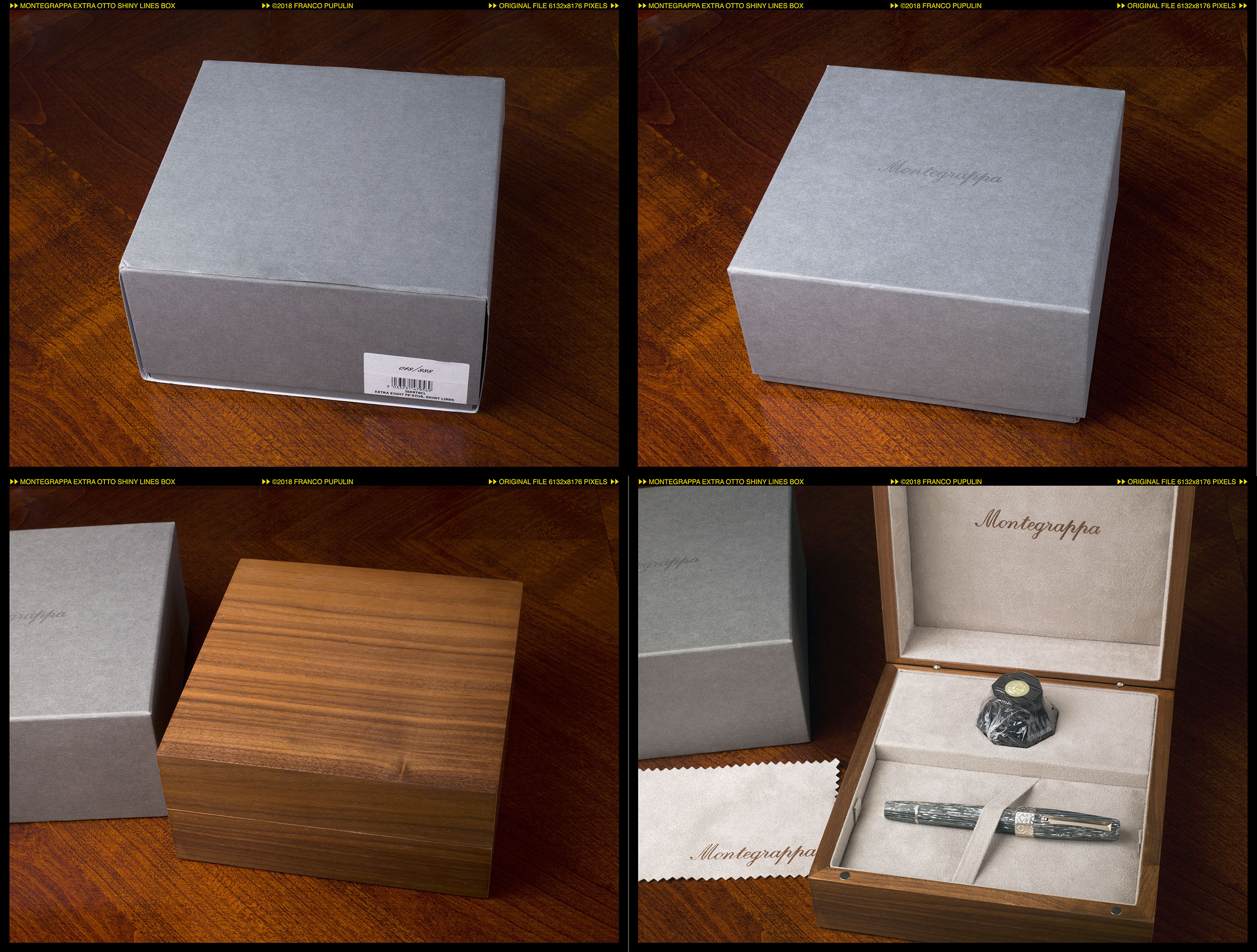 Dentro la scatola di cartone, che reca sul coperchio la scritta “Montegrappa” in colore grigio scuro, si trova la scatola della penna vera e propria. È una scatola in legno massiccio e venato, di un color tabacco chiaro, con unap paio di eleganti cerniere sferiche su un lato. Il coperchio è mantenuto chiuso da un paio di sottili calamite incavate nello spessore del legno in modo da rimanere a livello. la dimensione della scatola è la medesima di quella della Extra 1939, sufficientemente spaziosa per ospitare la penna, una boccetta di inchiostro, il manuale di istruzioni, la garanzia (tipo carta di credito), un piccolo certificato con il numero di limitazione, un panno anti-ossidante per pulire le parti in argento, e un tappetino in pelle scamosciata per appoggiare la penna. con rispetto alla vecchia scatola della Extra 1930, la similpelle che tendeva a sgretolarsi col tempo, è stata sostituita con interiori in scamosciato, probabilmente più durevole e più piacevole al tatto. la penna stessa è contenuta in una bustina in plastica trasparente con il logo di Montegrappa (che ho rimosso per scattare la fotografia).
