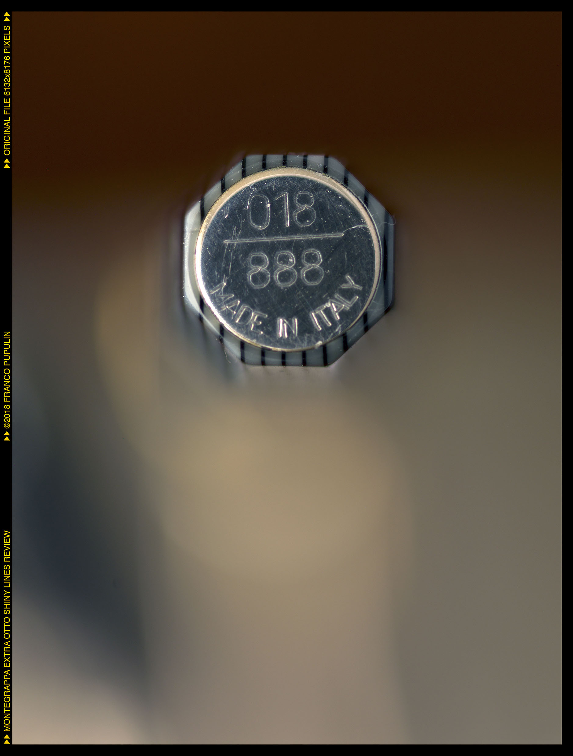 L’anello esagonale in argento massiccio del cappuccio è un piccolo capolavoro. In questo modello Montegrappa ha sostituito il classico motivo della greca palladiana con il suo nuovo motivo chiamato “filigree”, basato anch’esso sul motivo ottagonale. Le aree incise, finemente zigrinate, creano uno straordinario contrasto di luce con le aree a filo, conferendo all’anello una grande tridimensionalità e moltiplicando il suo effetto riflettente della luce. Unito alla eleganza della celluloide, l’anello ottagonale dà a Montegrappa Otto un aspetto molto raffinato, in una configurazione che definirei come una penna “da sera”.