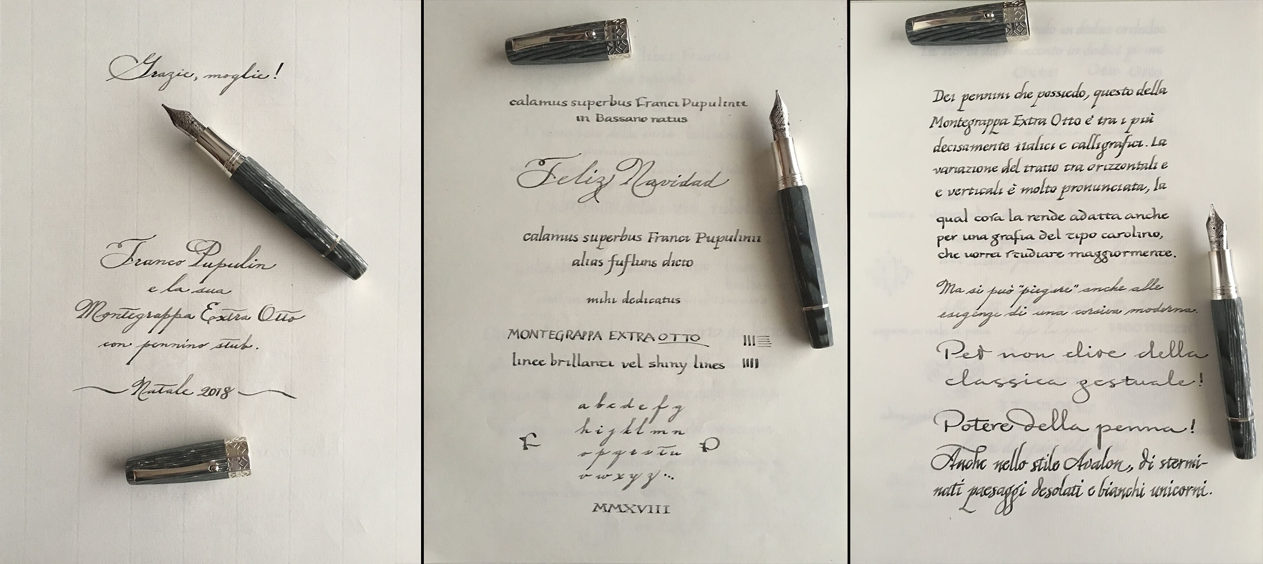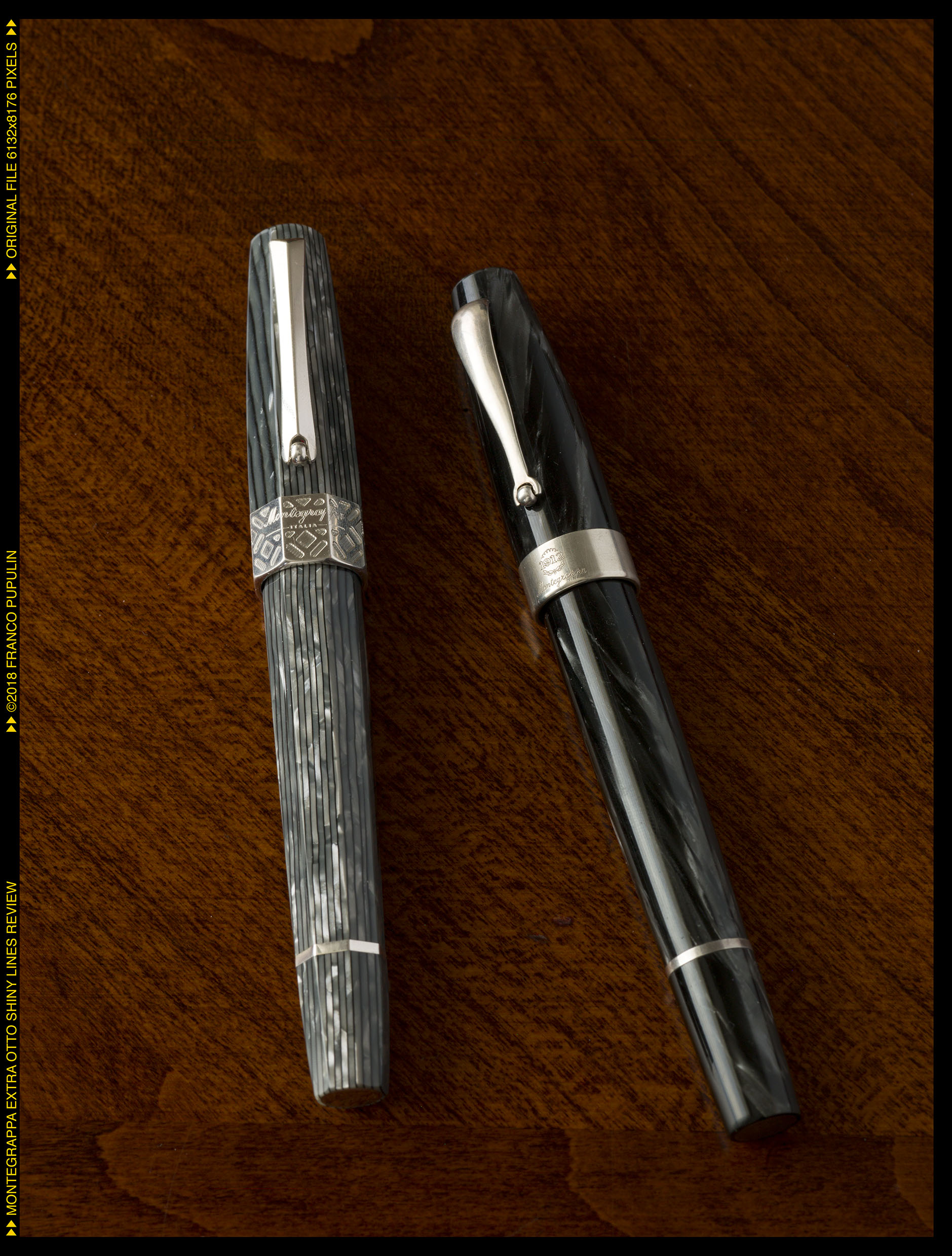 Extra Otto fu inizialmente offerta in due soli tipi di celluloide, entrambe in sfumature di neri, grigi e bianchi: Zebra, con un motivo di linee irregolari trasversali al corpo della penna, e Linee Brillanti, con un intricato disegno di linee parallele al fusto, in qualche modo simile alle famosa celluloide Arco di Omas. Nel corso di quest’ultimo anno, Montegrappa ha aggiunto alla linea Otto due ulteriori celluloidi, Lapis (ruggine e blu) e un blu iridescente chiamato Butterfly.