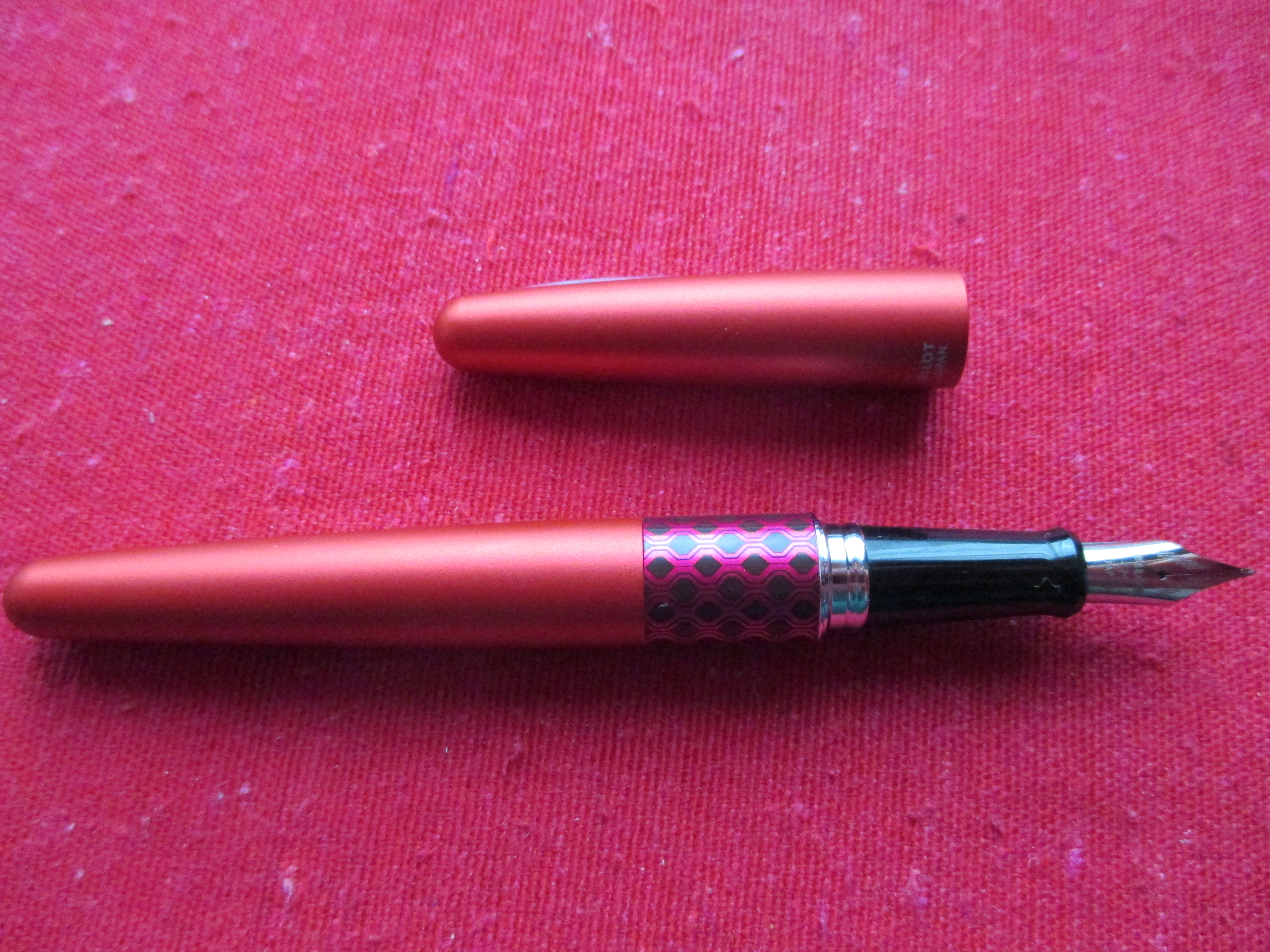 Comprata giusto un mesetto fa nella colorazione viola: il pennino è leggermente più fine dell' F Lamy, ma molto scorrevole dopo qualche pagina di rodaggio. Utilizza cartucce con attacco standard (io uso le Waterman lunghe) ed è, a mio parere, piacevolmente robusta.